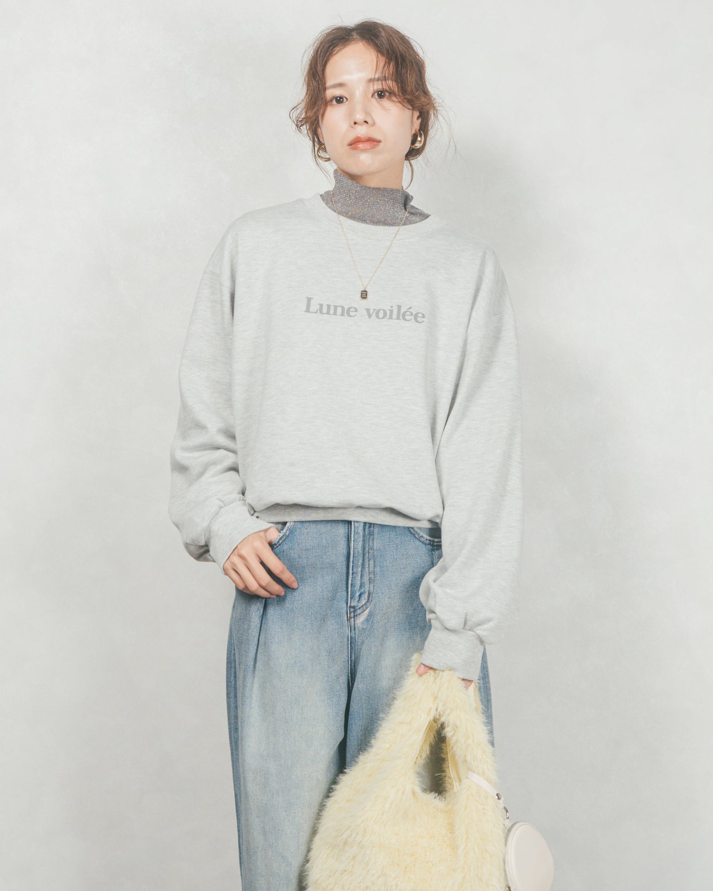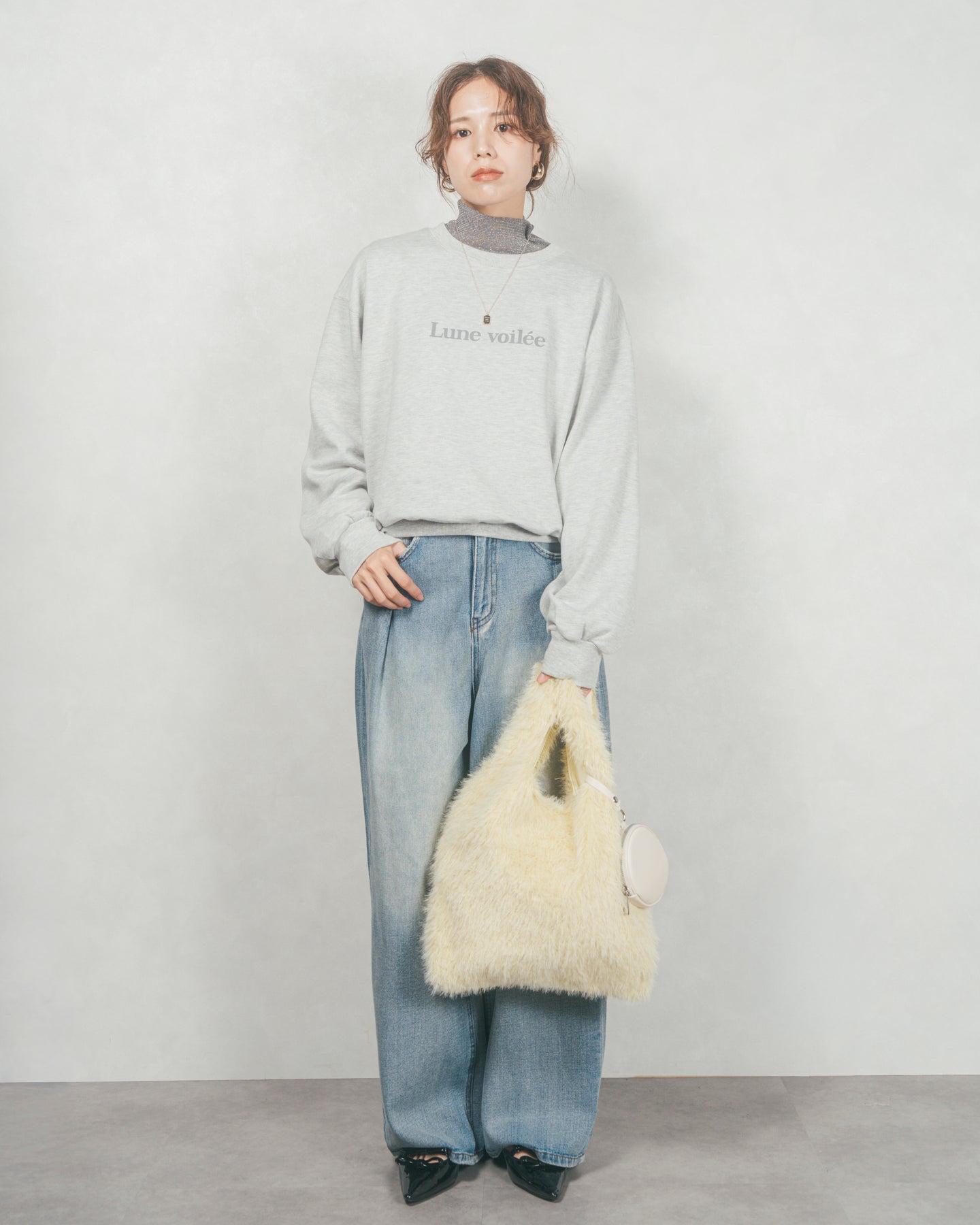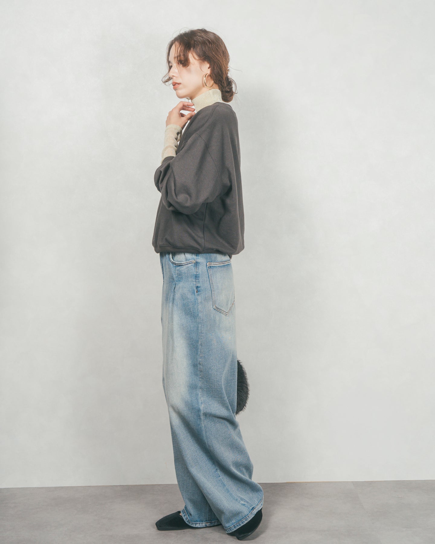 [SET]フロントシリコンLogoスウェット+ラメSheerハイネックトップス+ワイドTuckイージーデニム