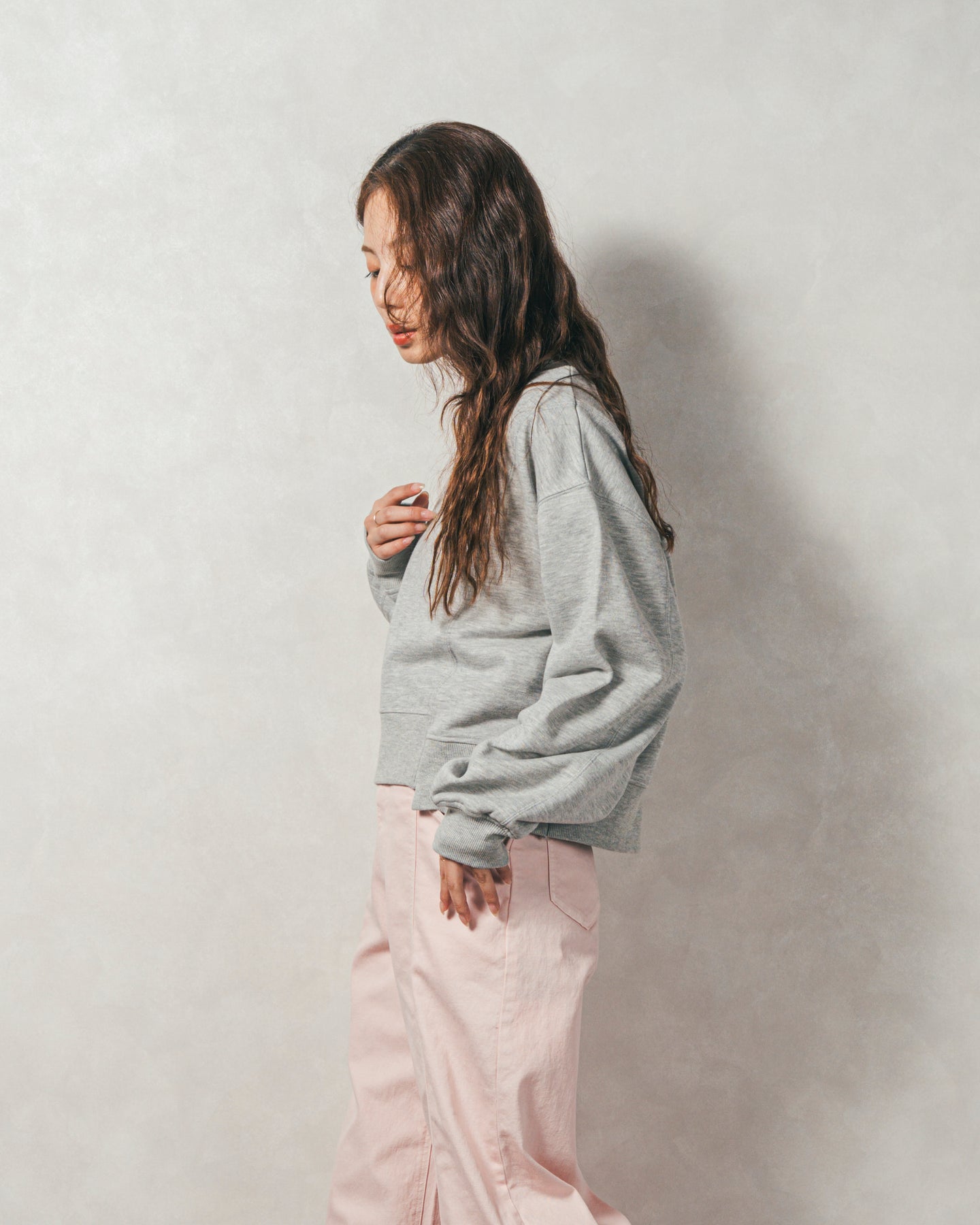 トレンド感のあるショート丈と、たぷんとしたボリューム袖のコントラストが可愛い一枚。 切り替え部分には、ボディカラーと微配色のステッチが効いています。このステッチワークが、無地でものっぺり見せない立体的なアクセントになり、さりげない遊び心をプラス。