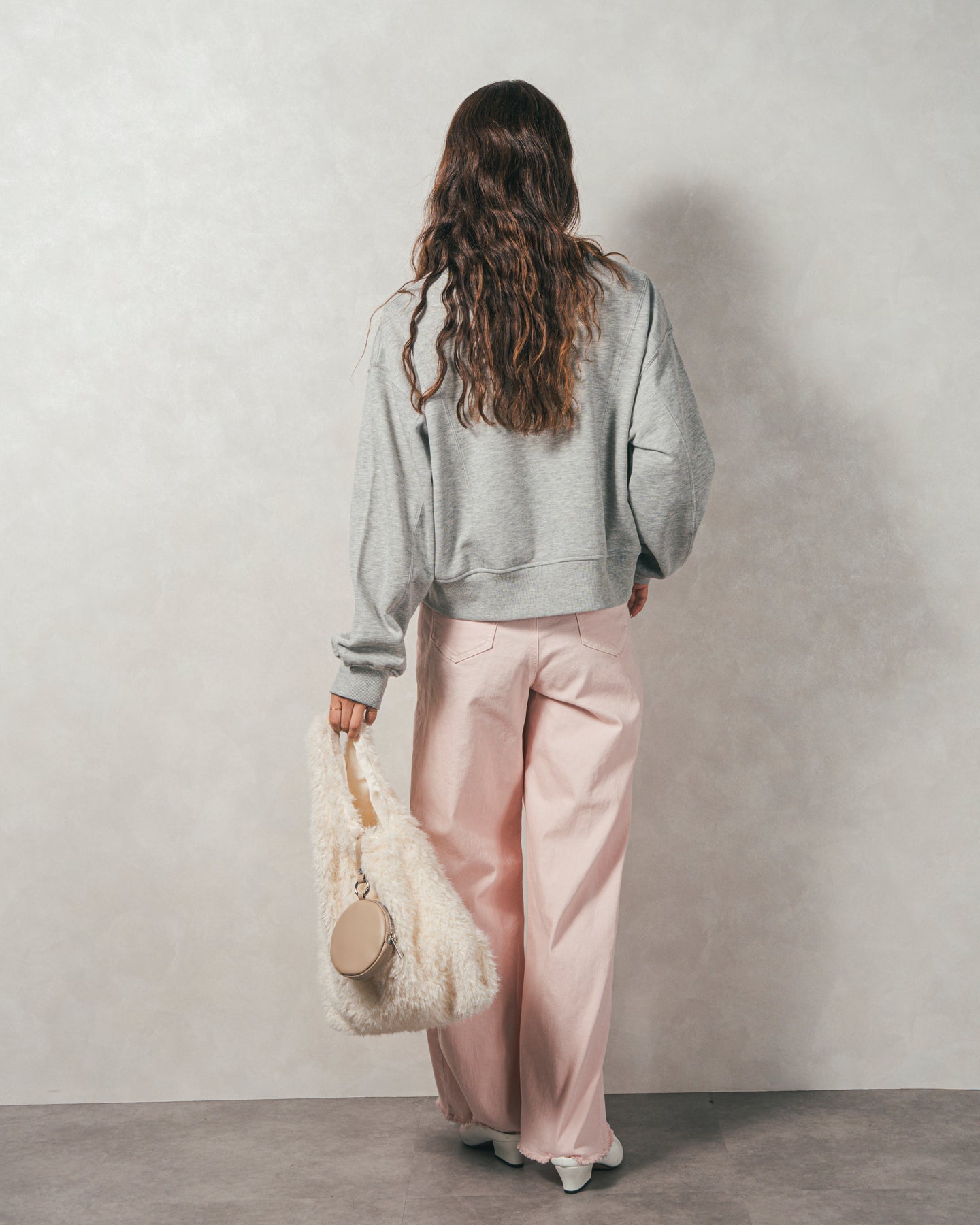 一見ベーシックな裏毛素材ですが、実は中糸に「ラメ糸」を忍ばせた、こだわりの生地を使用しています。 動くたびに内側から煌めくような、ナチュラルで上品な光沢感が魅力。