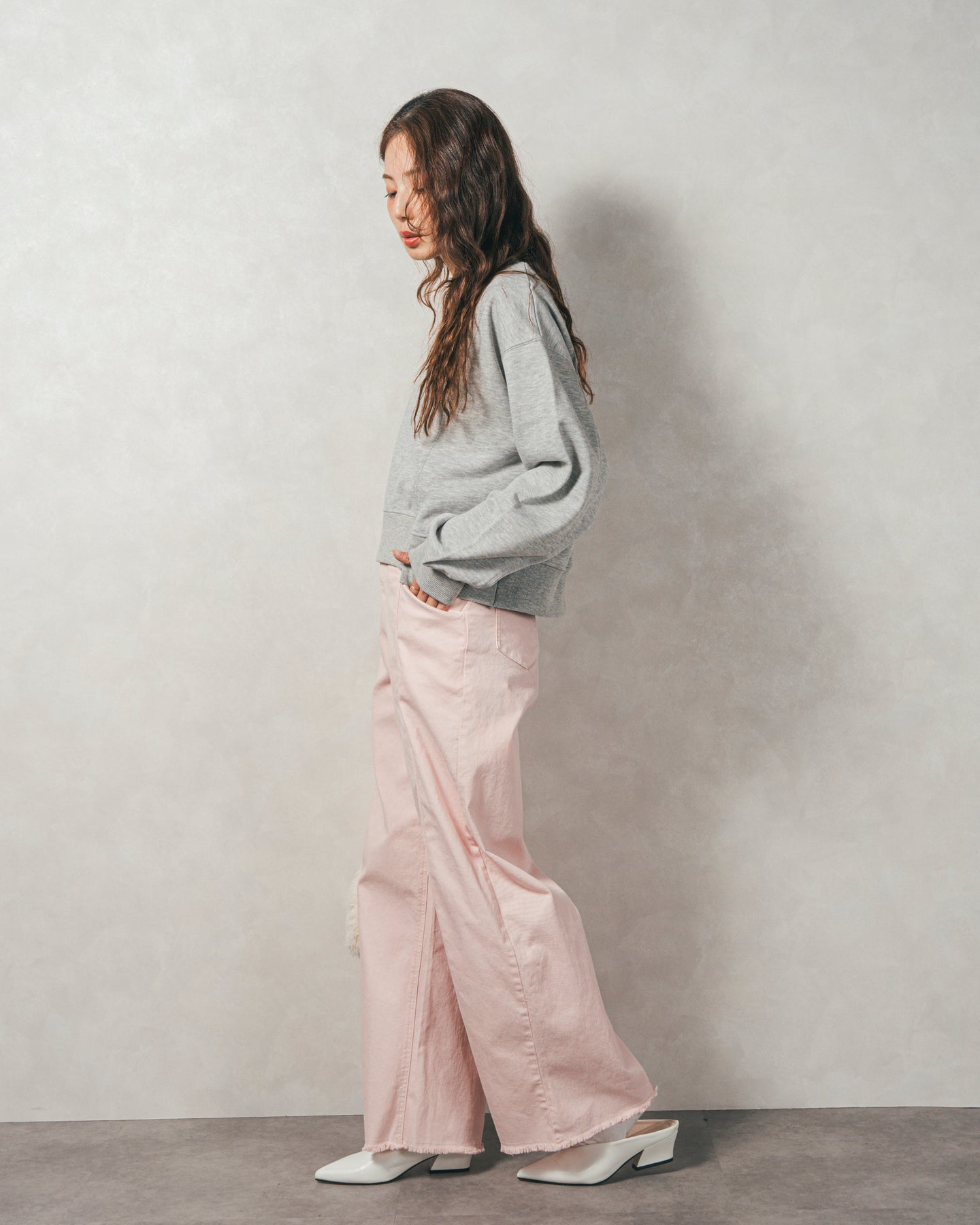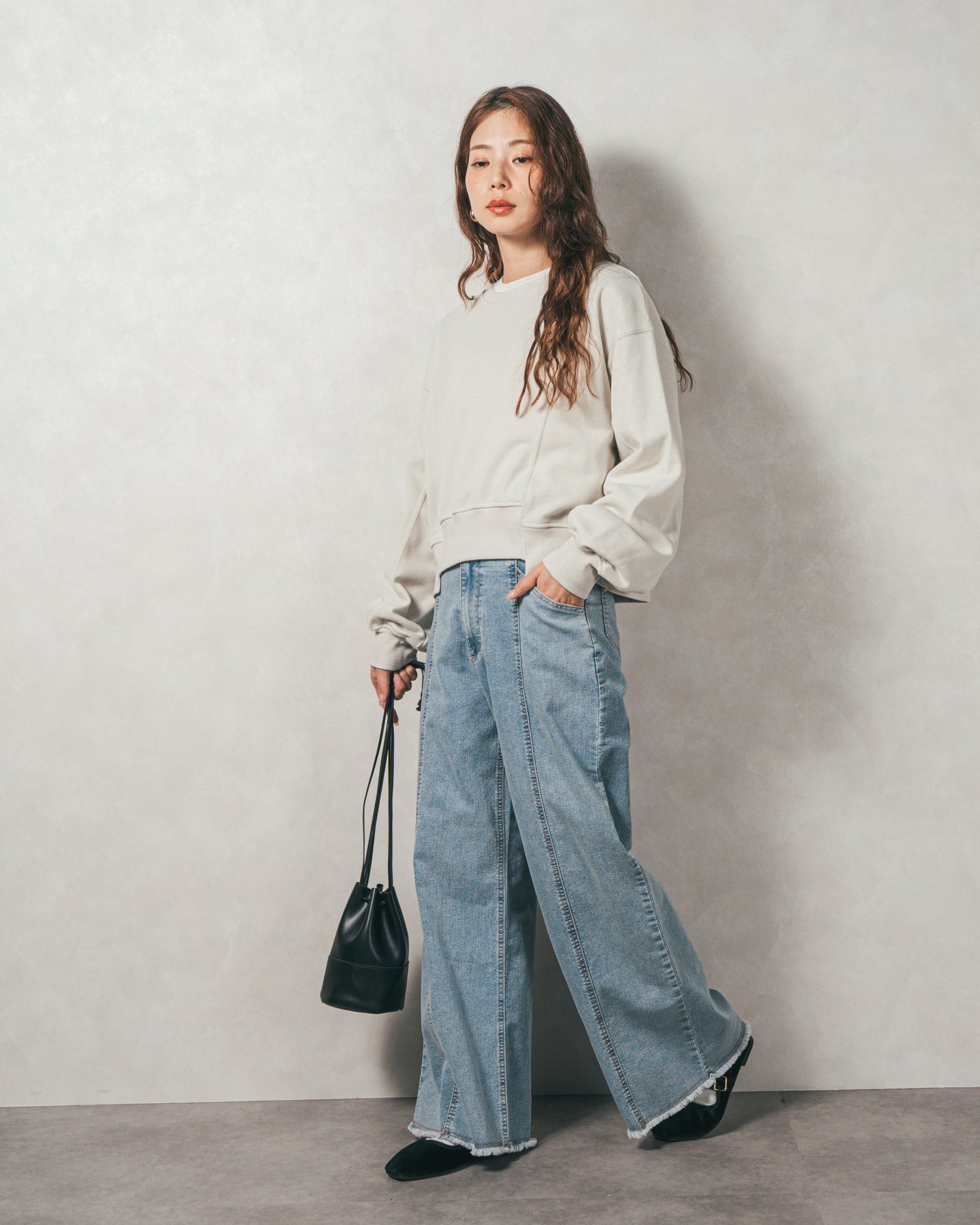 ハイウエストのシルエットはウエストまわりをスッキリと見せ、トレンドムードを作ってくれます。フロント中心にステッチを入れ、Iラインを強調することでスタイルアップを実現◎カットオフで仕上げたウエストがこなれ感をプラスします。