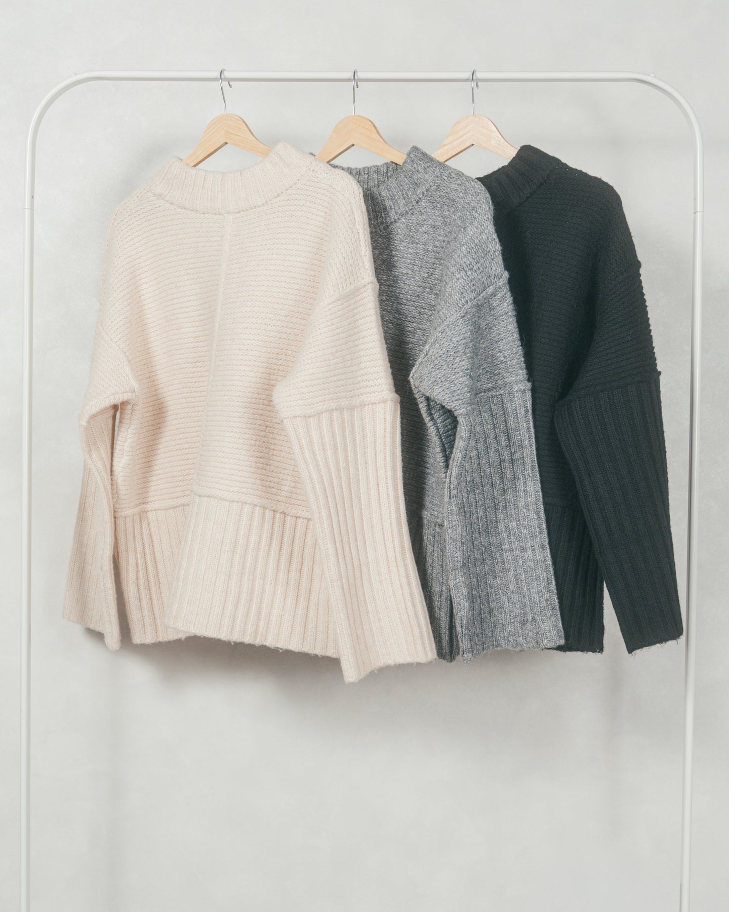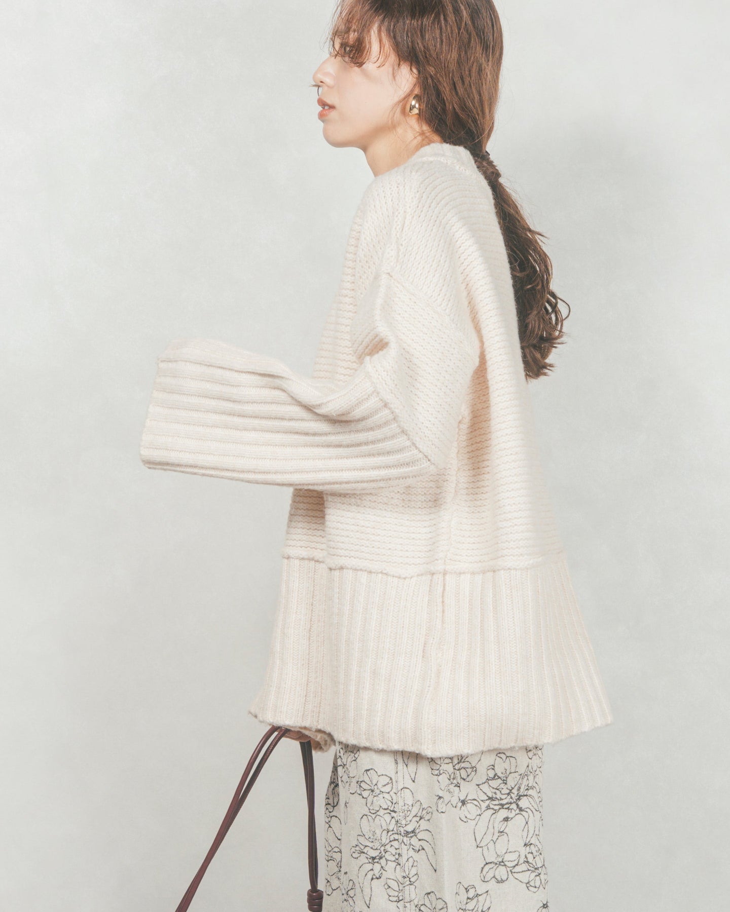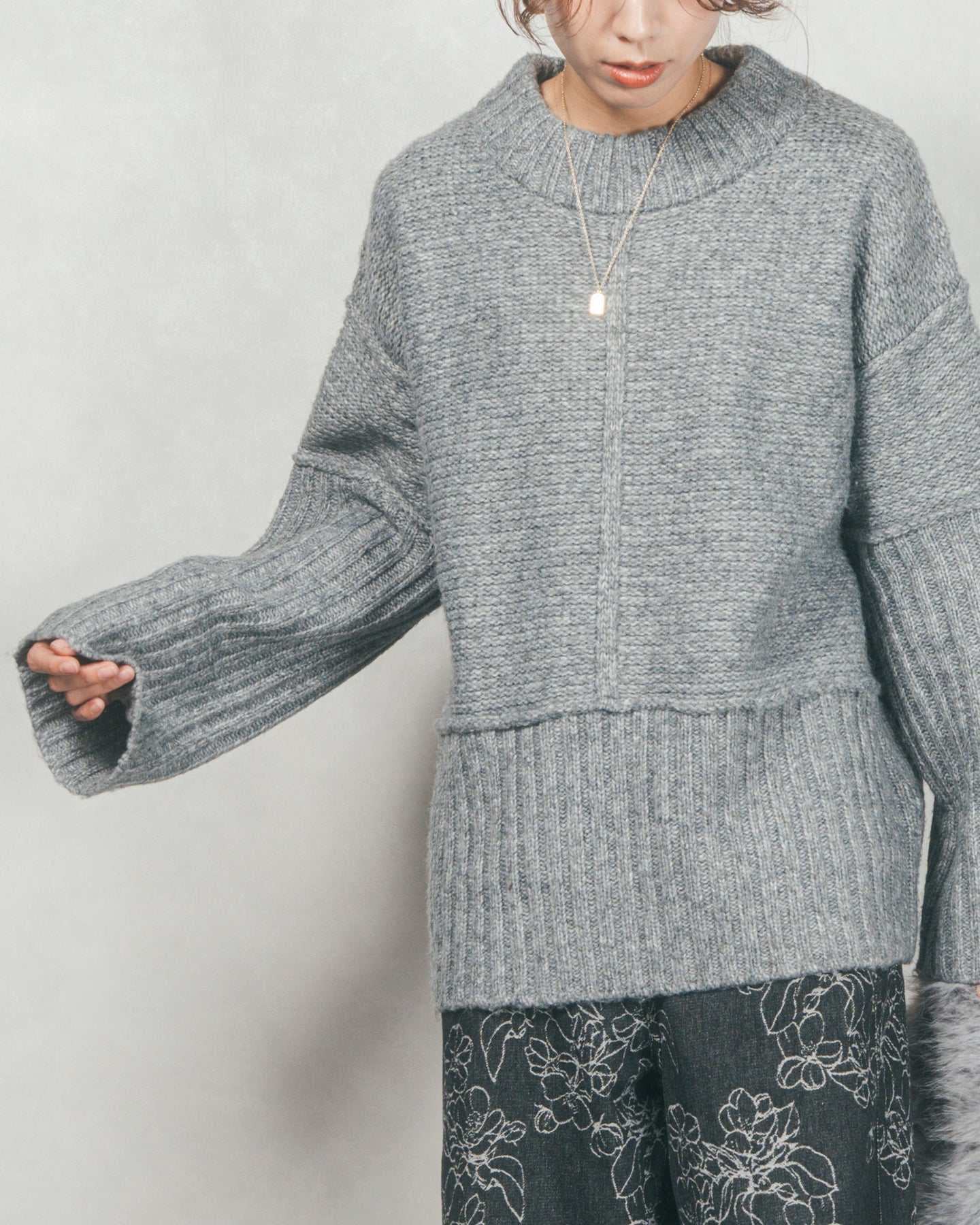 袖と裾にあしらった大胆なリブ切り替えが目を引く、クルーネックニットが登場。ゆるっとしたシルエットにざっくりとした編地が絶妙な抜け感を生み出し、肩の力を抜いた大人のカジュアルスタイルを演出します。