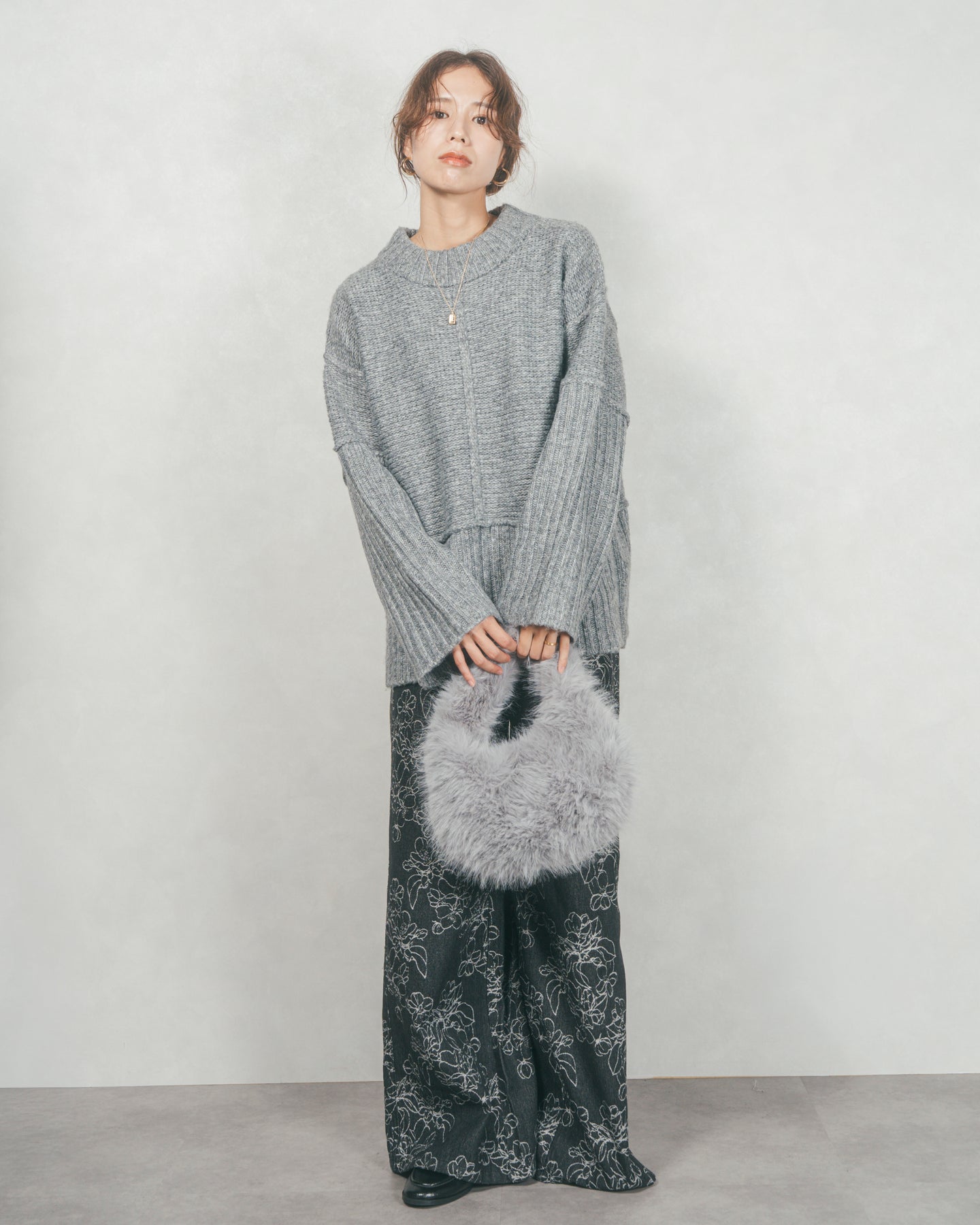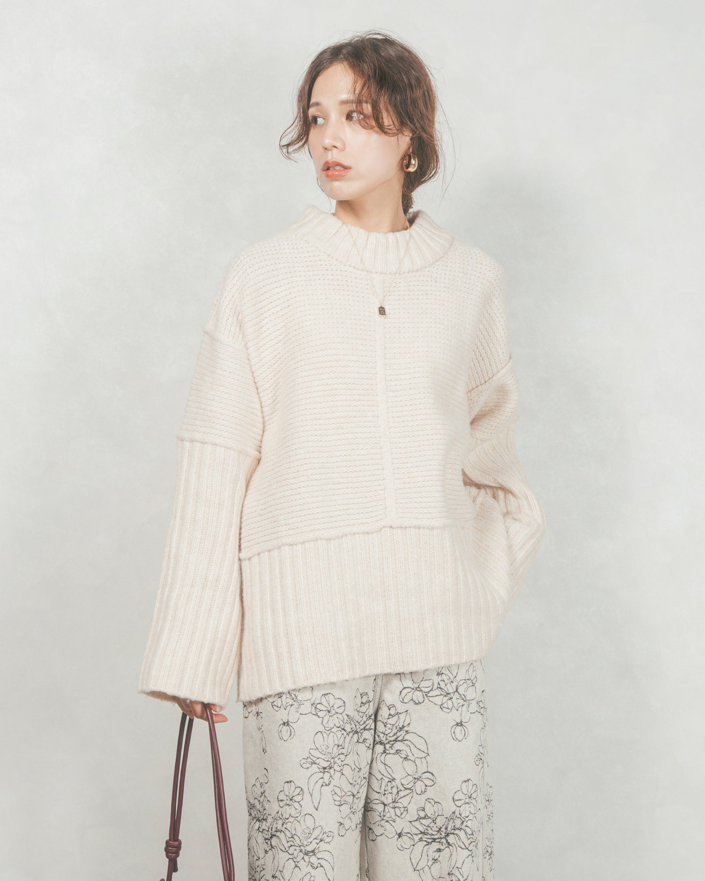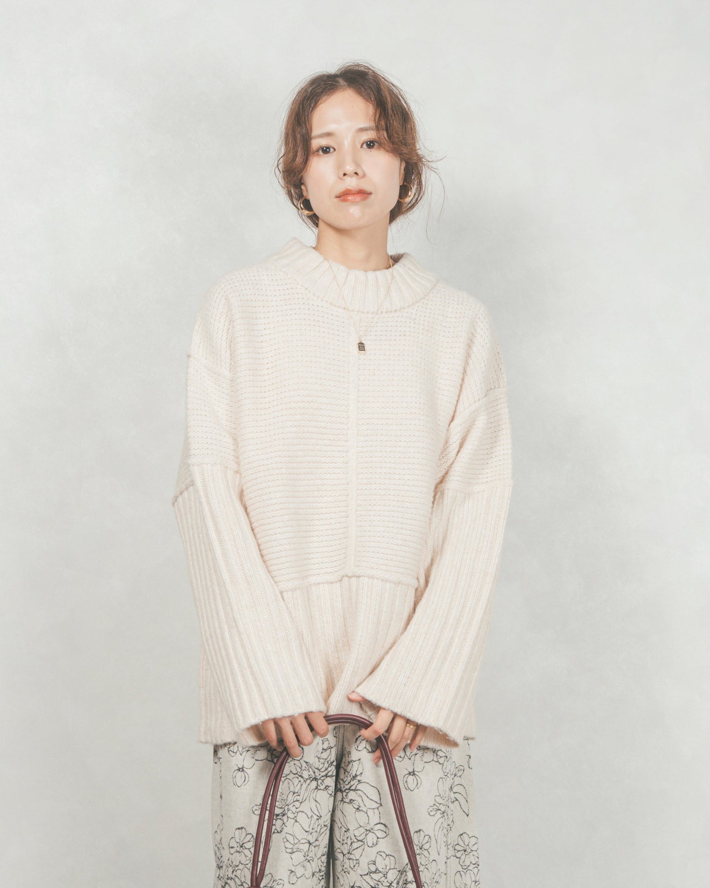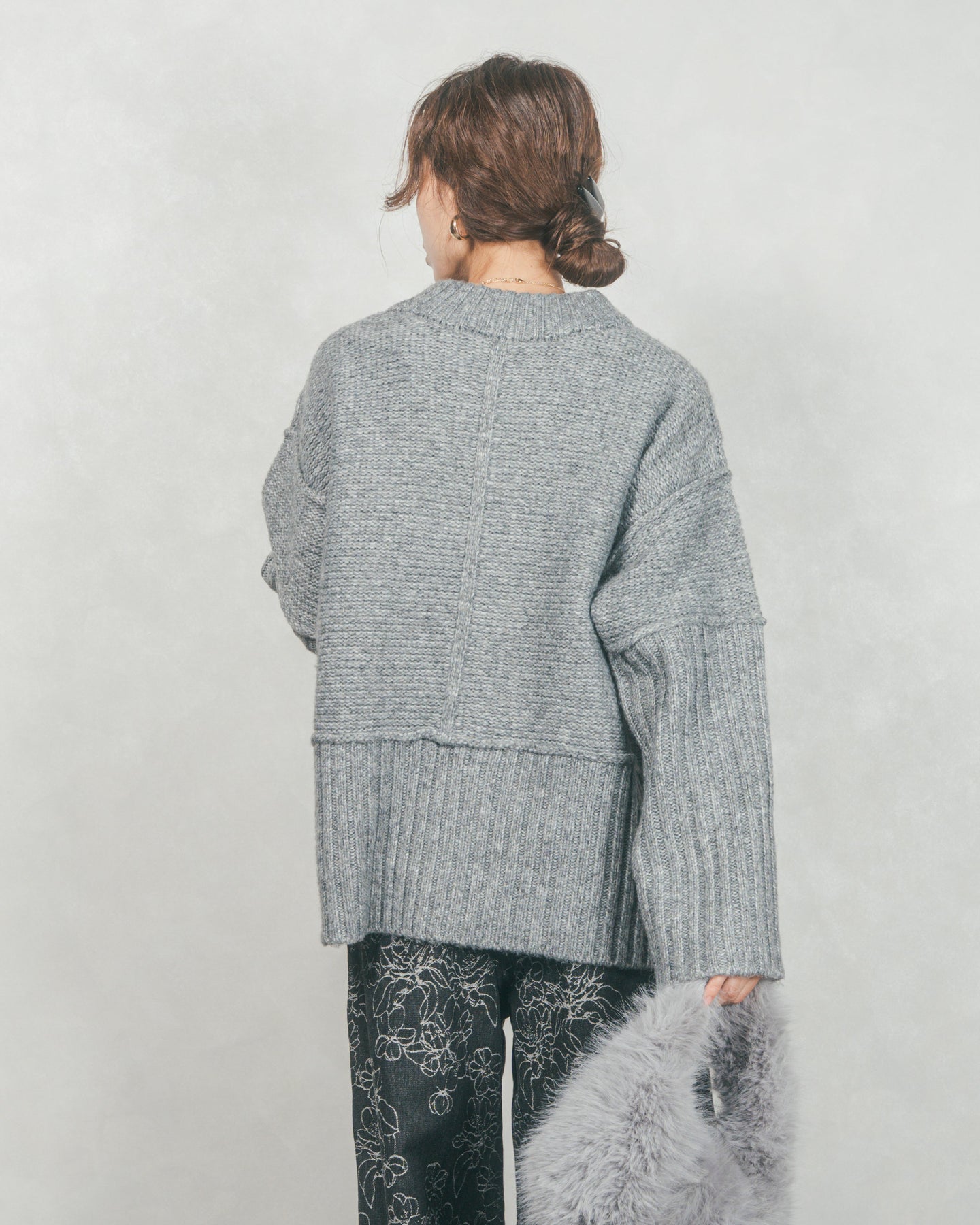 袖と裾にあしらった大胆なリブ切り替えが目を引く、クルーネックニットが登場。ゆるっとしたシルエットにざっくりとした編地が絶妙な抜け感を生み出し、肩の力を抜いた大人のカジュアルスタイルを演出します。