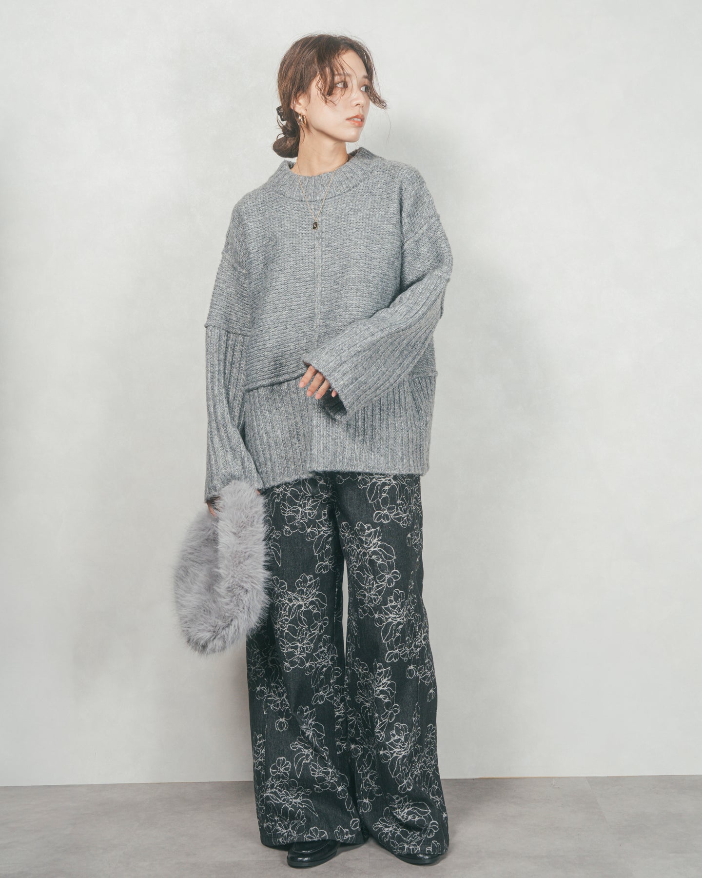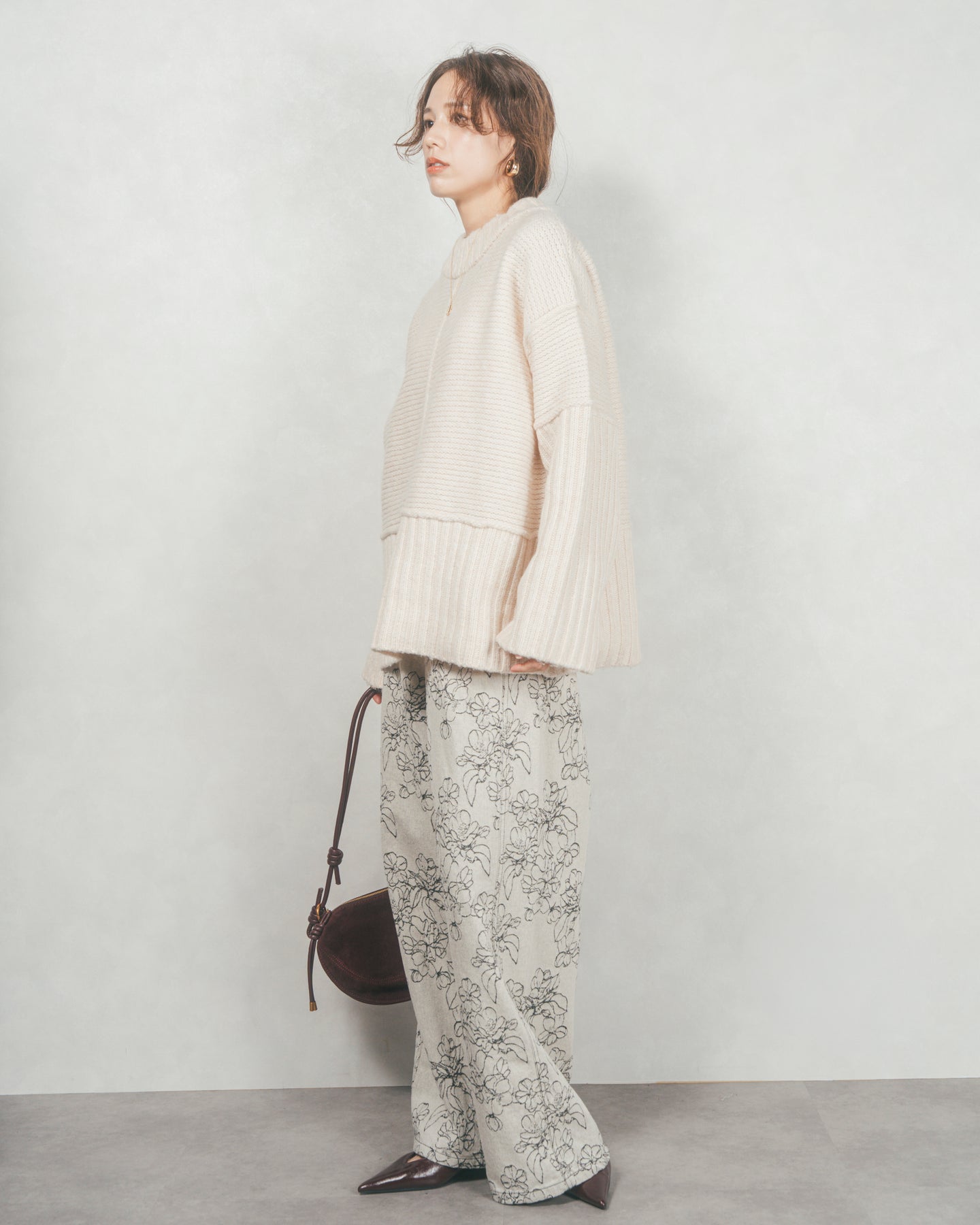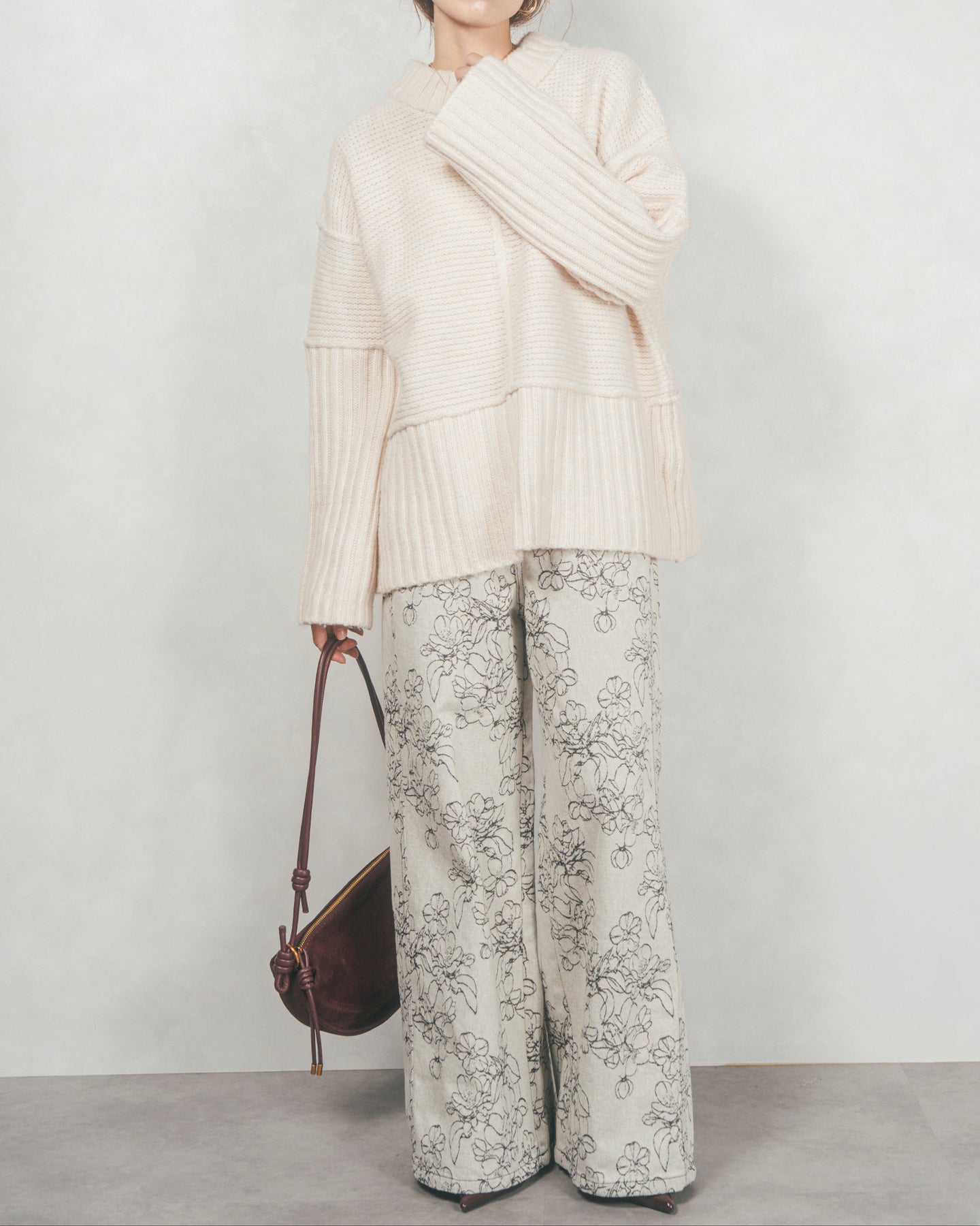 [SET]リンキングデザイン リラックスニット+フラワージャガードデニム(2SET)