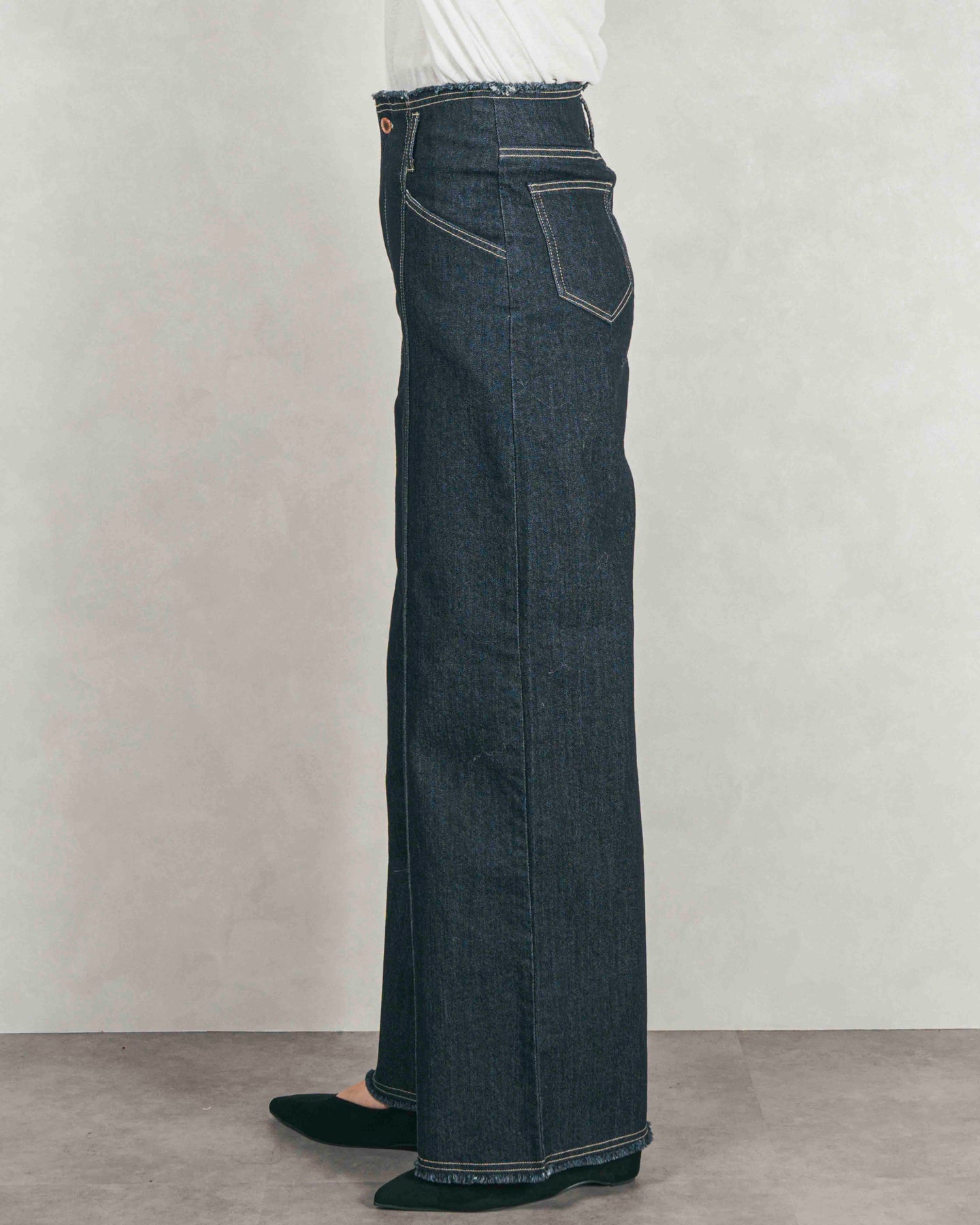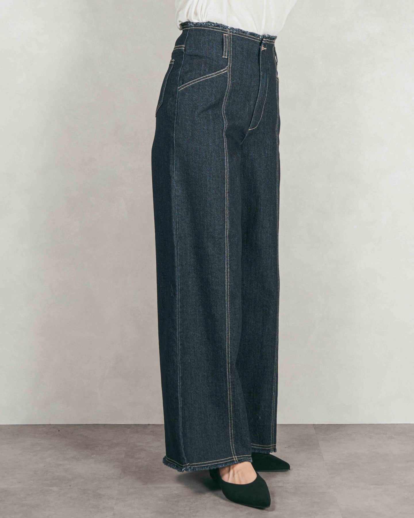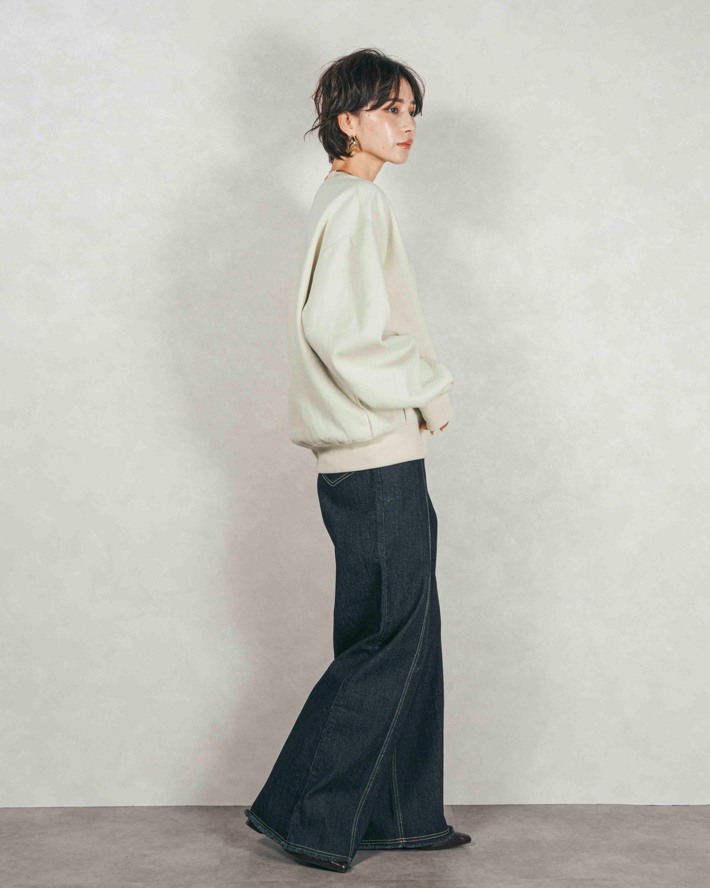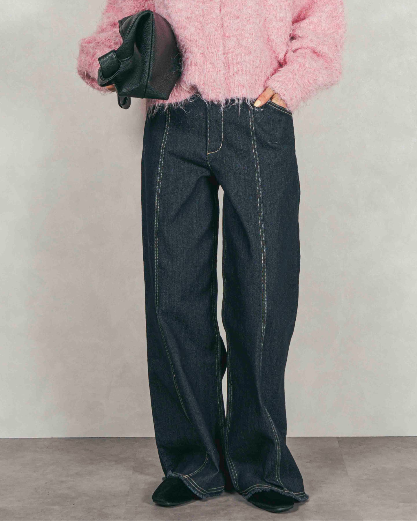 ハイウエストのシルエットはウエストまわりをスッキリと見せ、トレンドムードを作ってくれます。フロント中心にステッチを入れ、Iラインを強調することでスタイルアップを実現◎カットオフで仕上げたウエストがこなれ感をプラスします。