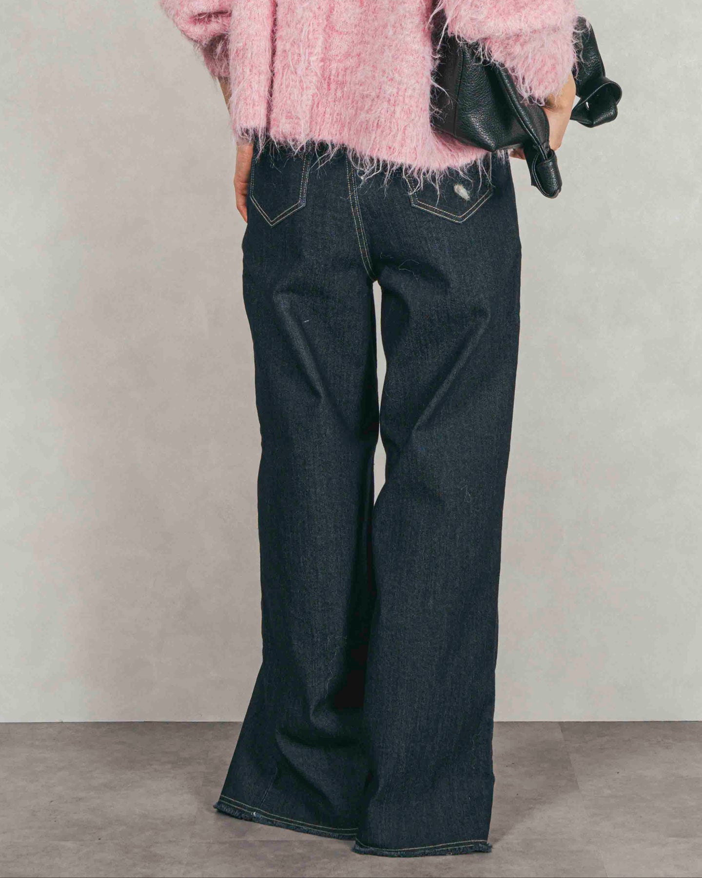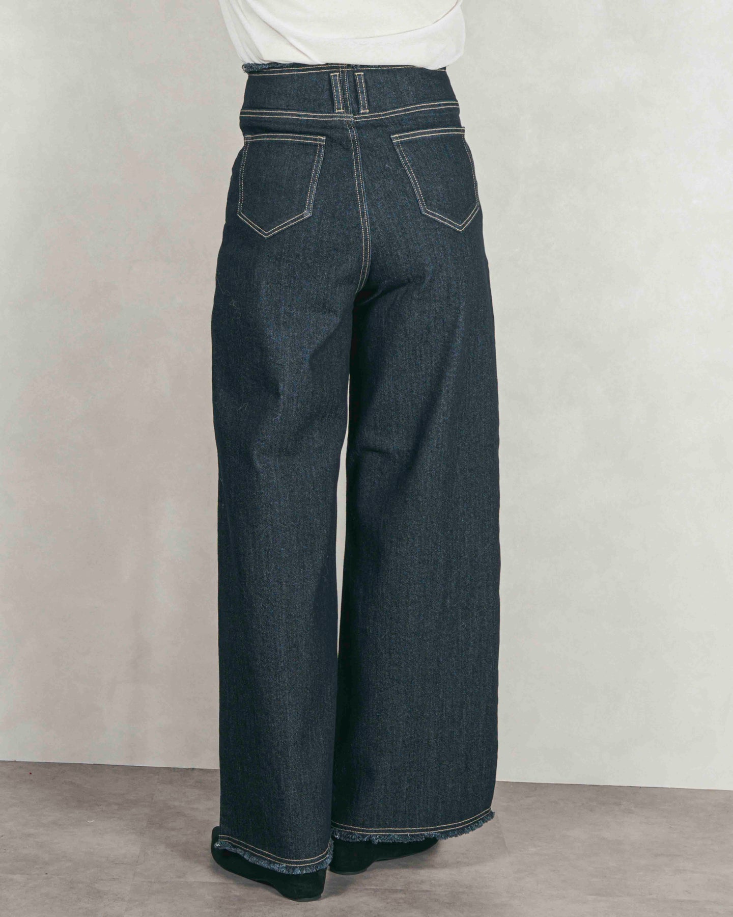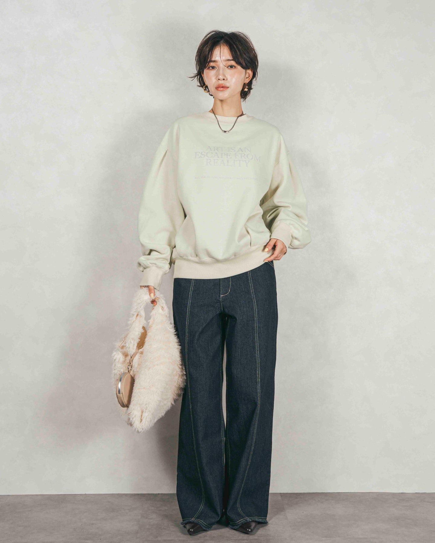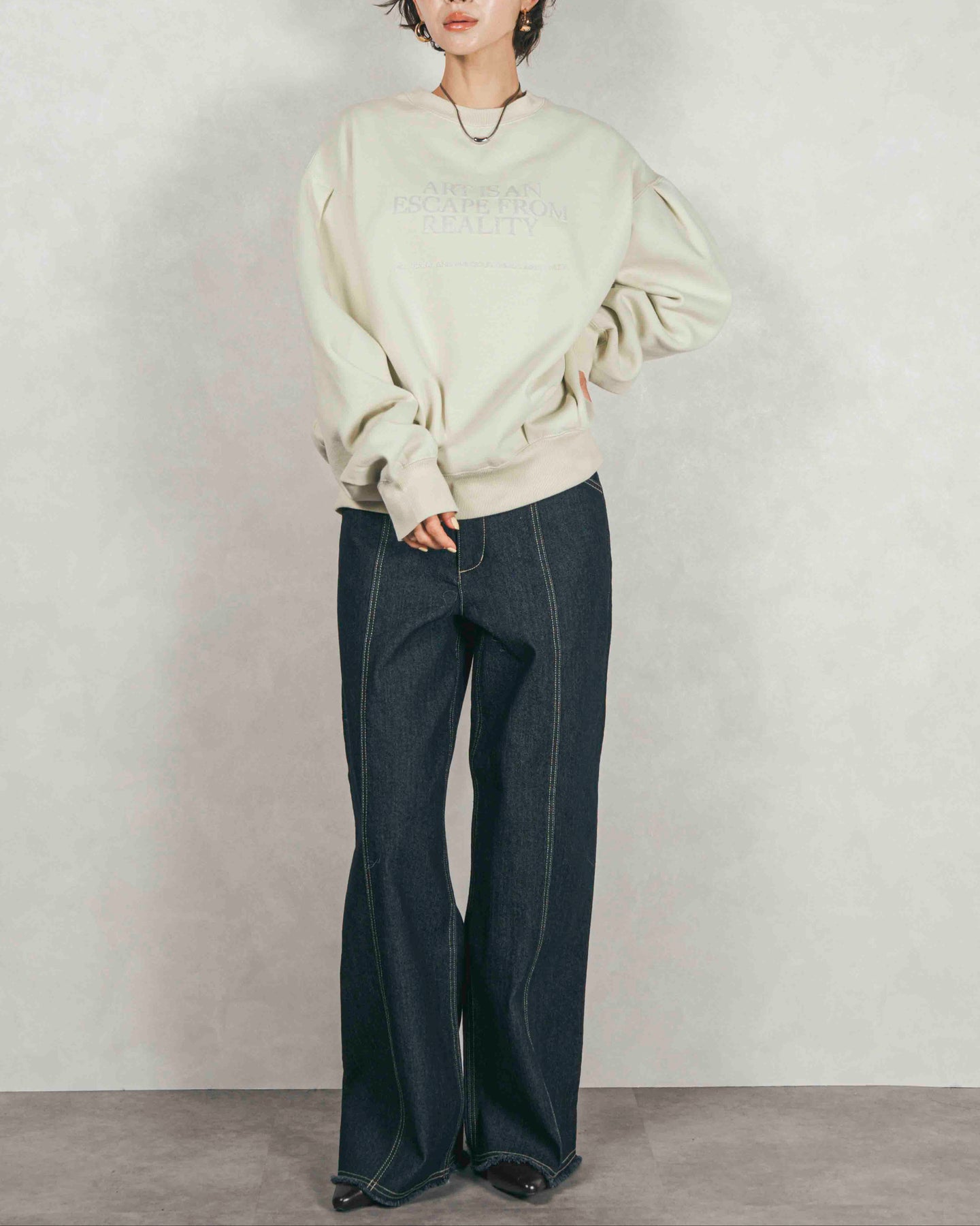 ハイウエストのシルエットはウエストまわりをスッキリと見せ、トレンドムードを作ってくれます。フロント中心にステッチを入れ、Iラインを強調することでスタイルアップを実現◎カットオフで仕上げたウエストがこなれ感をプラスします。