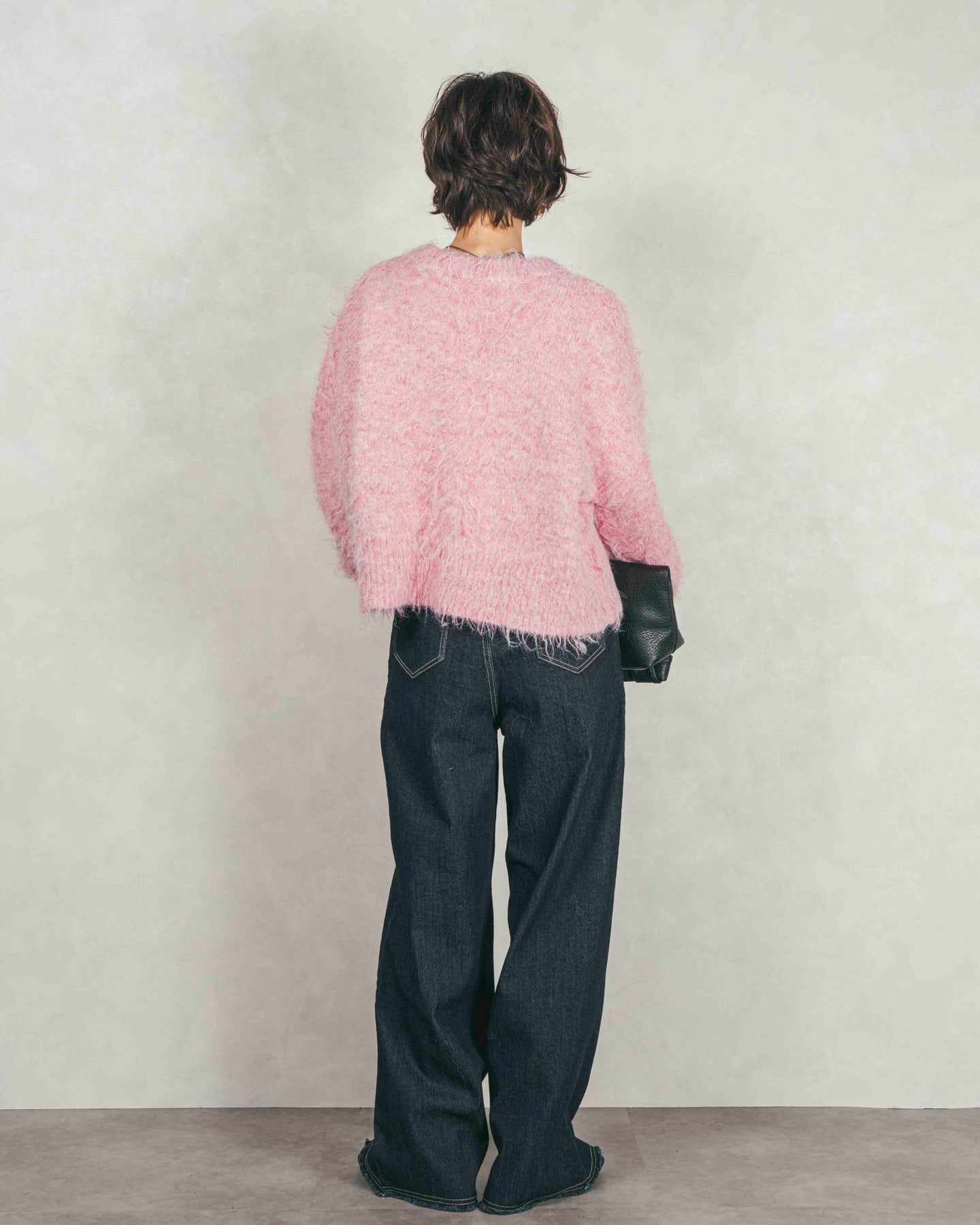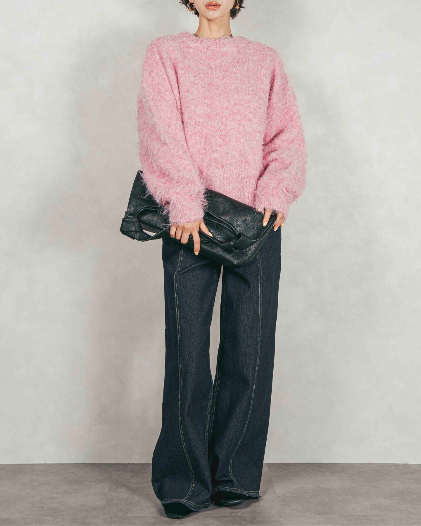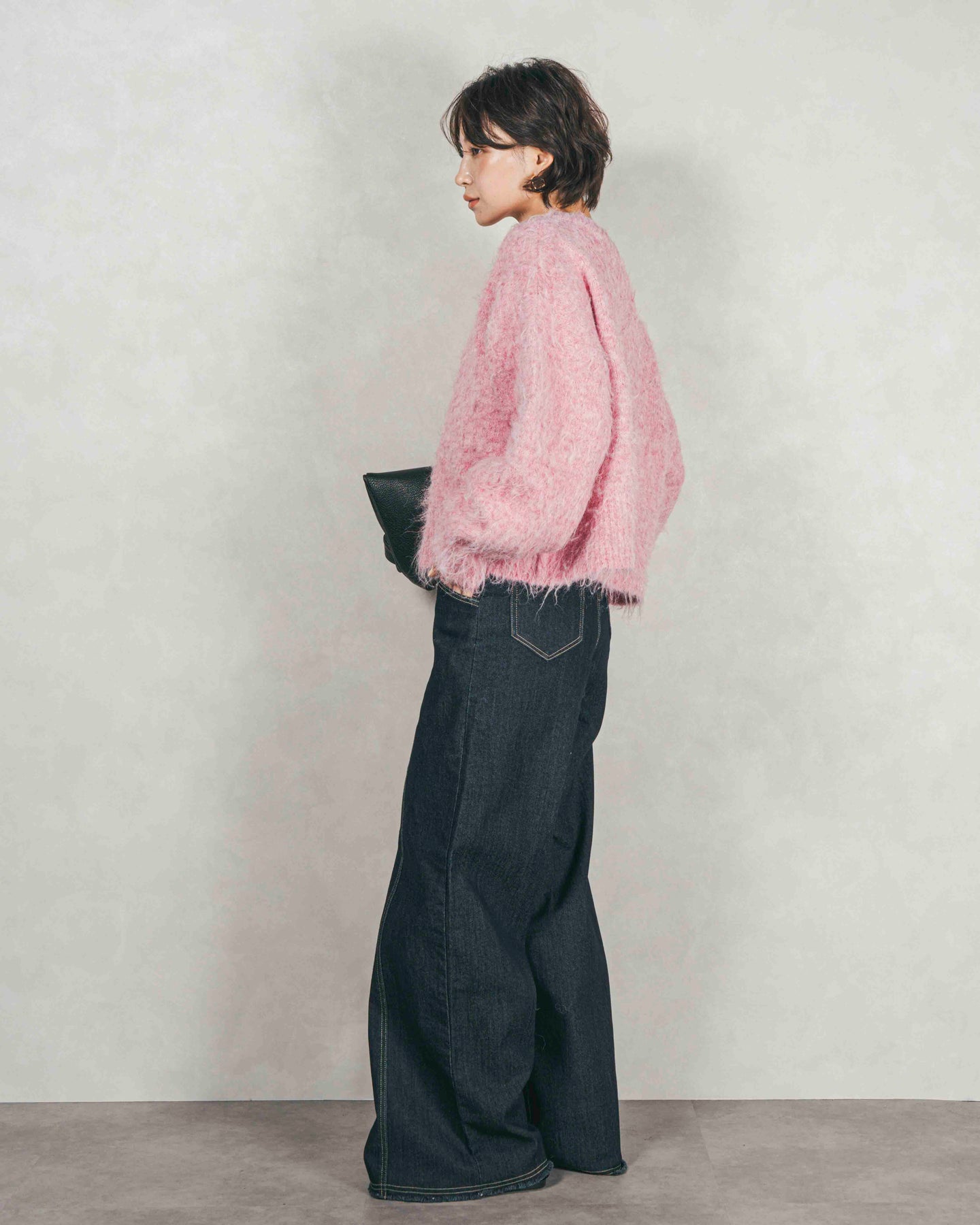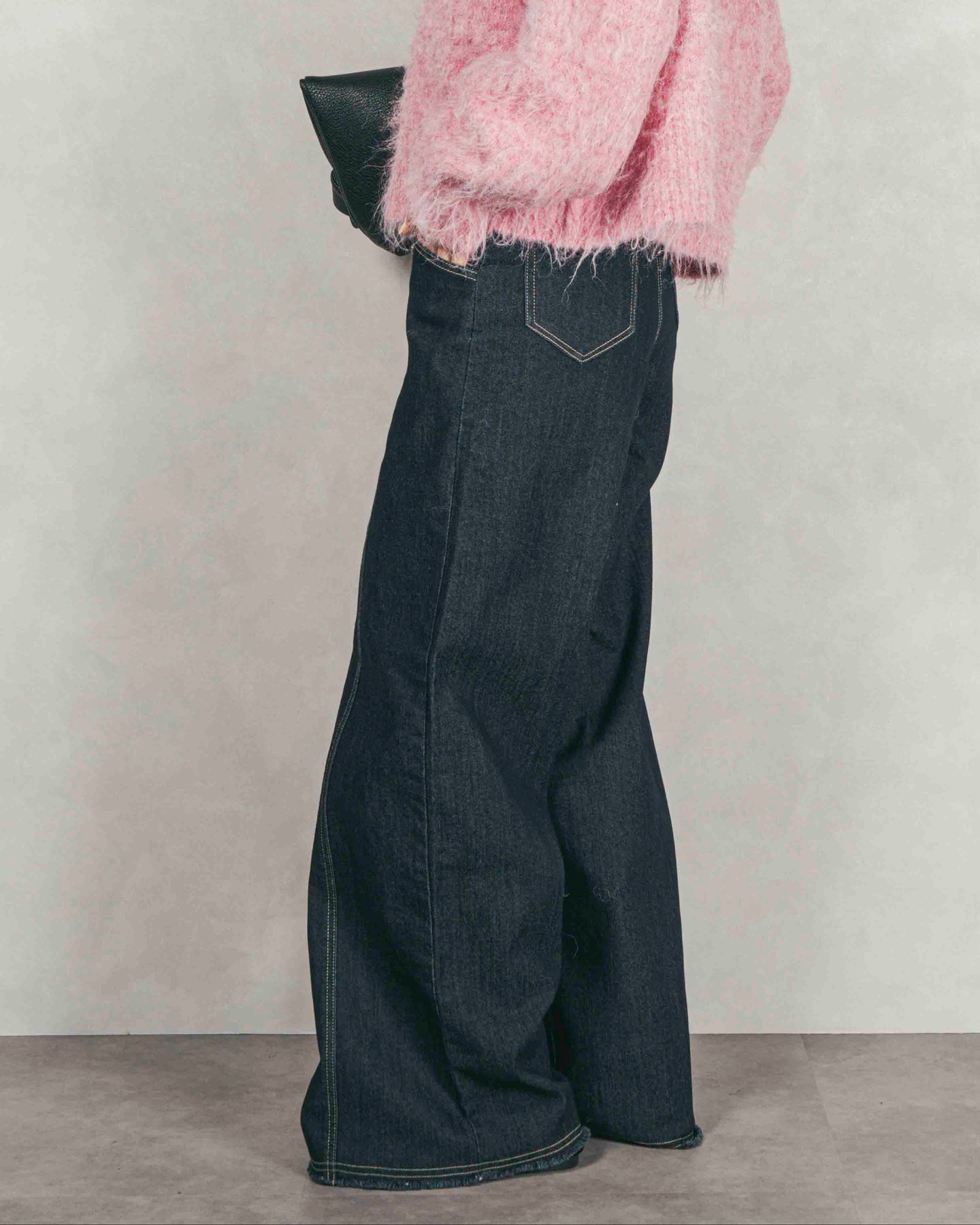 ハイウエストのシルエットはウエストまわりをスッキリと見せ、トレンドムードを作ってくれます。フロント中心にステッチを入れ、Iラインを強調することでスタイルアップを実現◎カットオフで仕上げたウエストがこなれ感をプラスします。