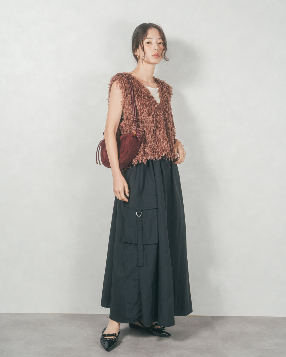 カジュアルさと女性らしさが同時に叶うカーゴスカート。ナイロンワッシャータフタ素材の軽やかな生地が、動くたびにふわりと揺れて、やわらかい印象を与えます。ミリタリーテイストの大きめなサイドポケットがポイントで、シンプルなトップスを合わせるだけでこなれた雰囲気を演出。ドロストコードでウエストを絞れば、メリハリのあるシルエットも楽しめます。