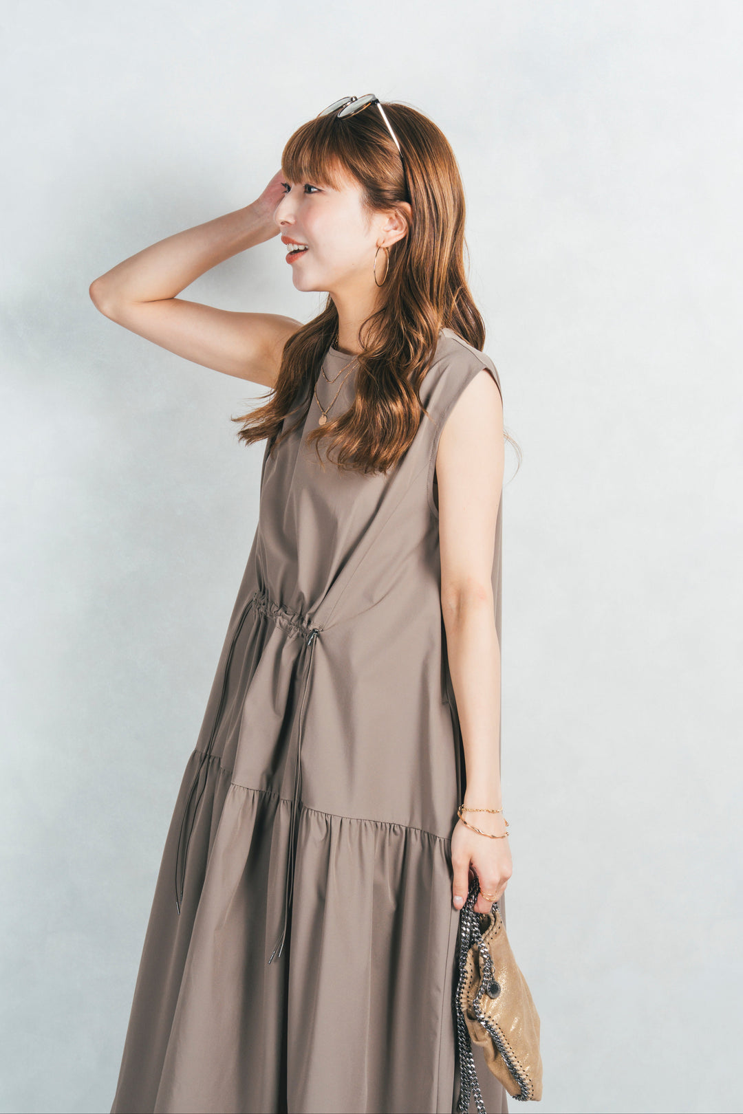 1枚で決まる、デザインワンピース。身体のラインを拾いすぎないように、フロント部分のみドロストを入れています。
