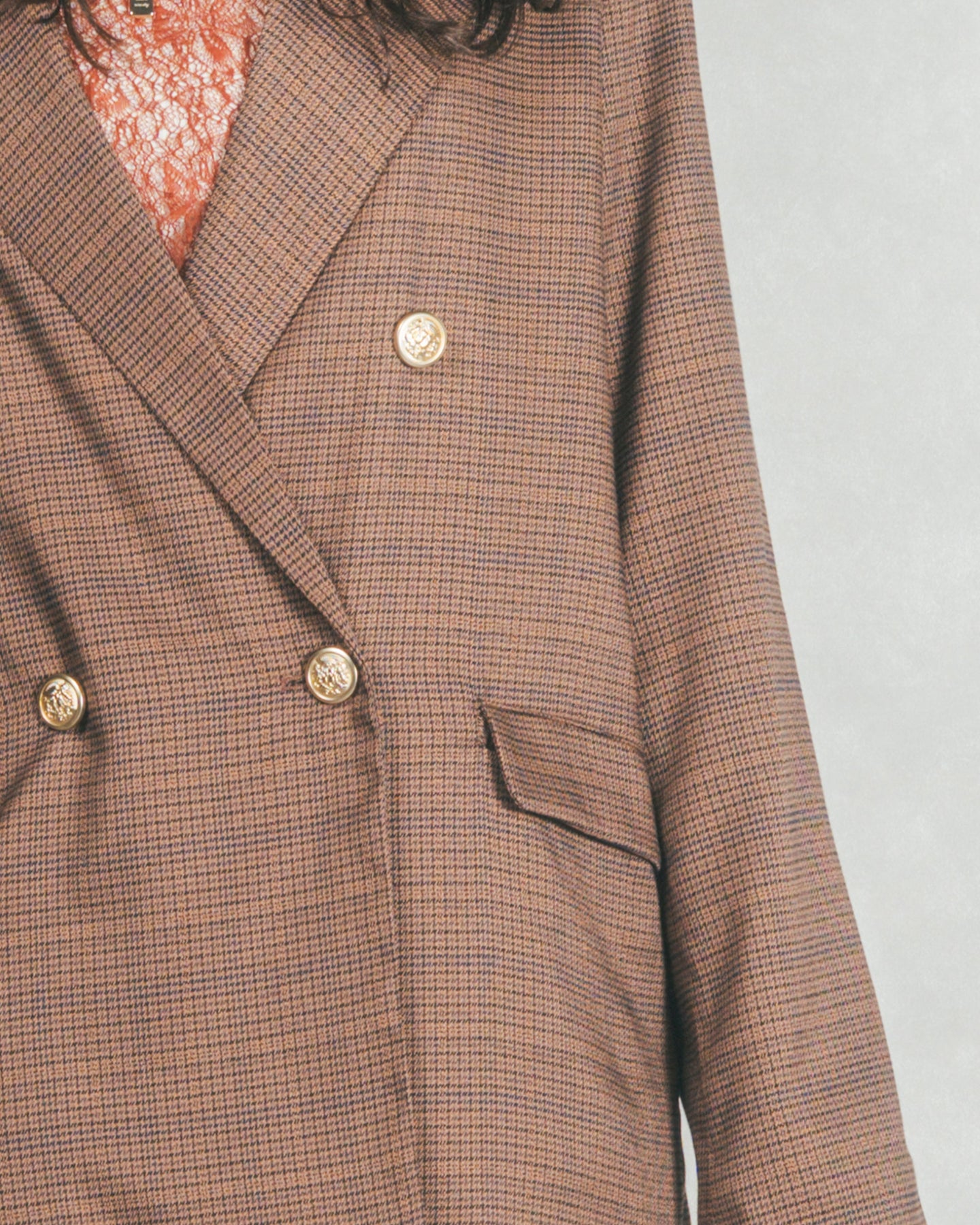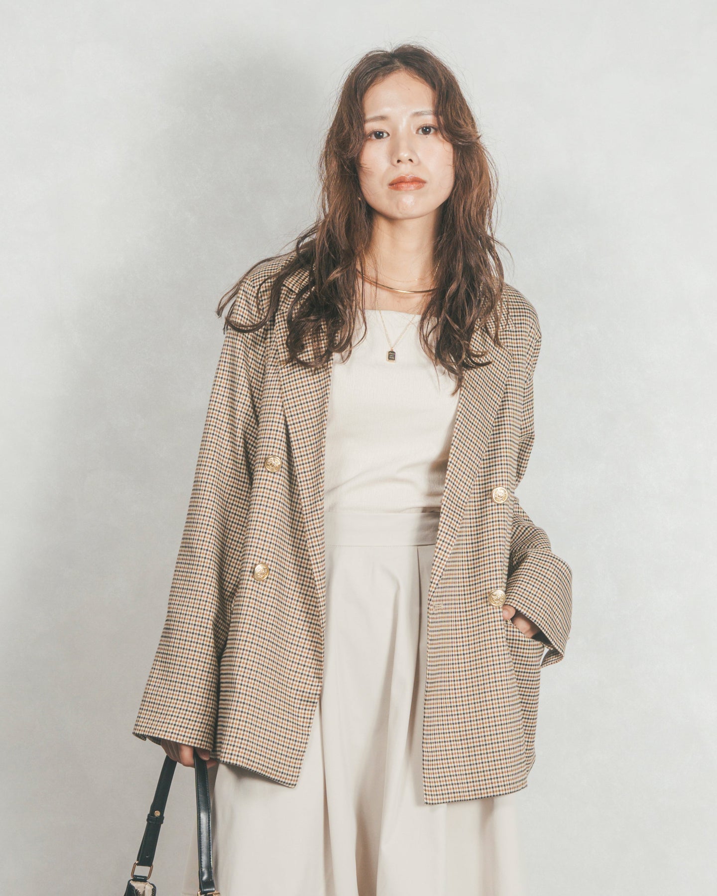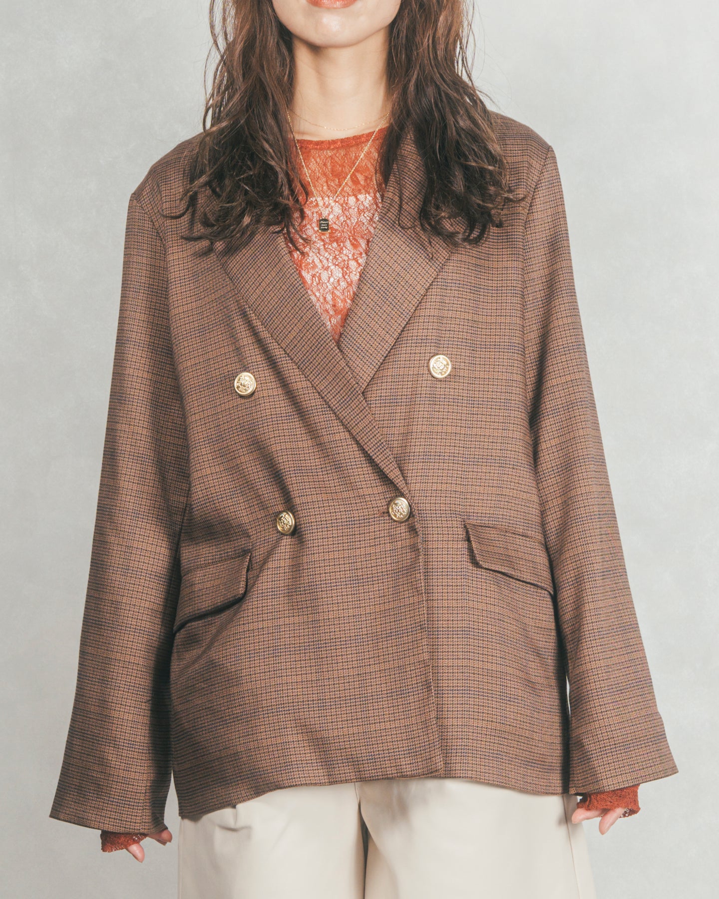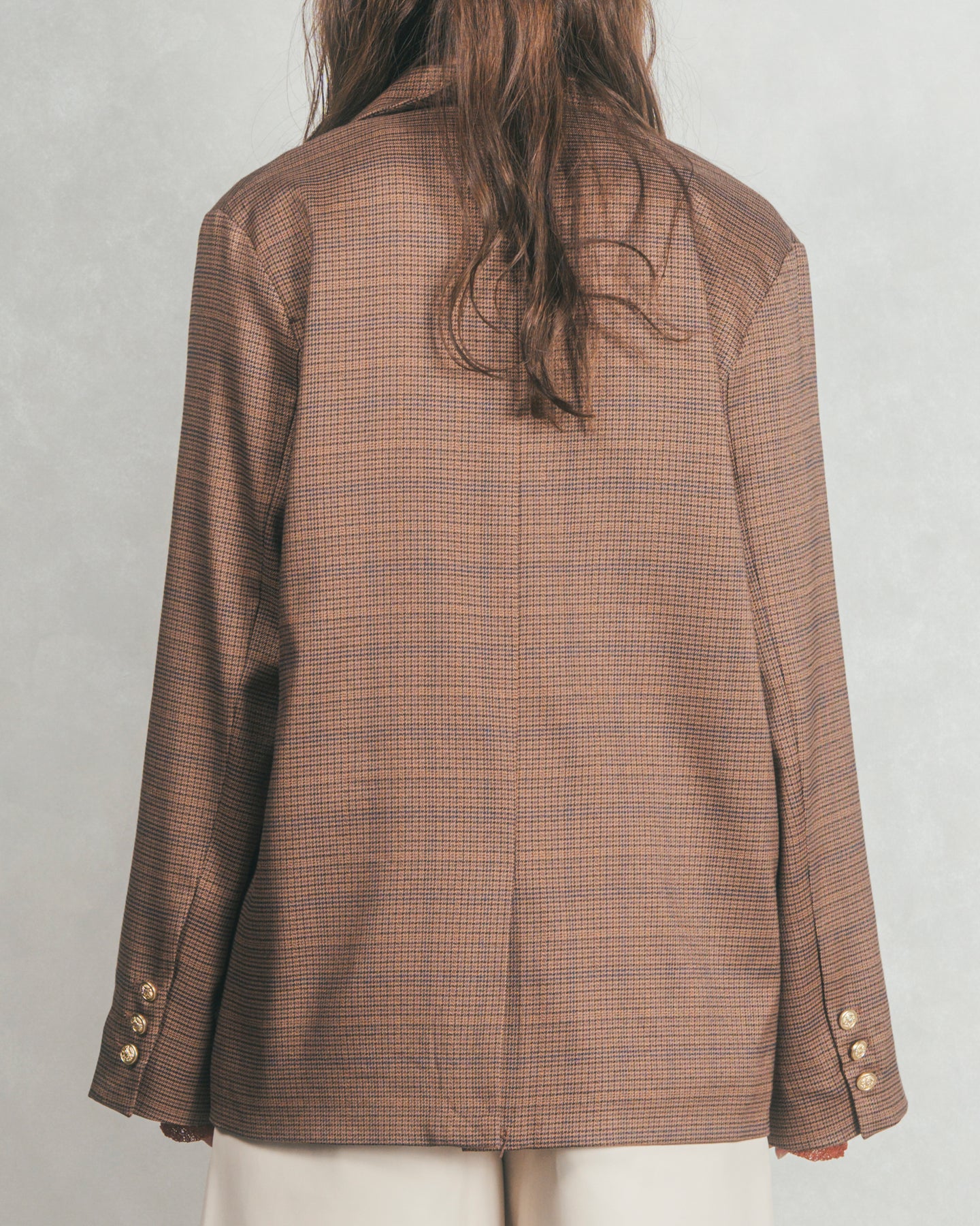 ほどよくゆとりを持たせたシルエットに、上品なチェック柄ときらりと光る金ボタンがアクセントとなり、羽織るだけでぐっとこなれた印象に。裏地付きなので袖通しもスムーズで、ニットやカットソーの上からも快適に着ていただけます。