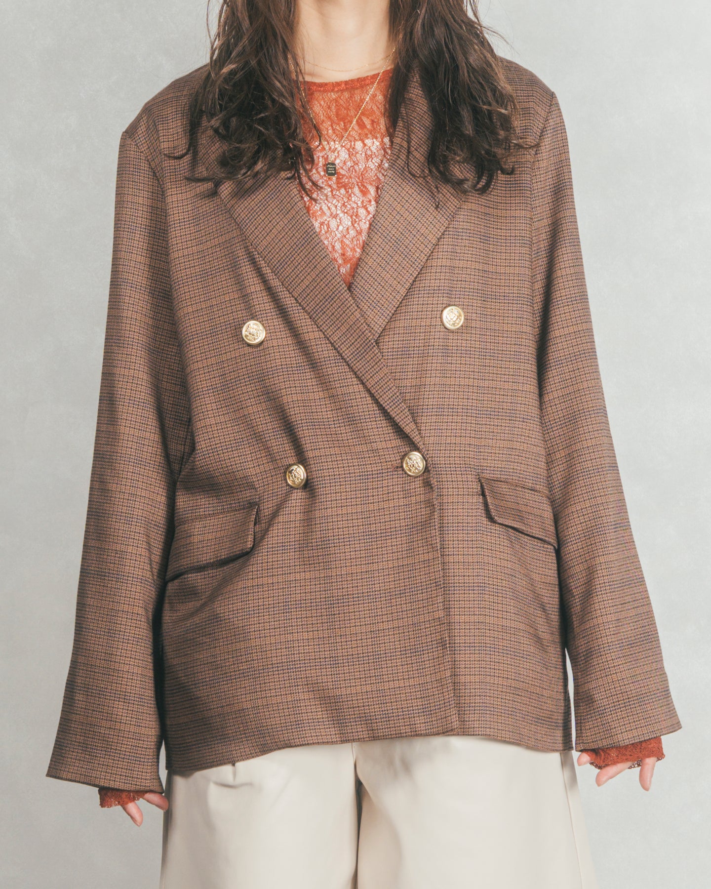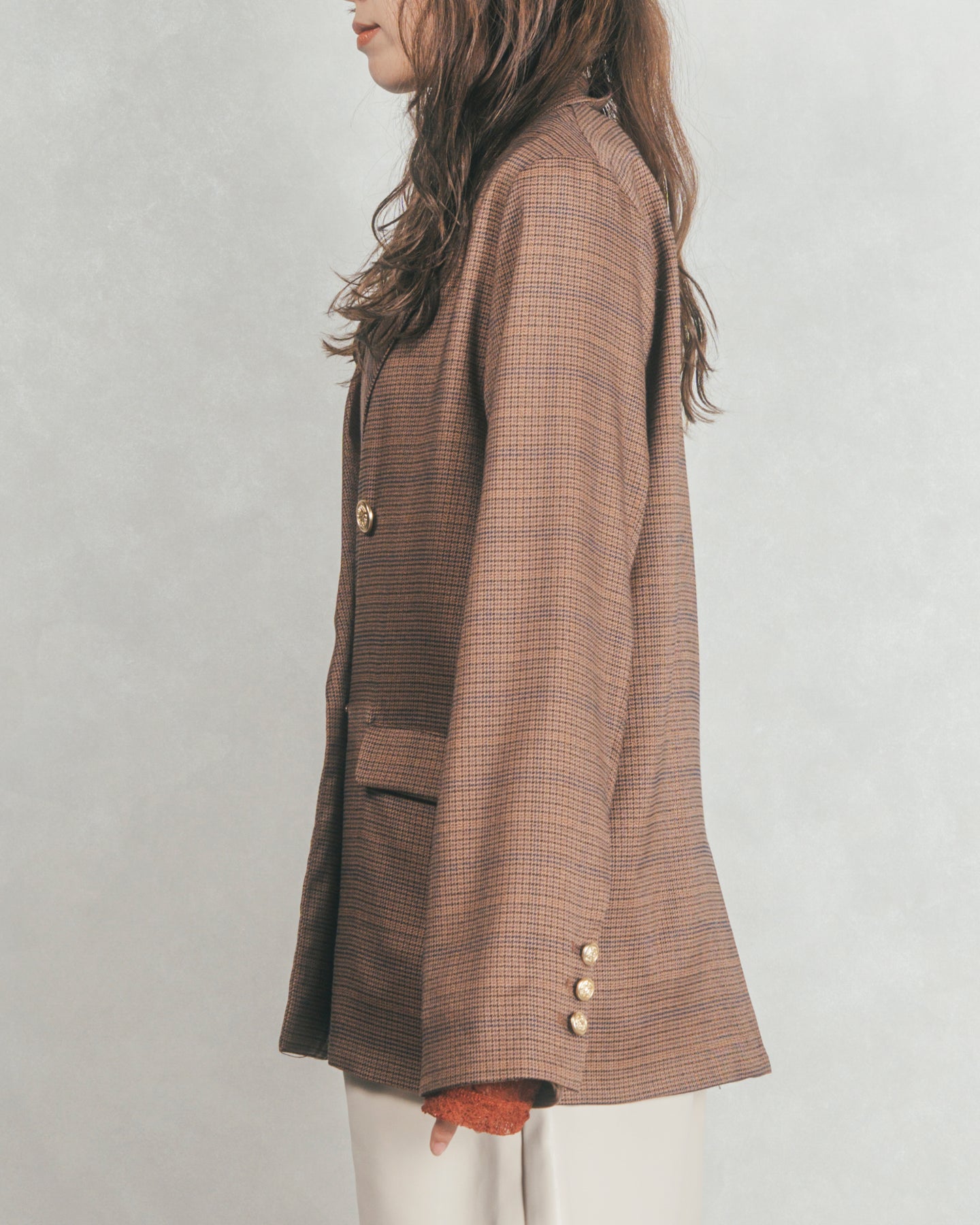 ほどよくゆとりを持たせたシルエットに、上品なチェック柄ときらりと光る金ボタンがアクセントとなり、羽織るだけでぐっとこなれた印象に。裏地付きなので袖通しもスムーズで、ニットやカットソーの上からも快適に着ていただけます。
