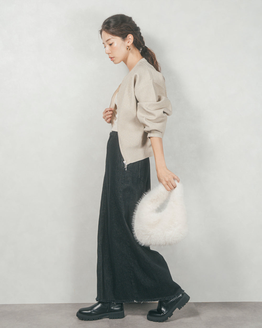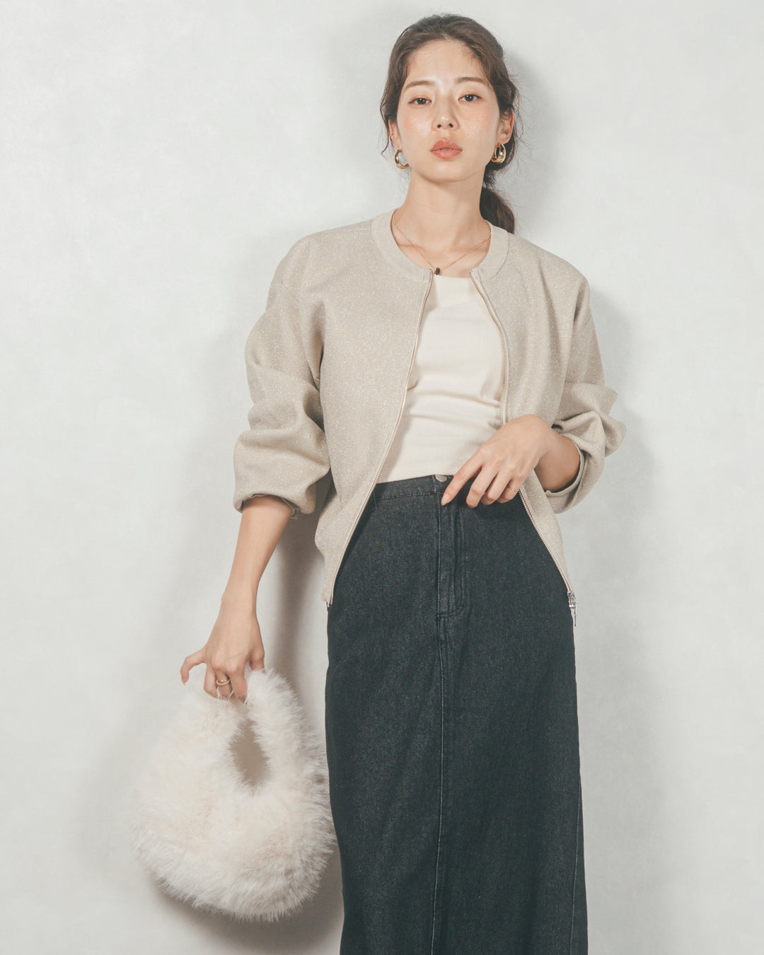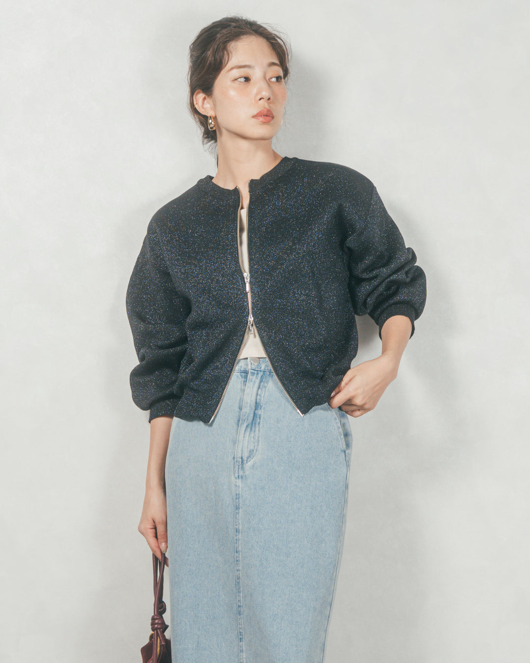 [SET]ラメニットzipカーディガン+フロントスリット Iラインデニムスカート(2SET)