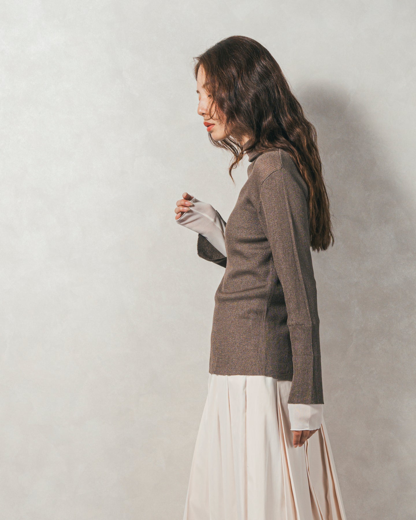 シアーインナーを重ね着しているかのようなデザインがポイント。 袖口に入れたスリットは、手元を動かすたびに抜け感と女性らしさを演出。ボディは肉感を拾いすぎないほどよいゆとりを持たせた絶妙なサイジングで、首の後ろのさりげないスリットは後ろ姿まで抜かりなくおしゃれに。