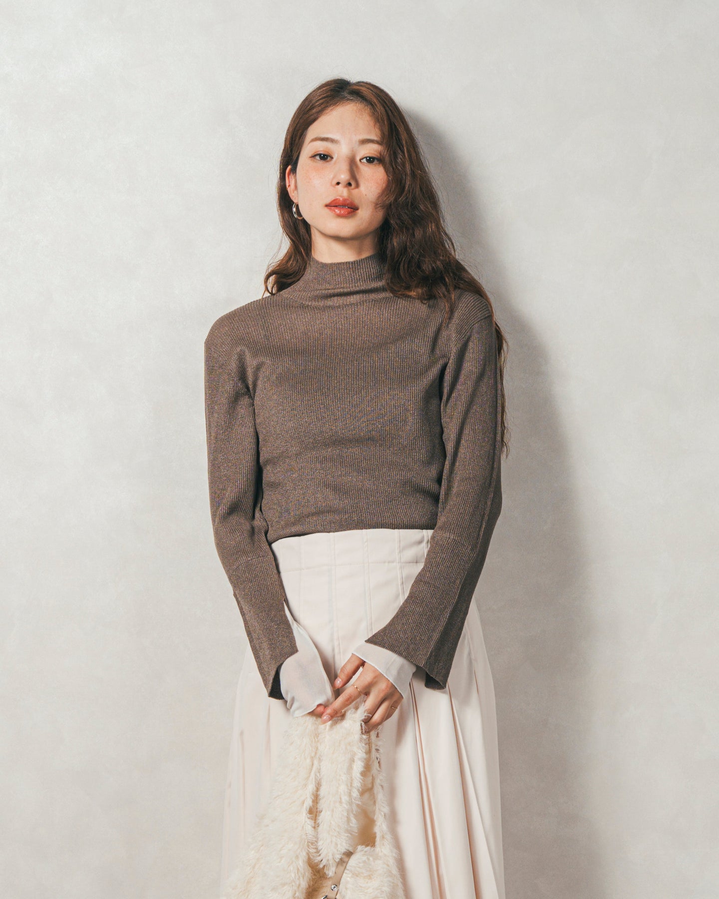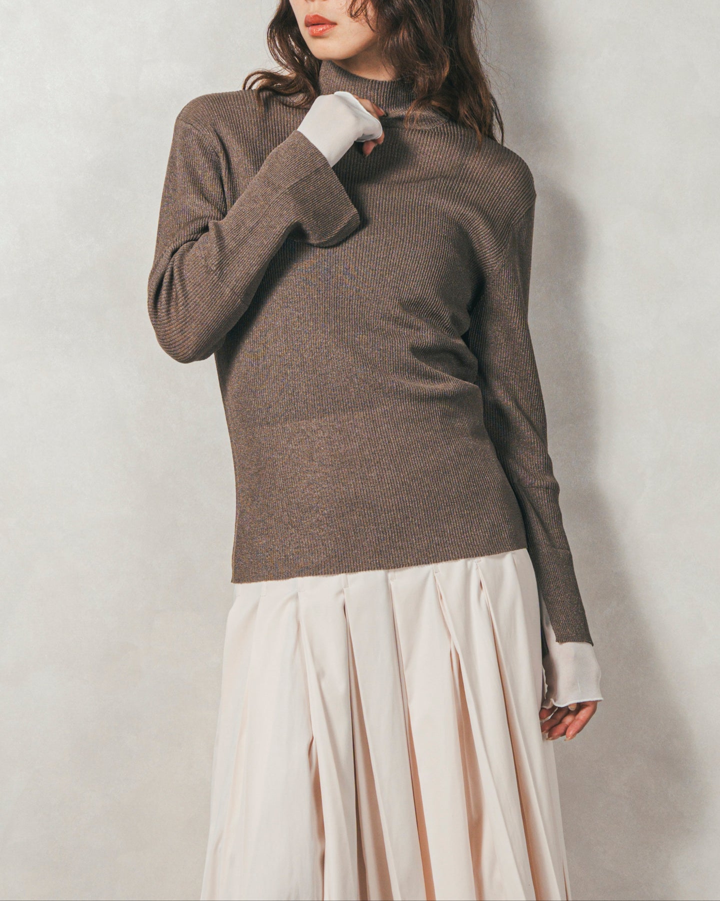 繊細なラメを丁寧に編み込んだ、上品なリブ素材。 ギラギラした派手さはなく、光の加減でまたたくようなさりげない輝きが特徴。肌を美しく見せてくれる高見えアイテム。袖口のレイヤード部分は伸縮性のある素材で。肌馴染みがよくチクチクしないストレスフリーな着心地です。