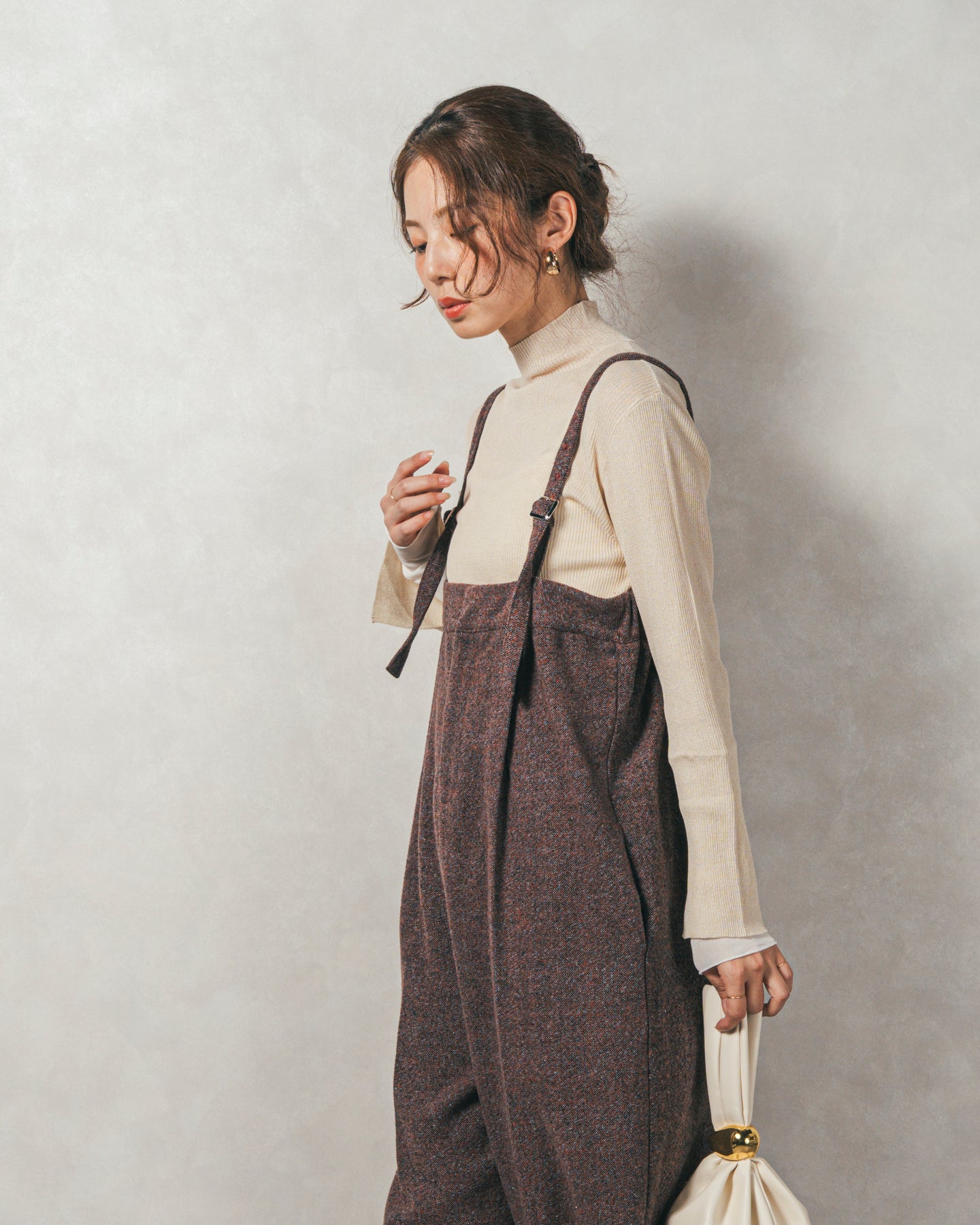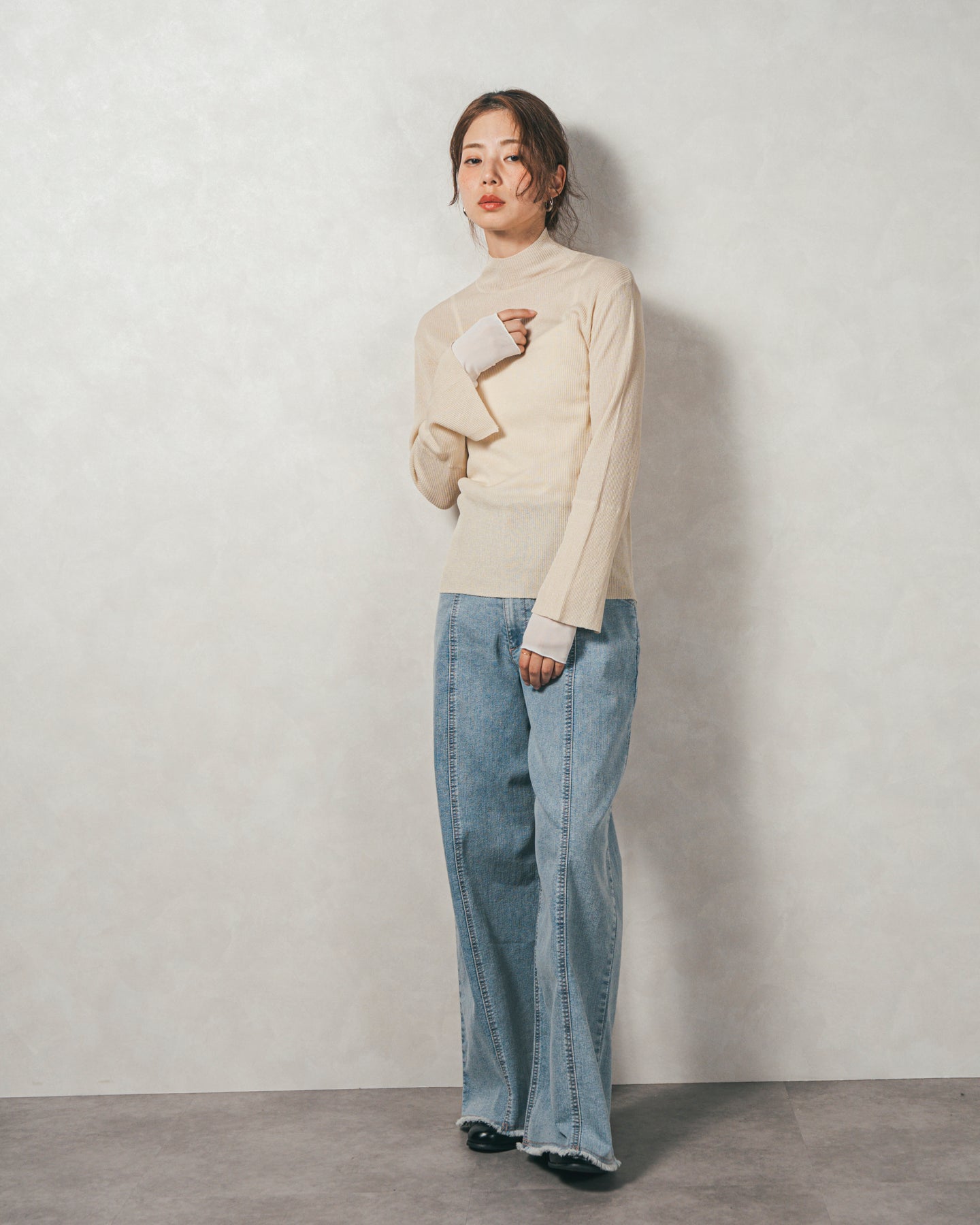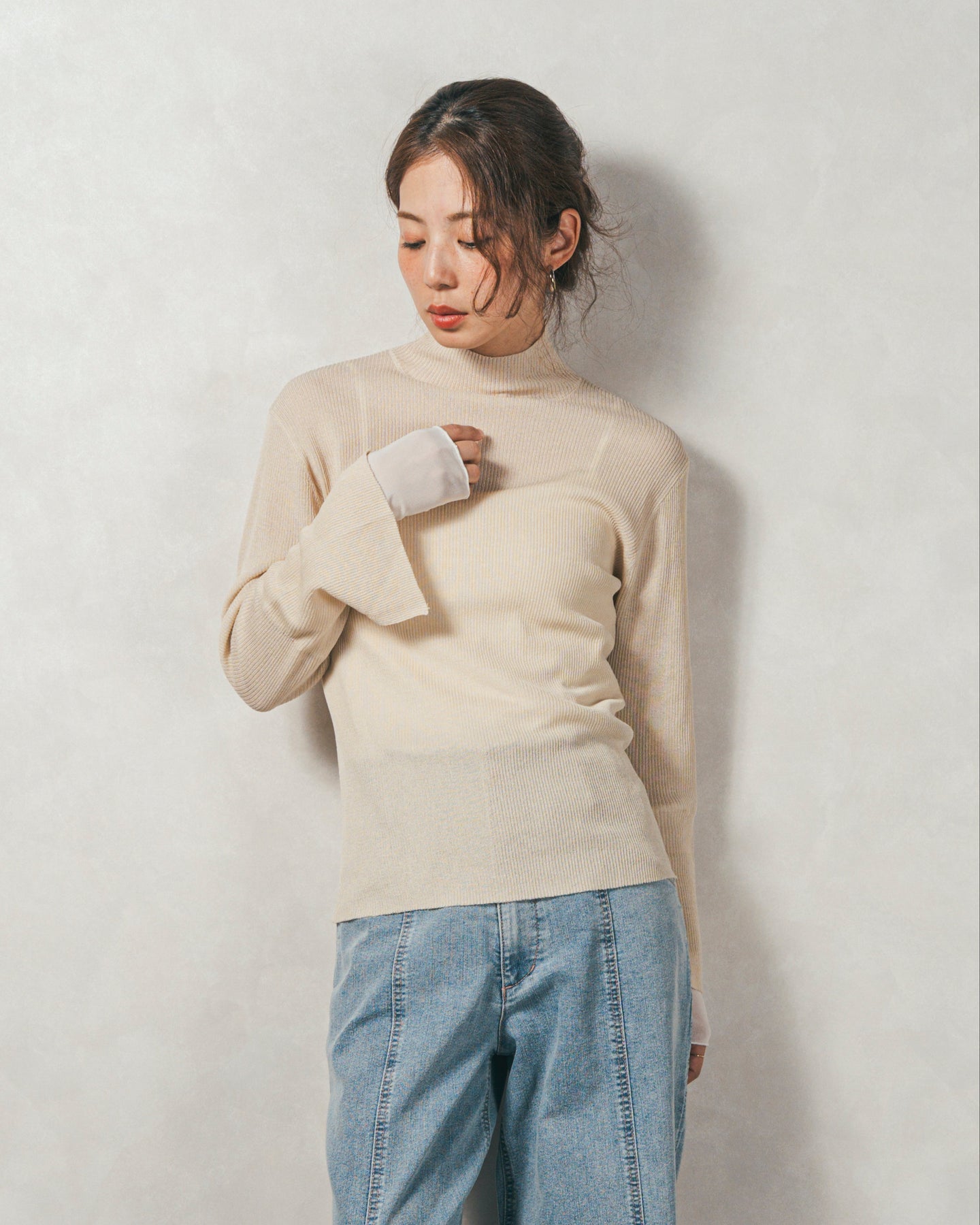繊細なラメを丁寧に編み込んだ、上品なリブ素材。 ギラギラした派手さはなく、光の加減でまたたくようなさりげない輝きが特徴。肌を美しく見せてくれる高見えアイテム。袖口のレイヤード部分は伸縮性のある素材で。肌馴染みがよくチクチクしないストレスフリーな着心地です。