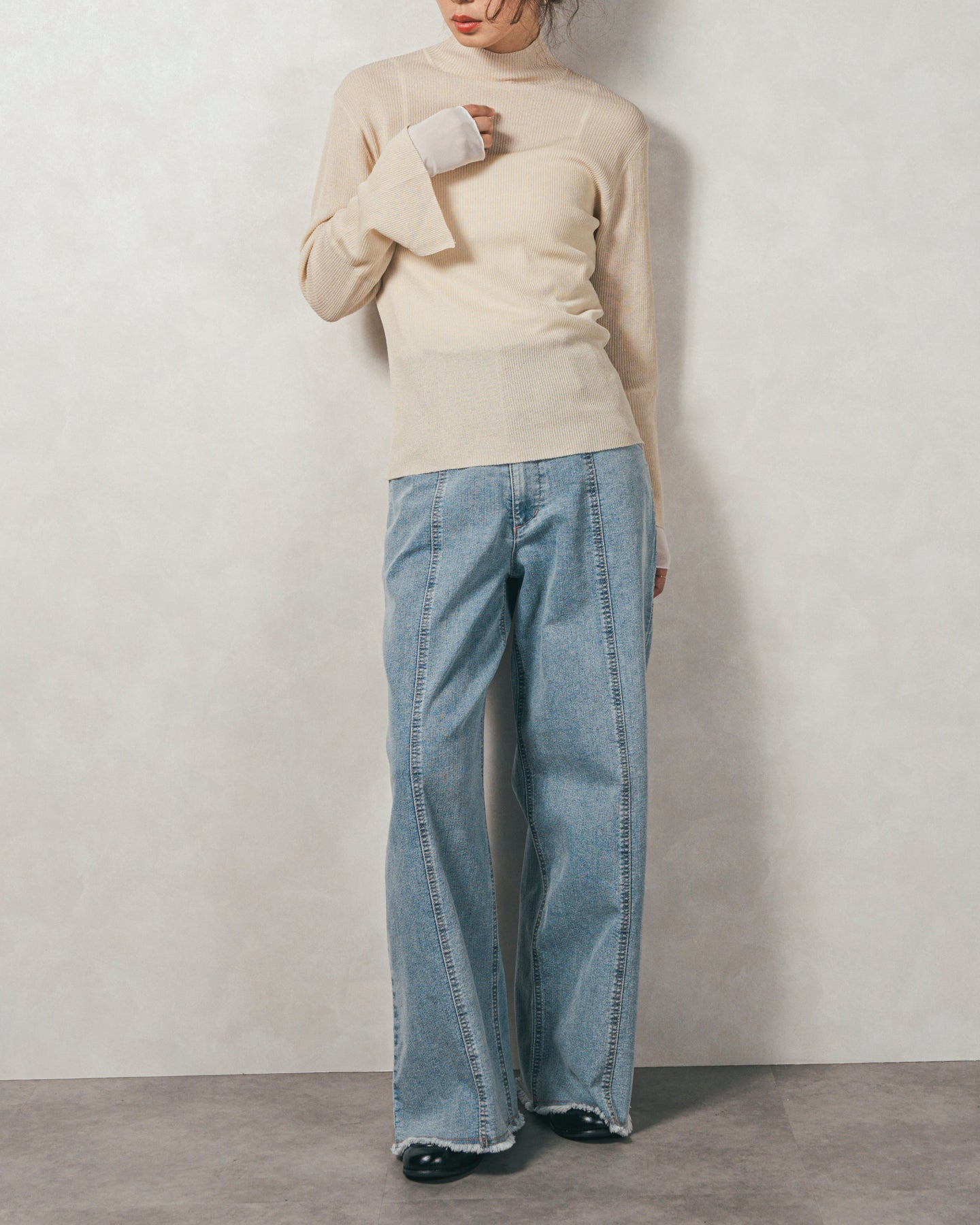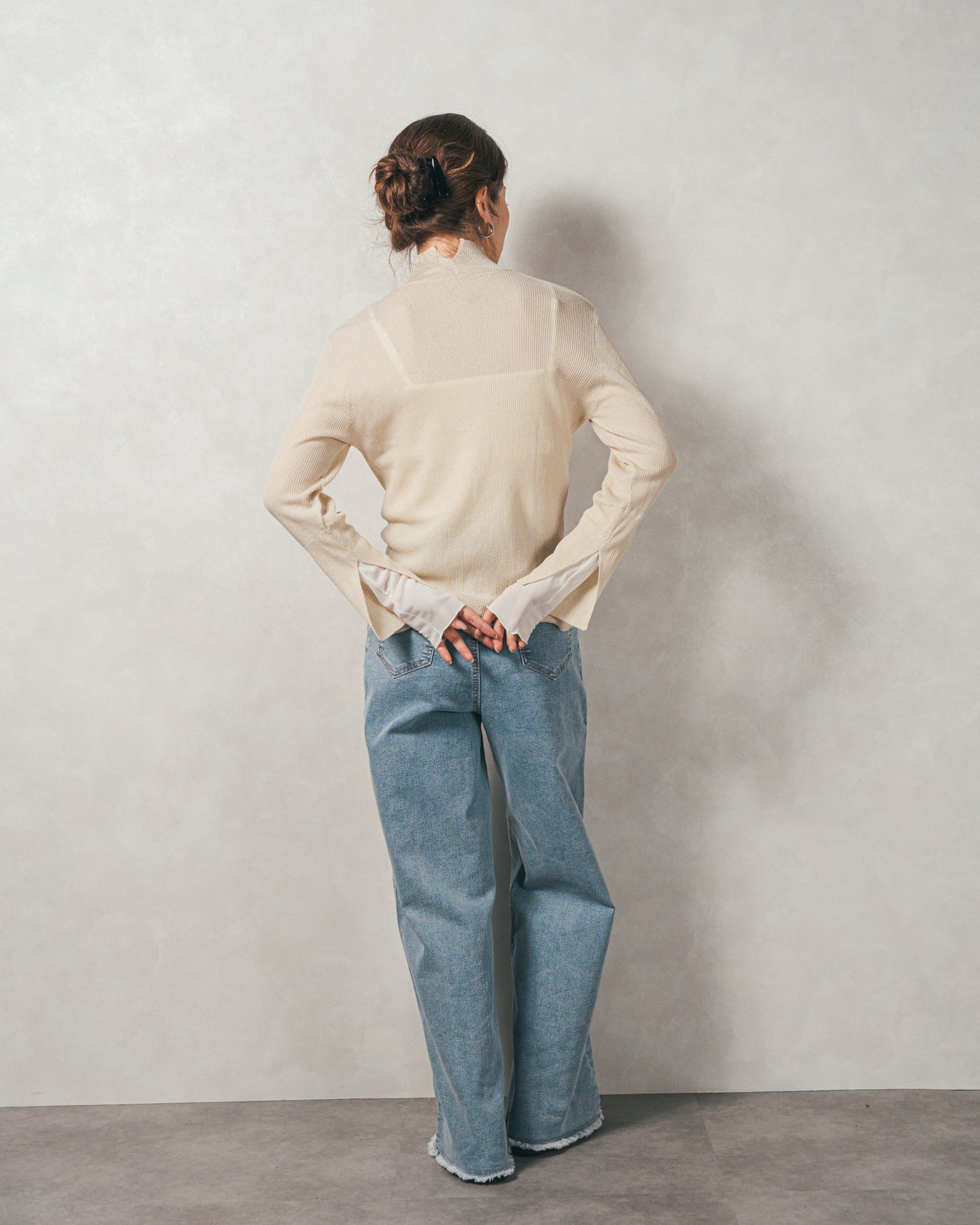 シアーインナーを重ね着しているかのようなデザインがポイント。 袖口に入れたスリットは、手元を動かすたびに抜け感と女性らしさを演出。ボディは肉感を拾いすぎないほどよいゆとりを持たせた絶妙なサイジングで、首の後ろのさりげないスリットは後ろ姿まで抜かりなくおしゃれに。
