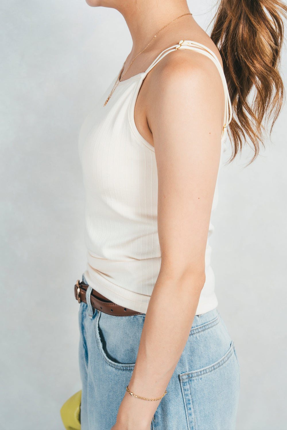 華奢なダブルストラップが、ヘルシーで女性らしい着こなしを叶えます。