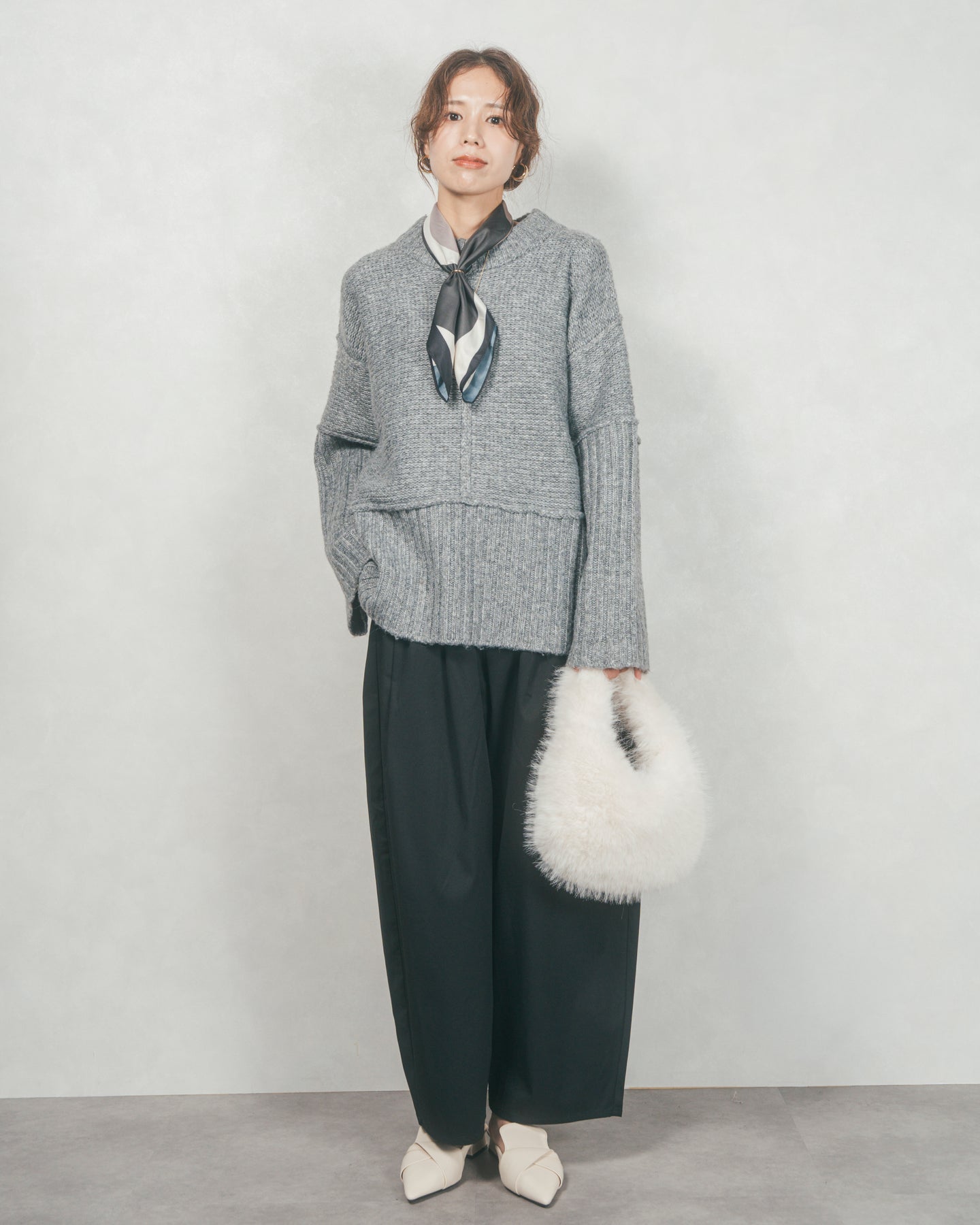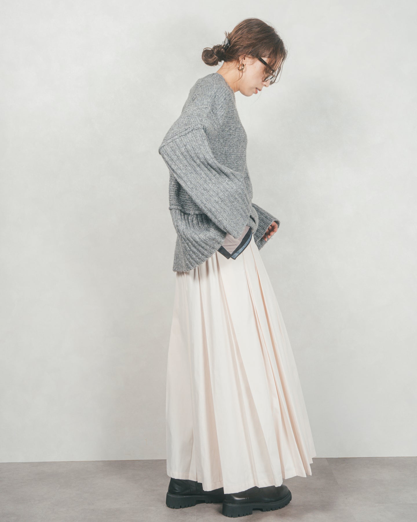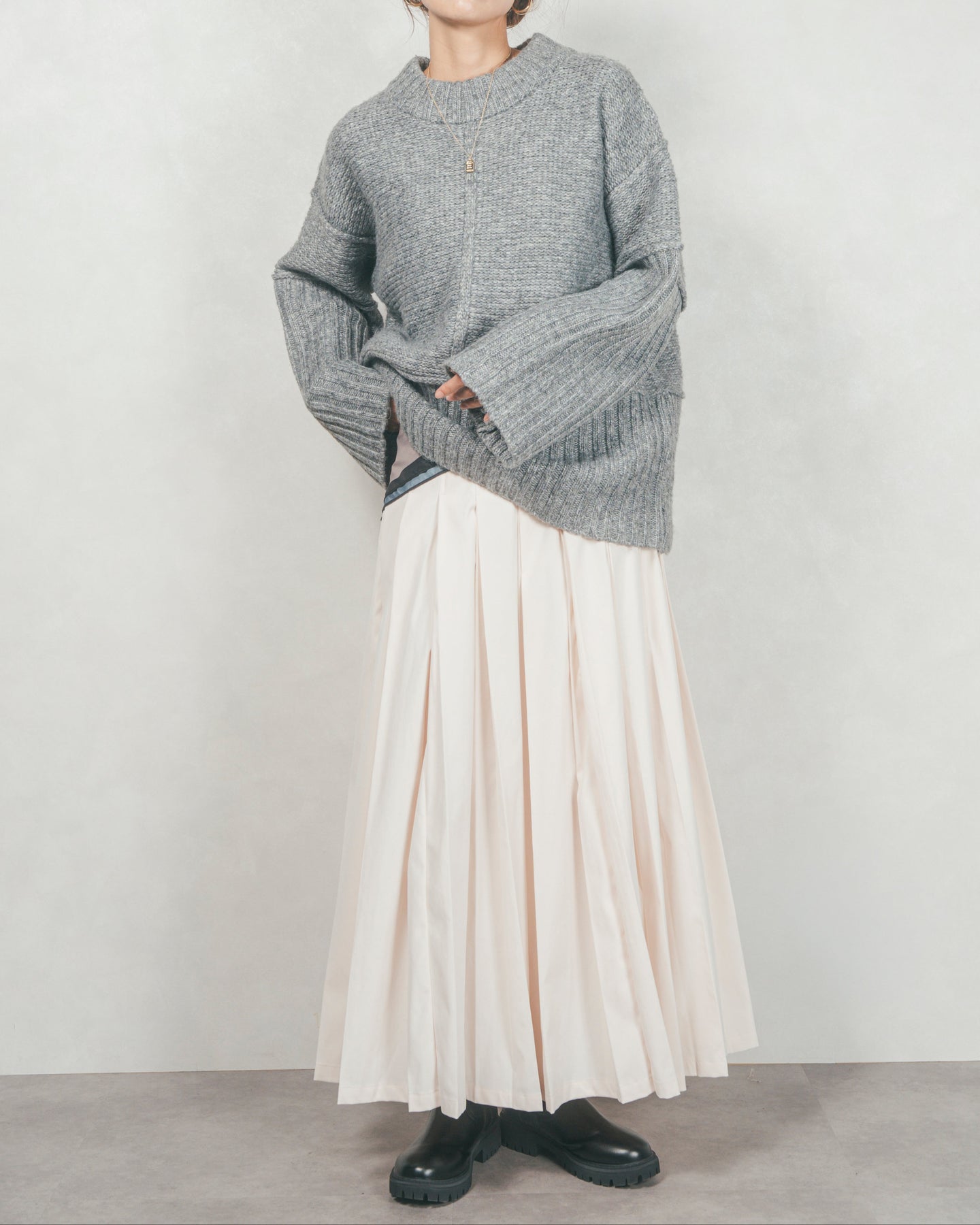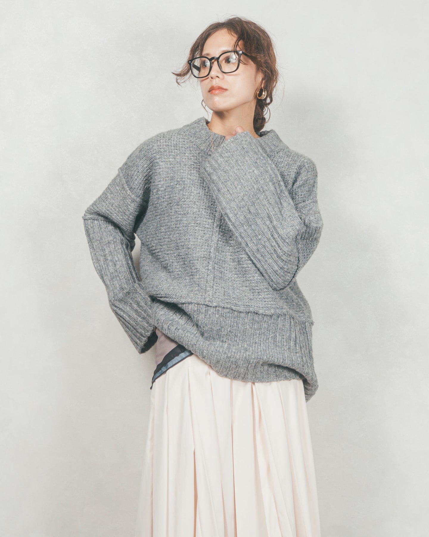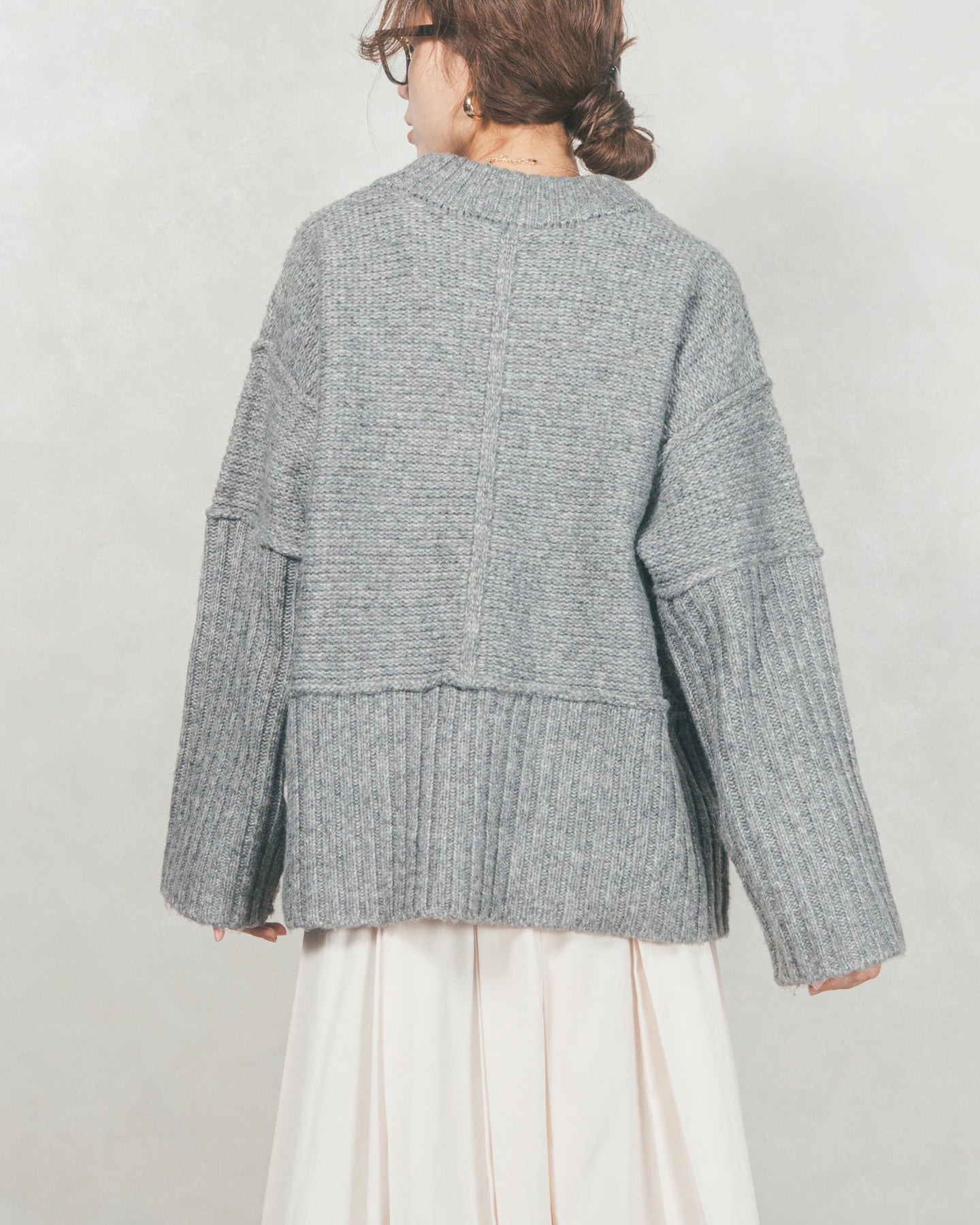 袖と裾にあしらった大胆なリブ切り替えが目を引く、クルーネックニットが登場。ゆるっとしたシルエットにざっくりとした編地が絶妙な抜け感を生み出し、肩の力を抜いた大人のカジュアルスタイルを演出します。