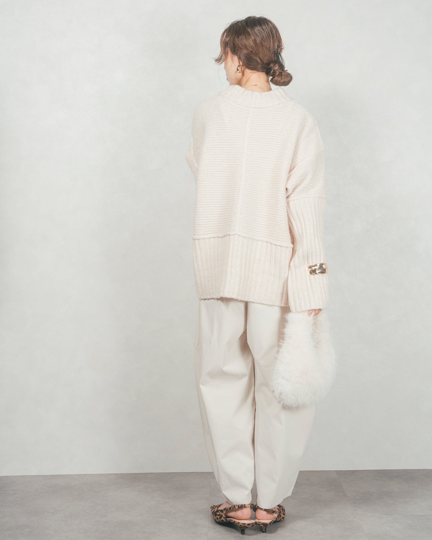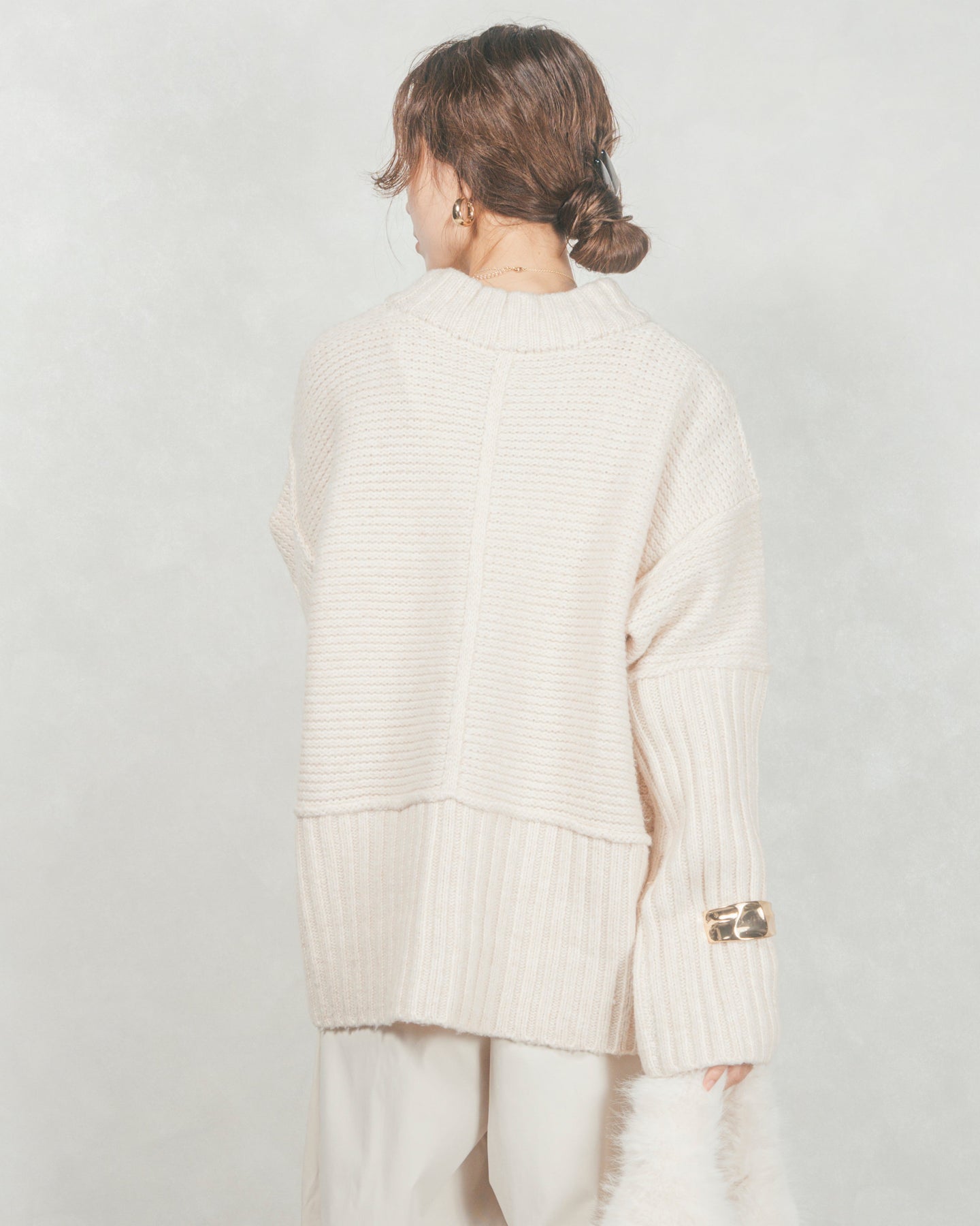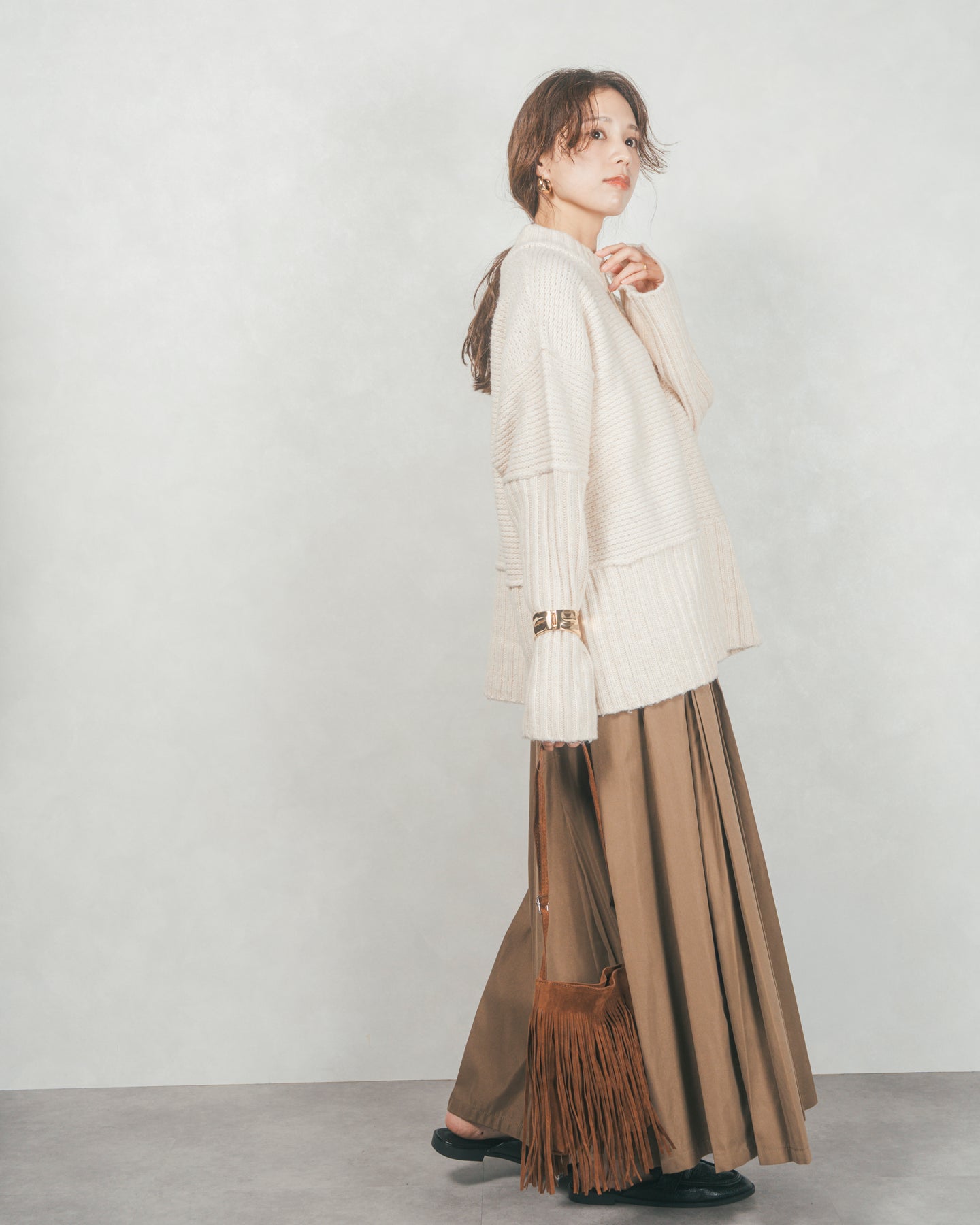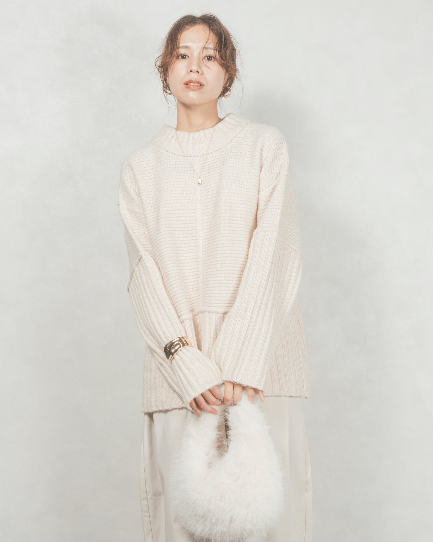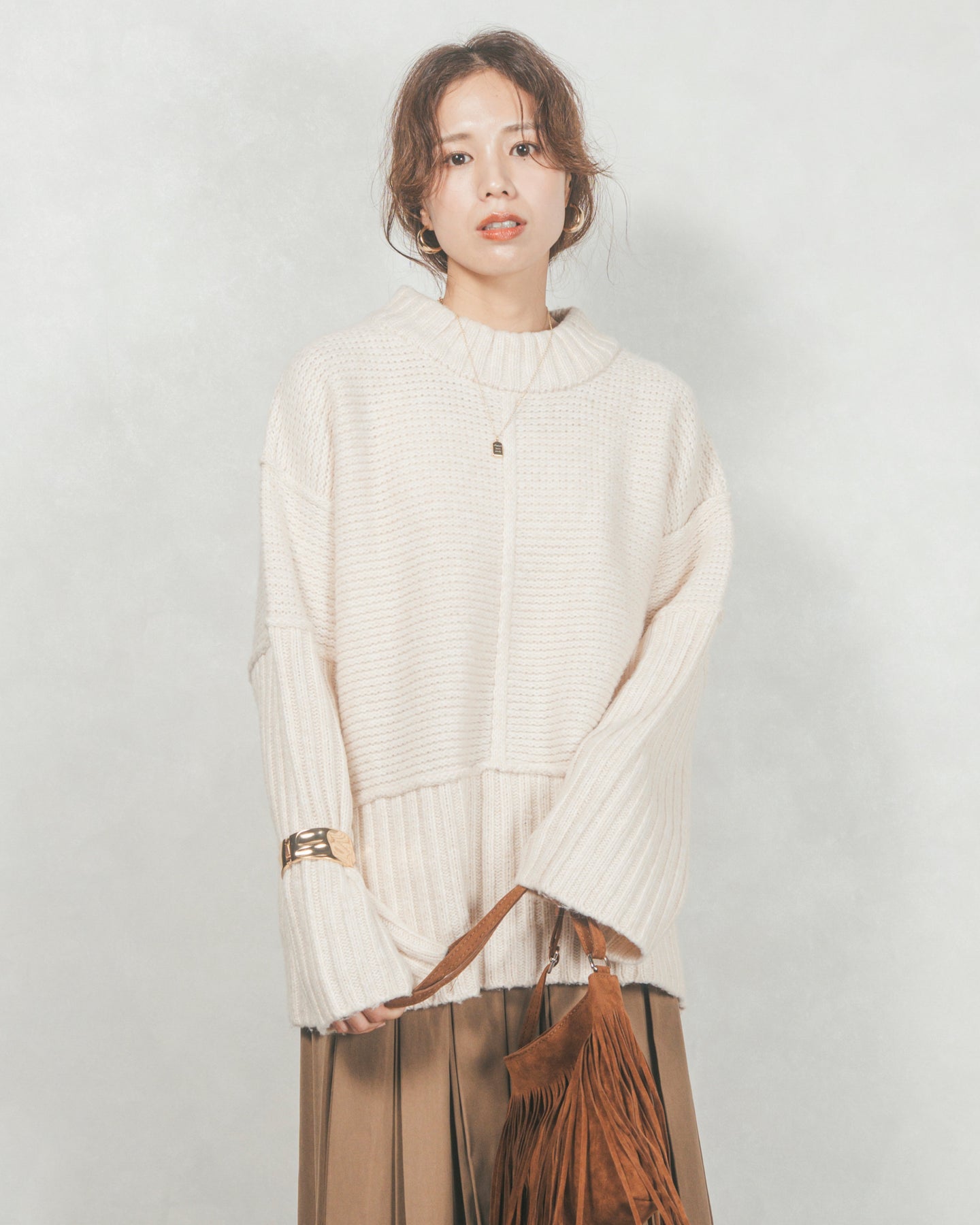 袖と裾にあしらった大胆なリブ切り替えが目を引く、クルーネックニットが登場。ゆるっとしたシルエットにざっくりとした編地が絶妙な抜け感を生み出し、肩の力を抜いた大人のカジュアルスタイルを演出します。