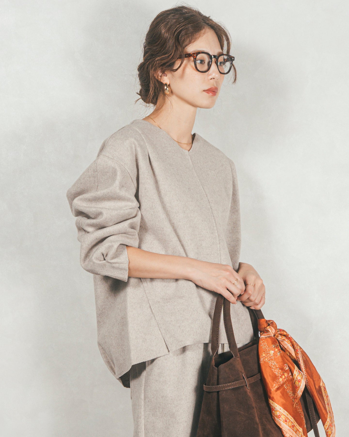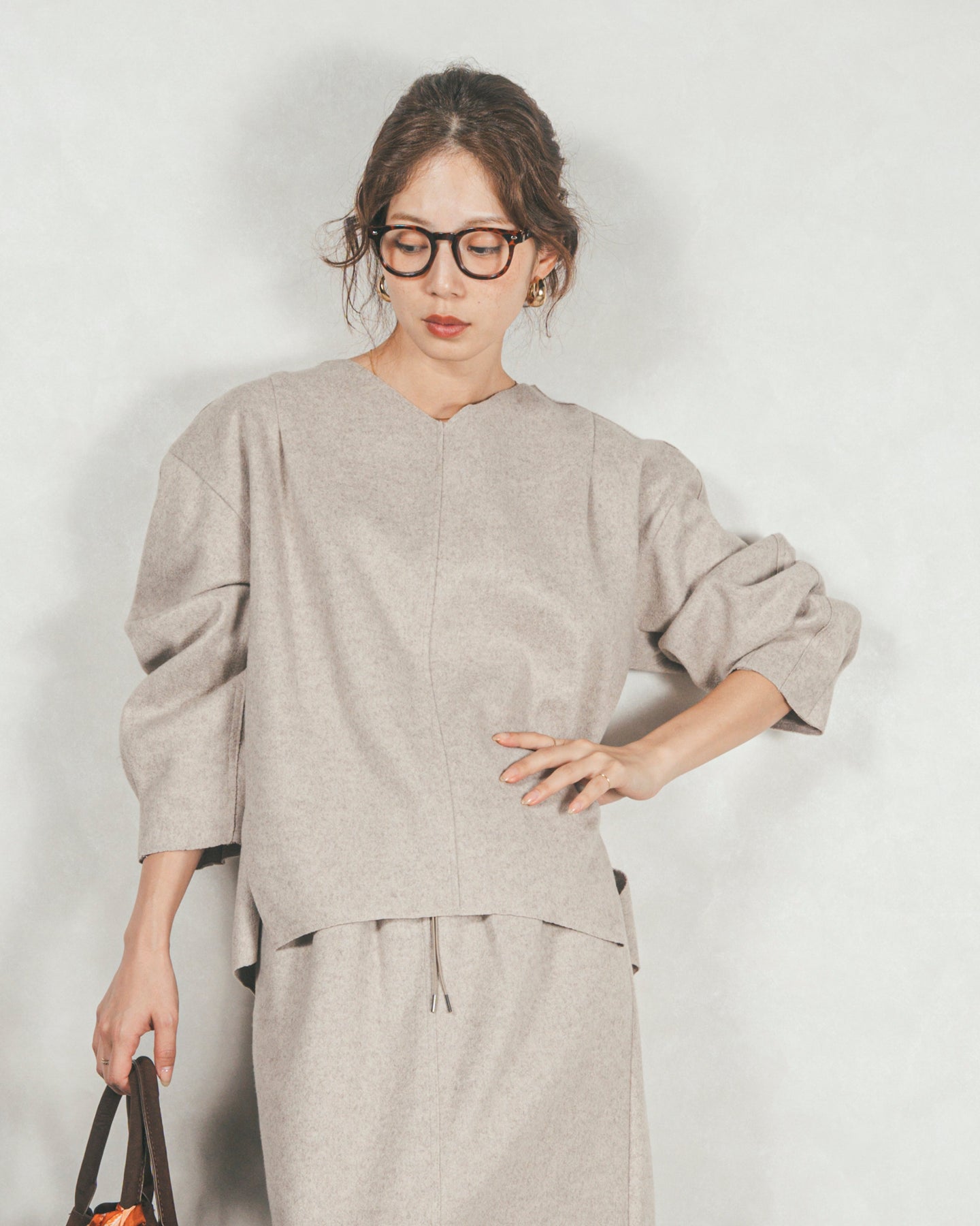 同素材のスカートと合わせてセットアップで着用すれば、きちんとした印象の今っぽいスタイルが完成。あえて裏側と微配色になっているので、袖口をくるくると捲り上げれば抜け感が出ます。