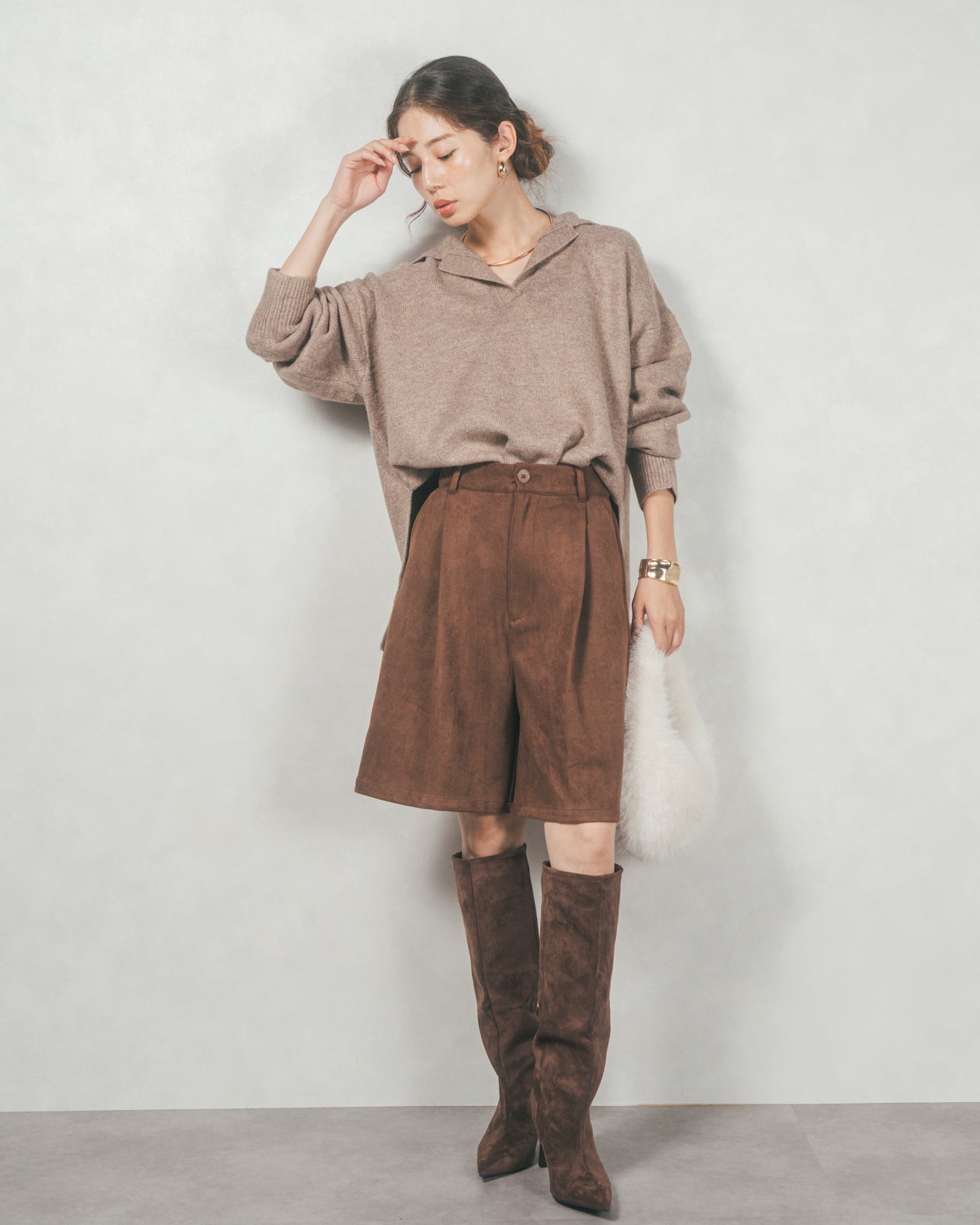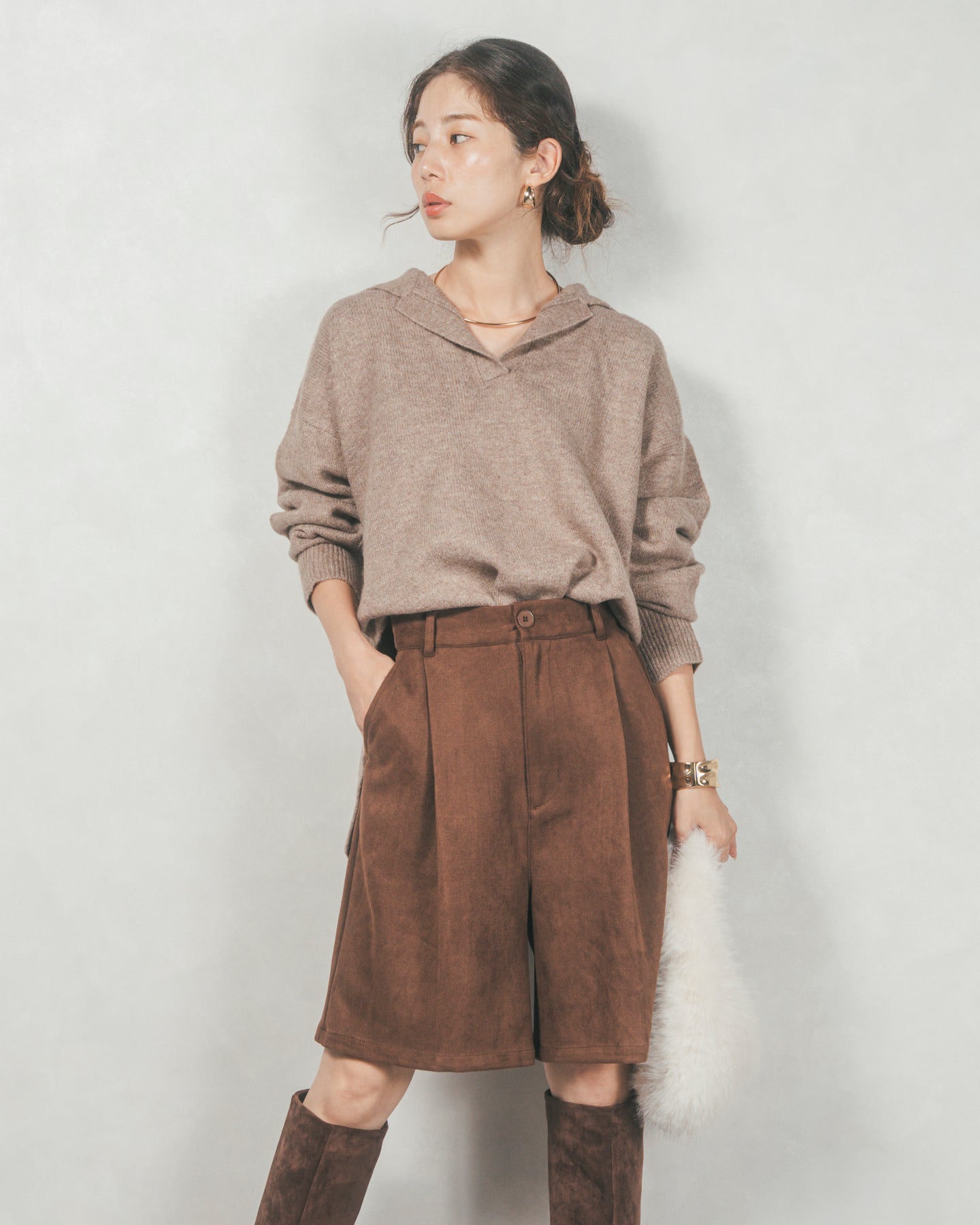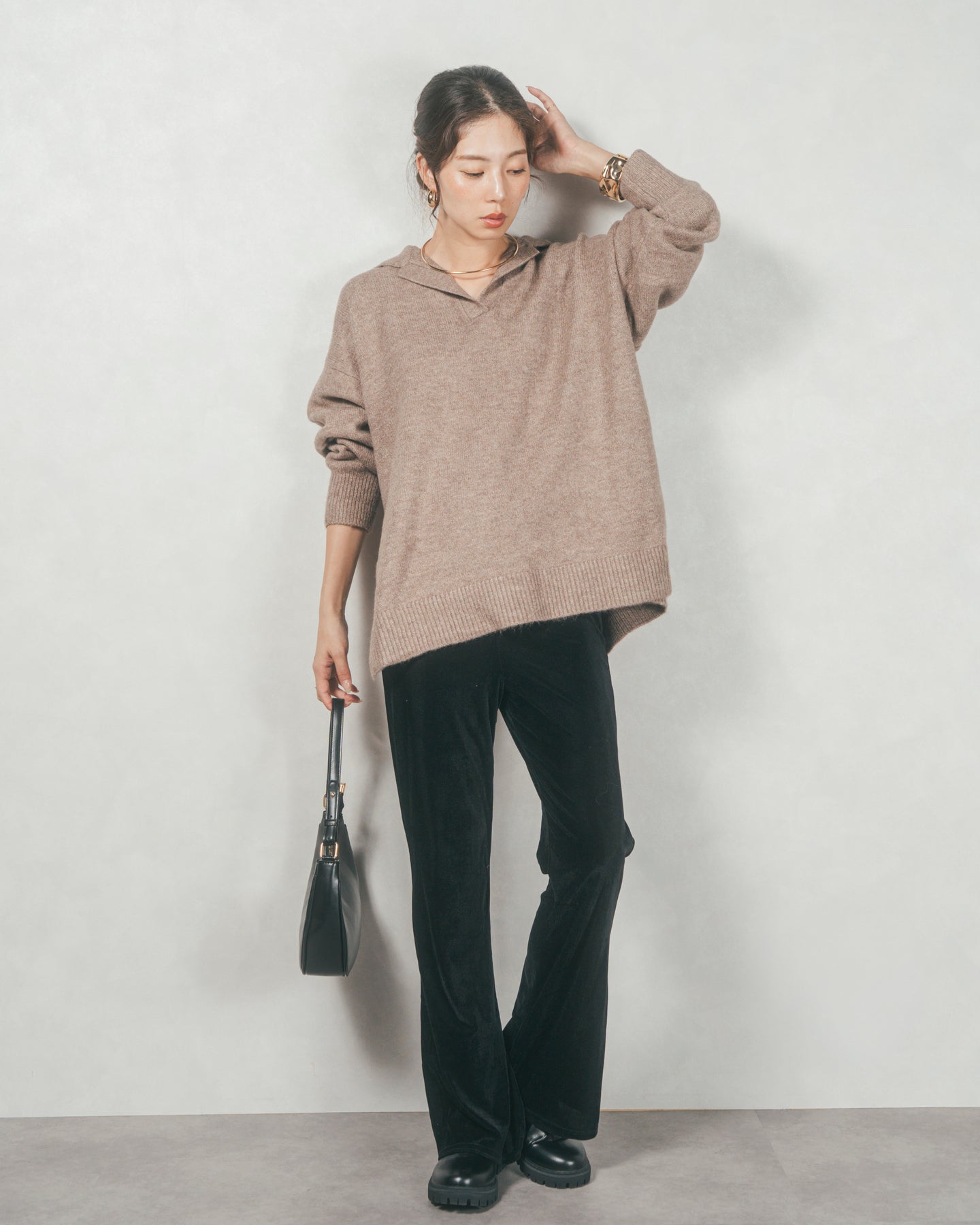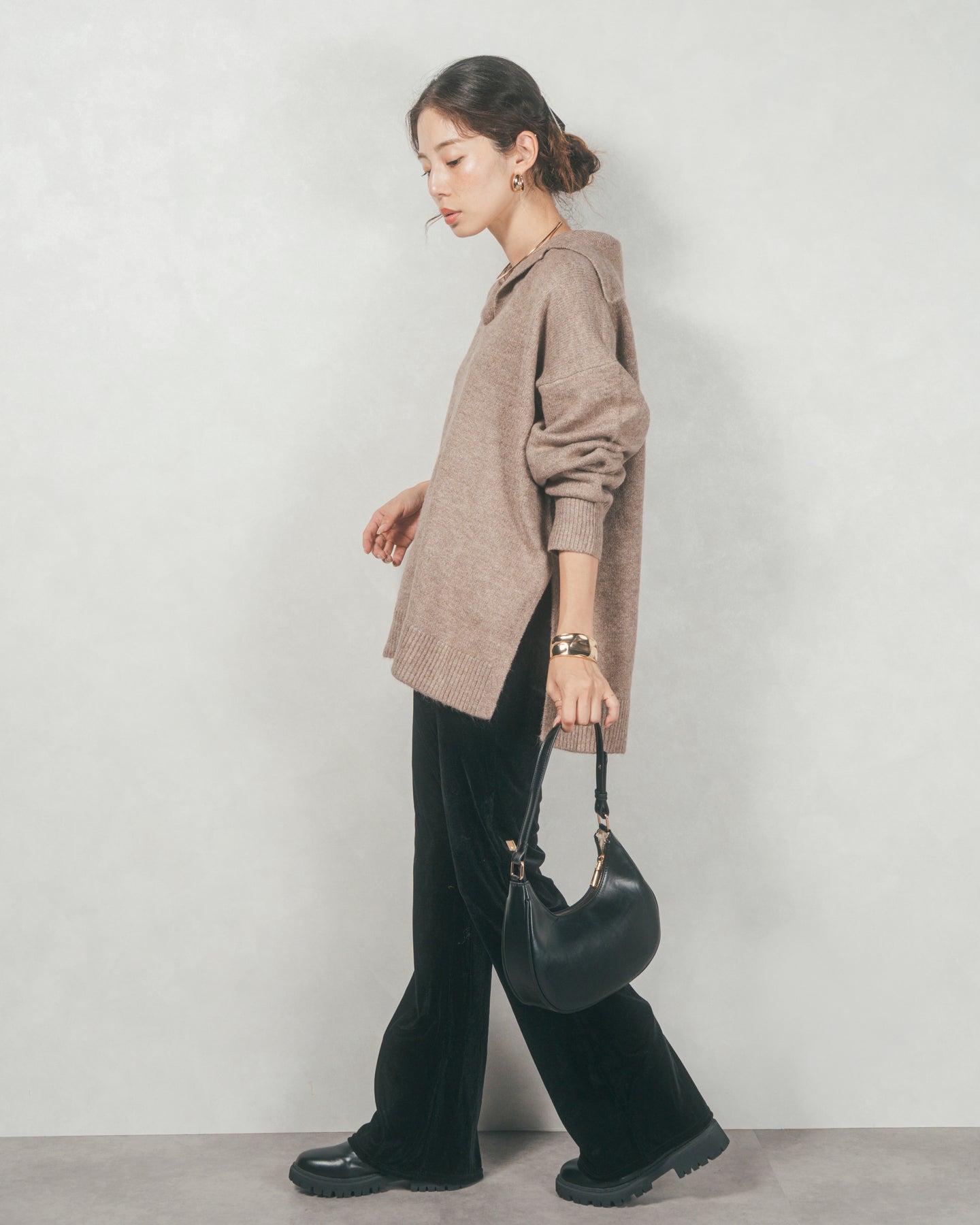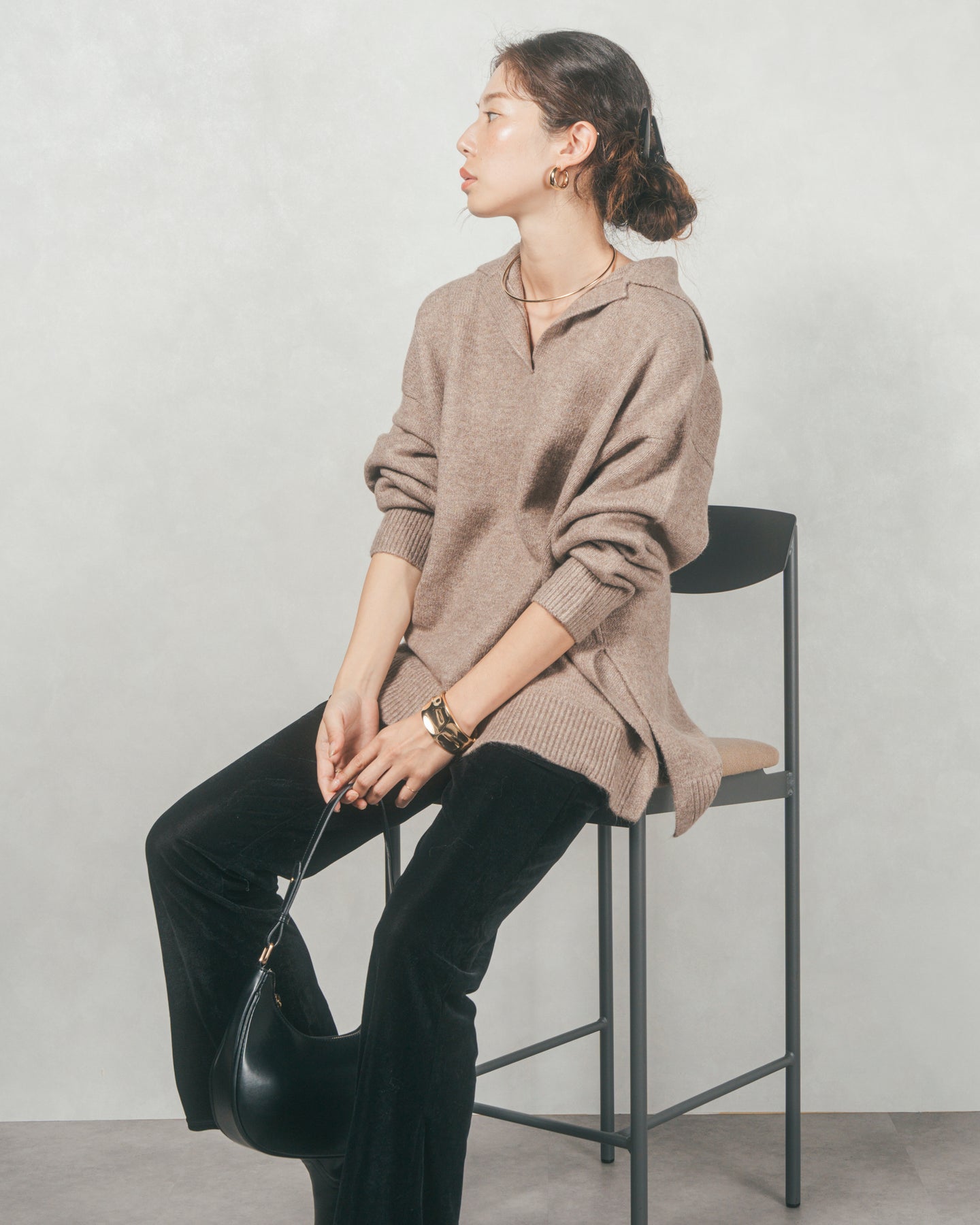 ゆるっとラフなシルエットに、深めのサイドスリットを入れることで、動きのある抜け感を演出。襟付きのスキッパーネックがカジュアルすぎず、ほどよく上品な印象に仕上げてくれます。