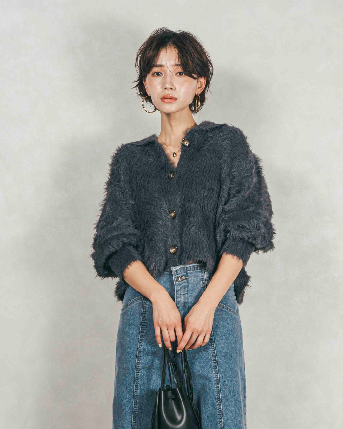 フェザーヤーン 衿付きカーディガン (CHACOAL)