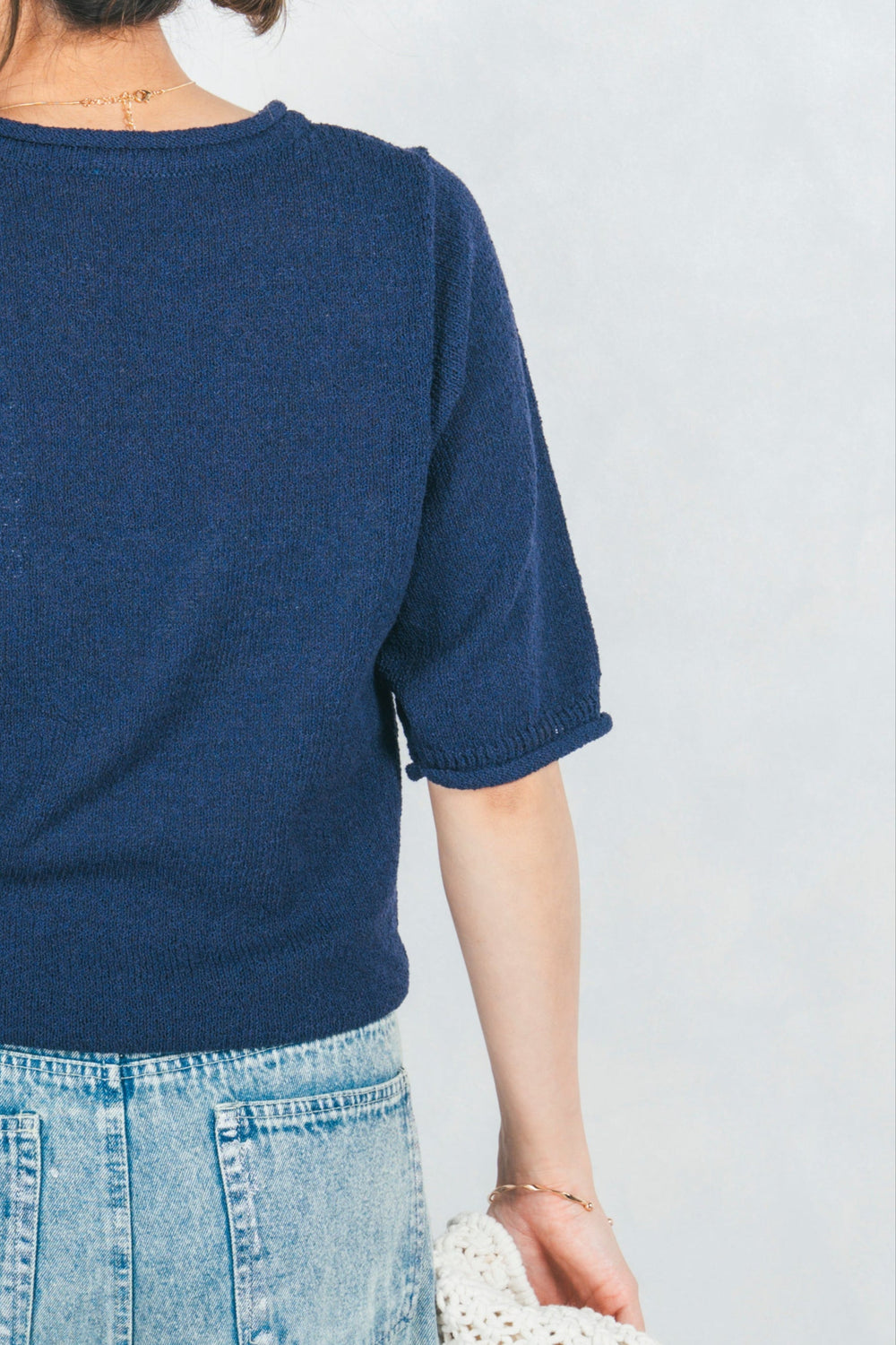 立体感のある糸を使った、ネックと袖の裾のカールが可愛い、ハーフスリーブニットです。身幅はすこしコンパクトですが、肘が程よく隠れる袖丈感と袖幅で、華奢見えするアイテムです。さらりと着れる素材なので、暑い時期にもぴったり。