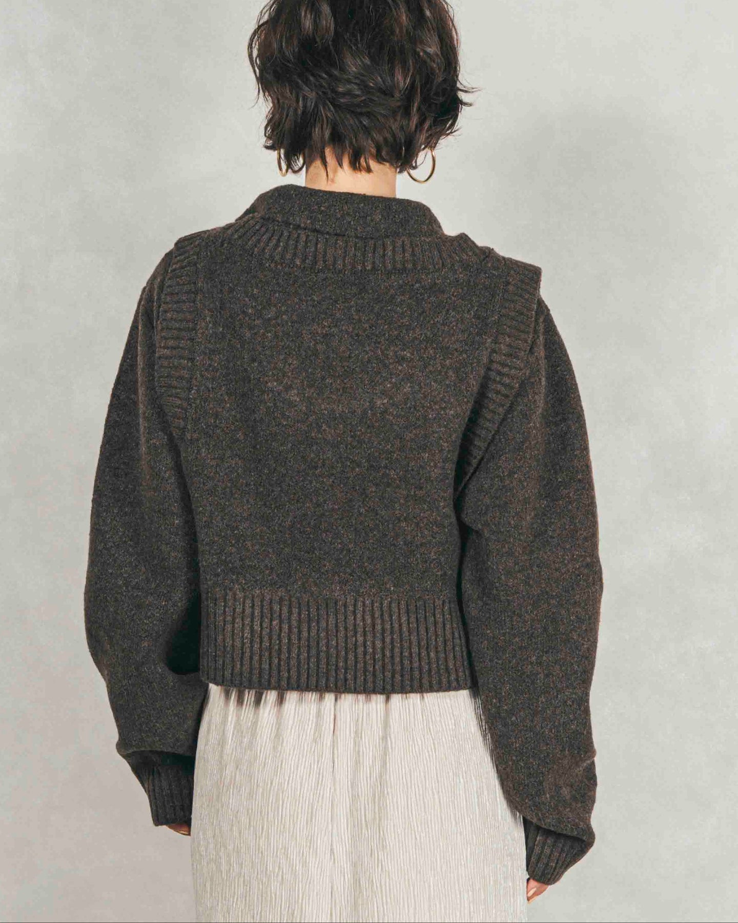 アームホールはゆったりとしているので、厚手のシャツとも合わせやすいデザインです。シャツをレイヤードしても、同素材のニットカーディガンの上に重ねても「いつもと違う」を演出できるアイテムです。