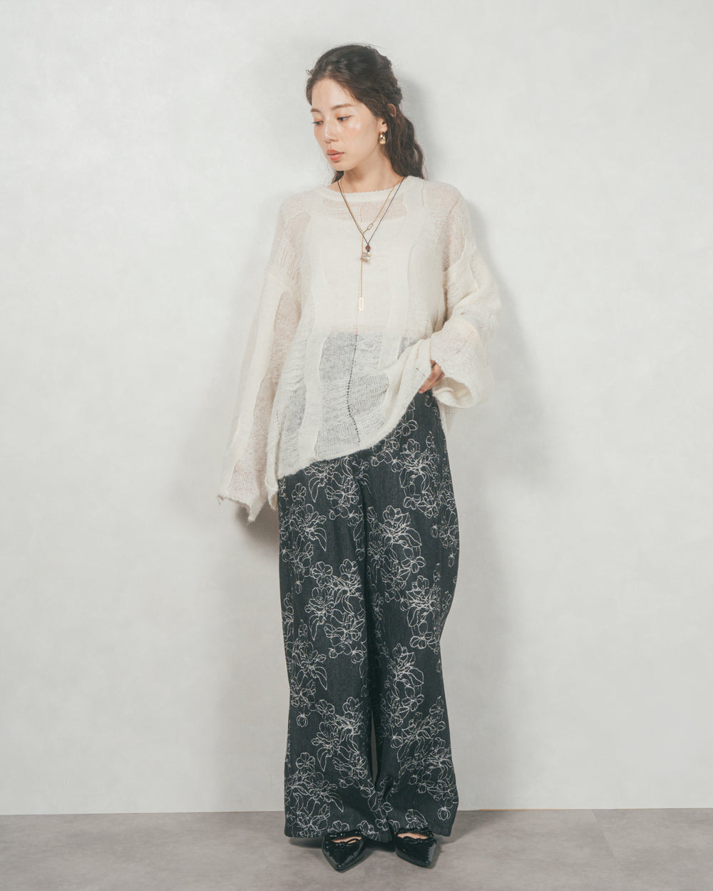 柔らかなモヘア混素材を贅沢に使用したローゲージニットプルオーバーが登場。存在感のあるパターン編みが温かみを感じさせ、秋冬のスタイリングに自然なアクセントをプラスします。