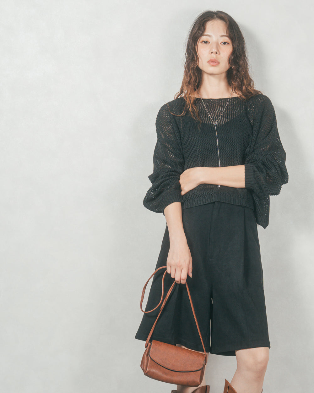 程よくルーズなシルエットとショート丈が絶妙なバランスのメッシュショートプルオーバー。軽やかなポリエステル素材で、ほんのり透け感のある編み地が抜け感を演出。さらっとした風合いで肌馴染みがよく、シーズンを問わず快適に着こなせます。