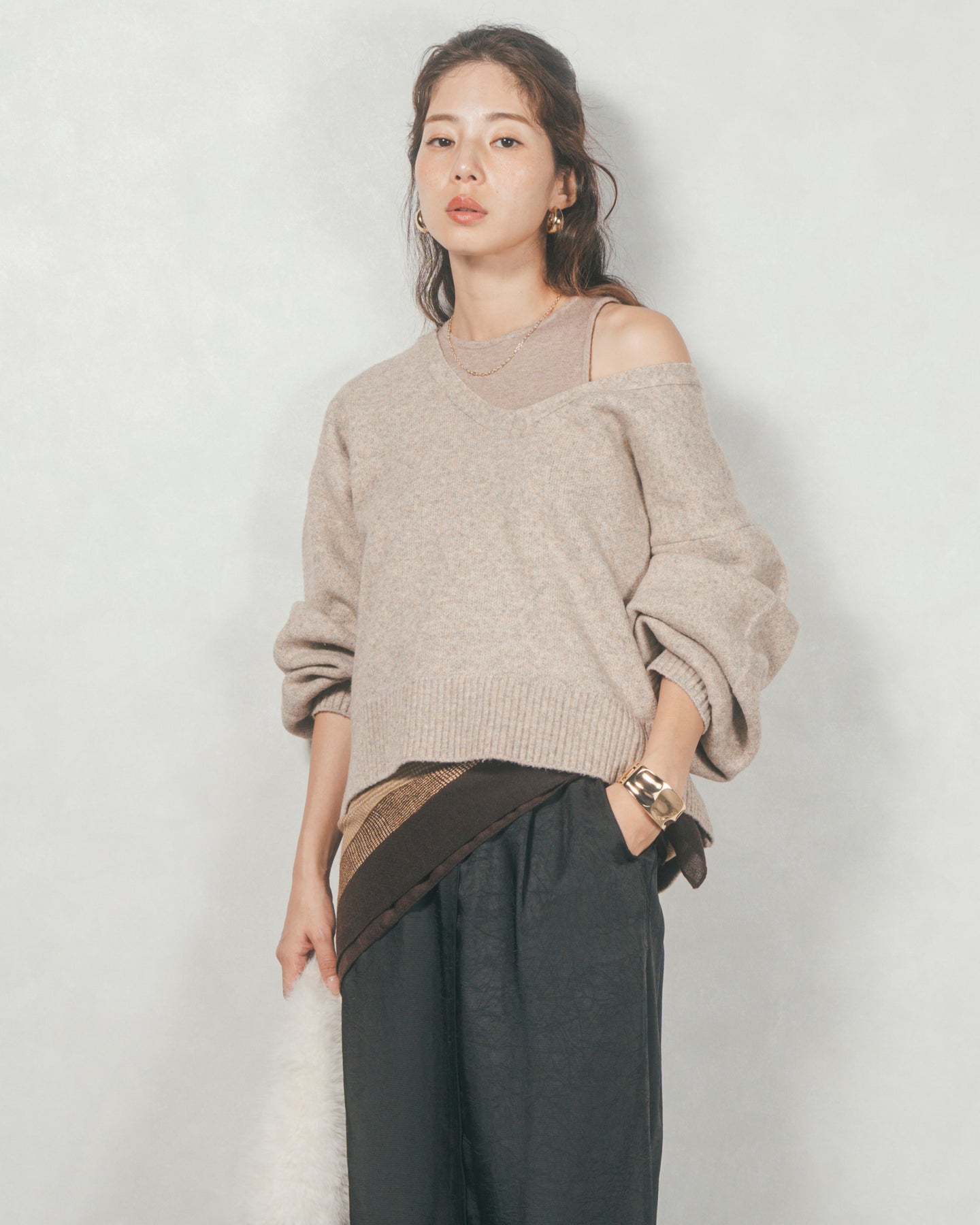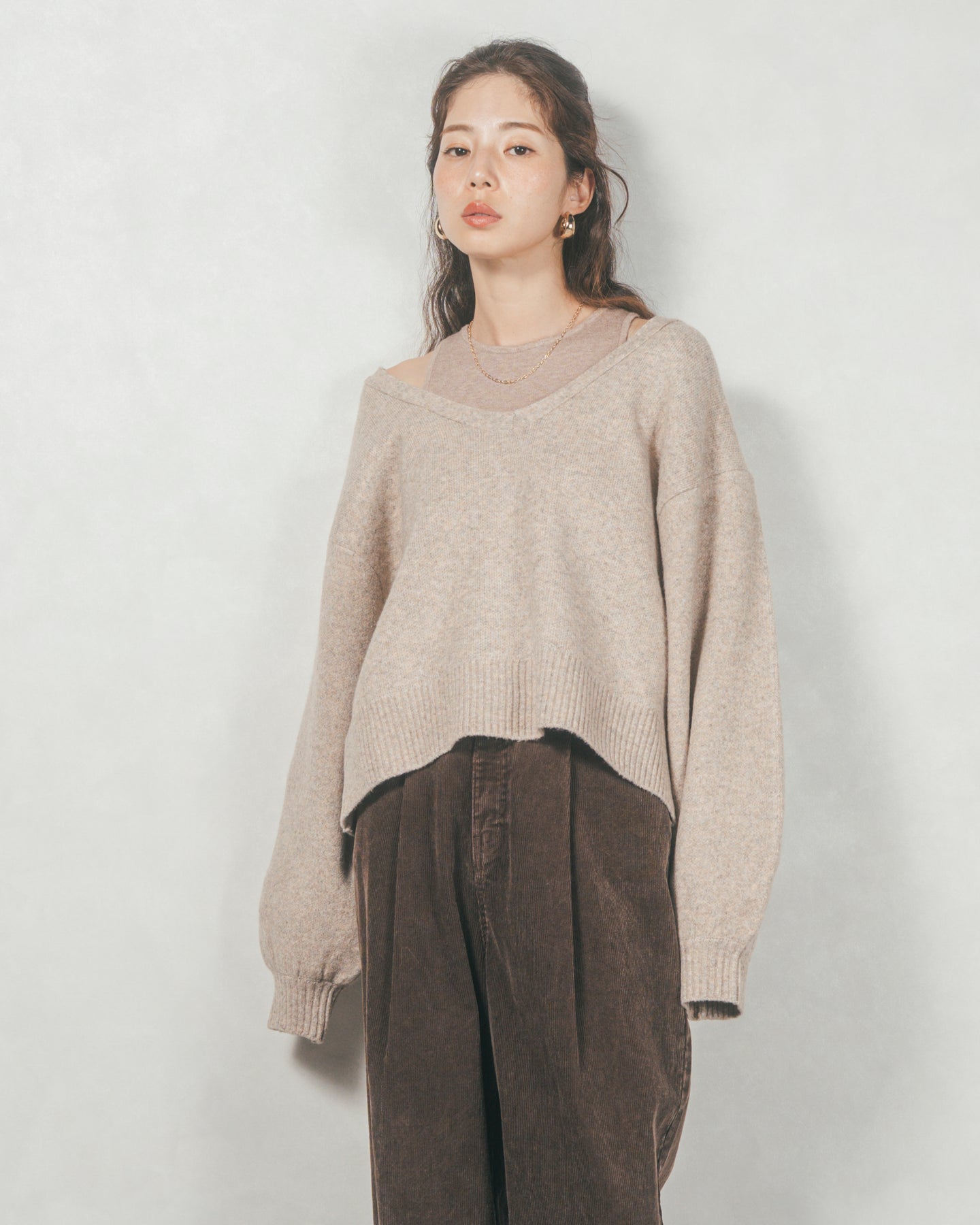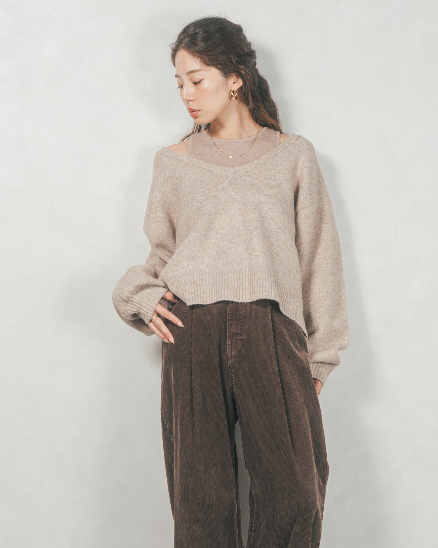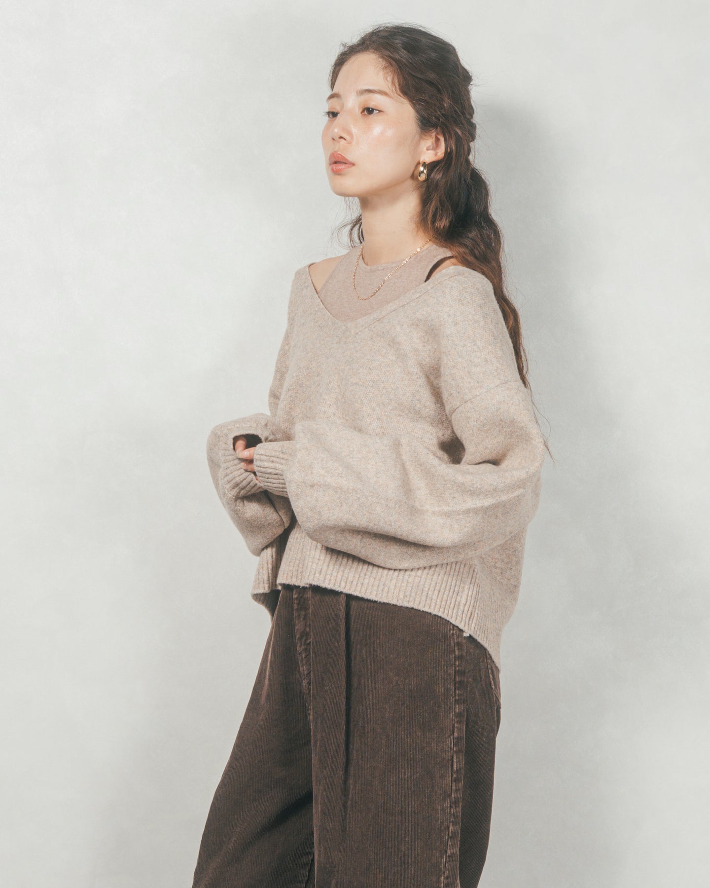 メランジVネックニットレイヤードセット(GREIGEx BEIGE)