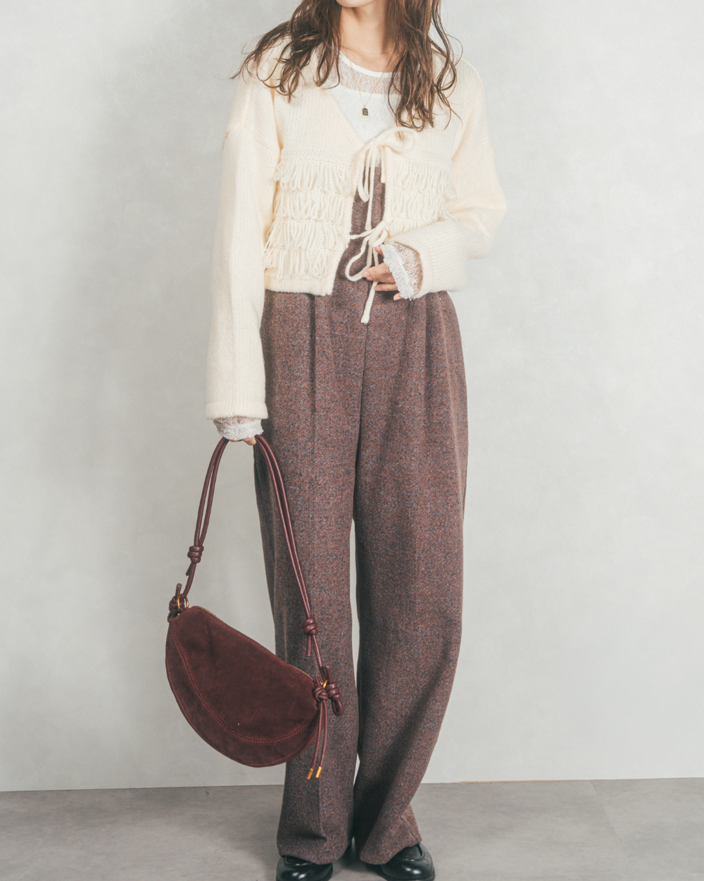 [SET]ループ編みフリンジカーディガン+Tweedベロアサロペット(2SET)