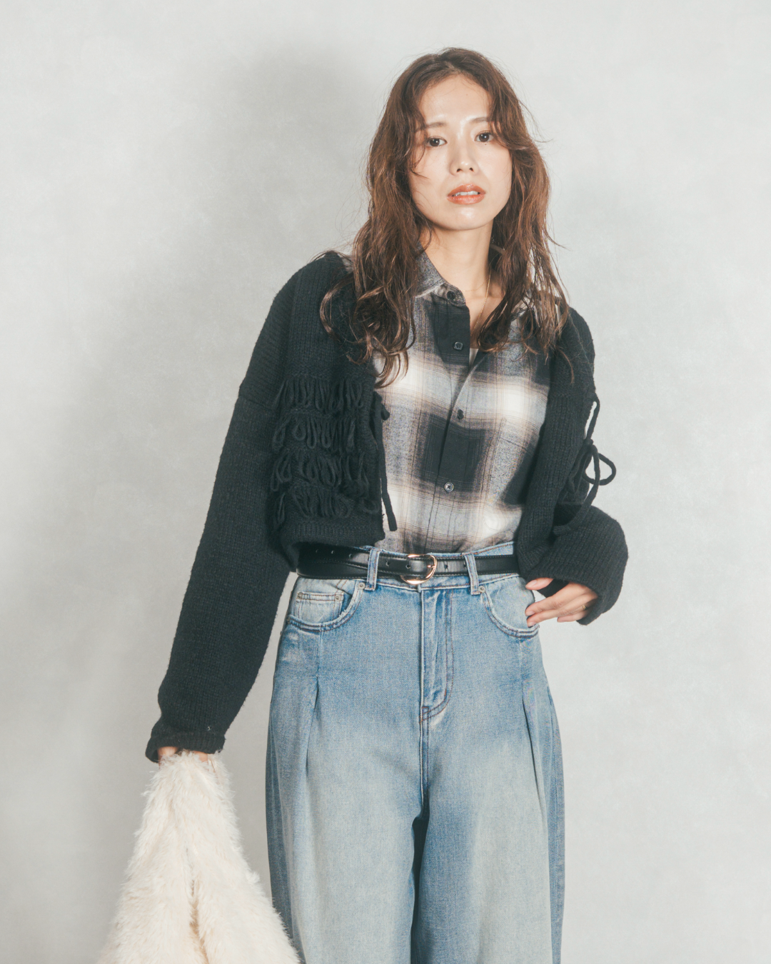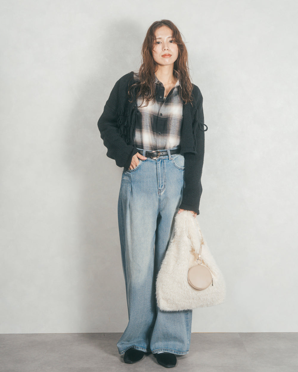 [SET]ループ編みフリンジカーディガン+センターシーム リラックスワイドデニム(2SET)