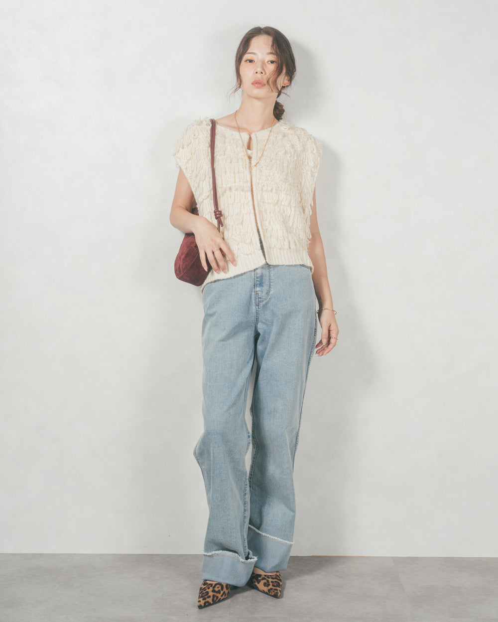 [SET]ループ編みフリンジニットベスト+アジャストロールアップストレートデニム(2SET)