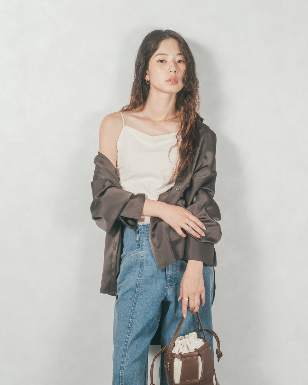 [SET]マットサテン タックシャツ+センターシーム リラックスワイドデニム(2SET)