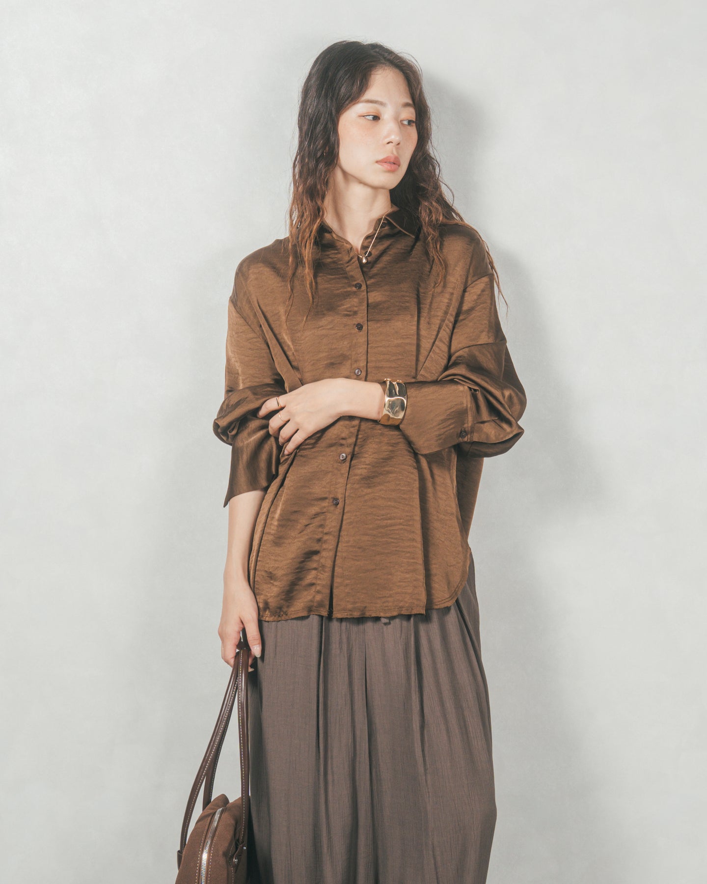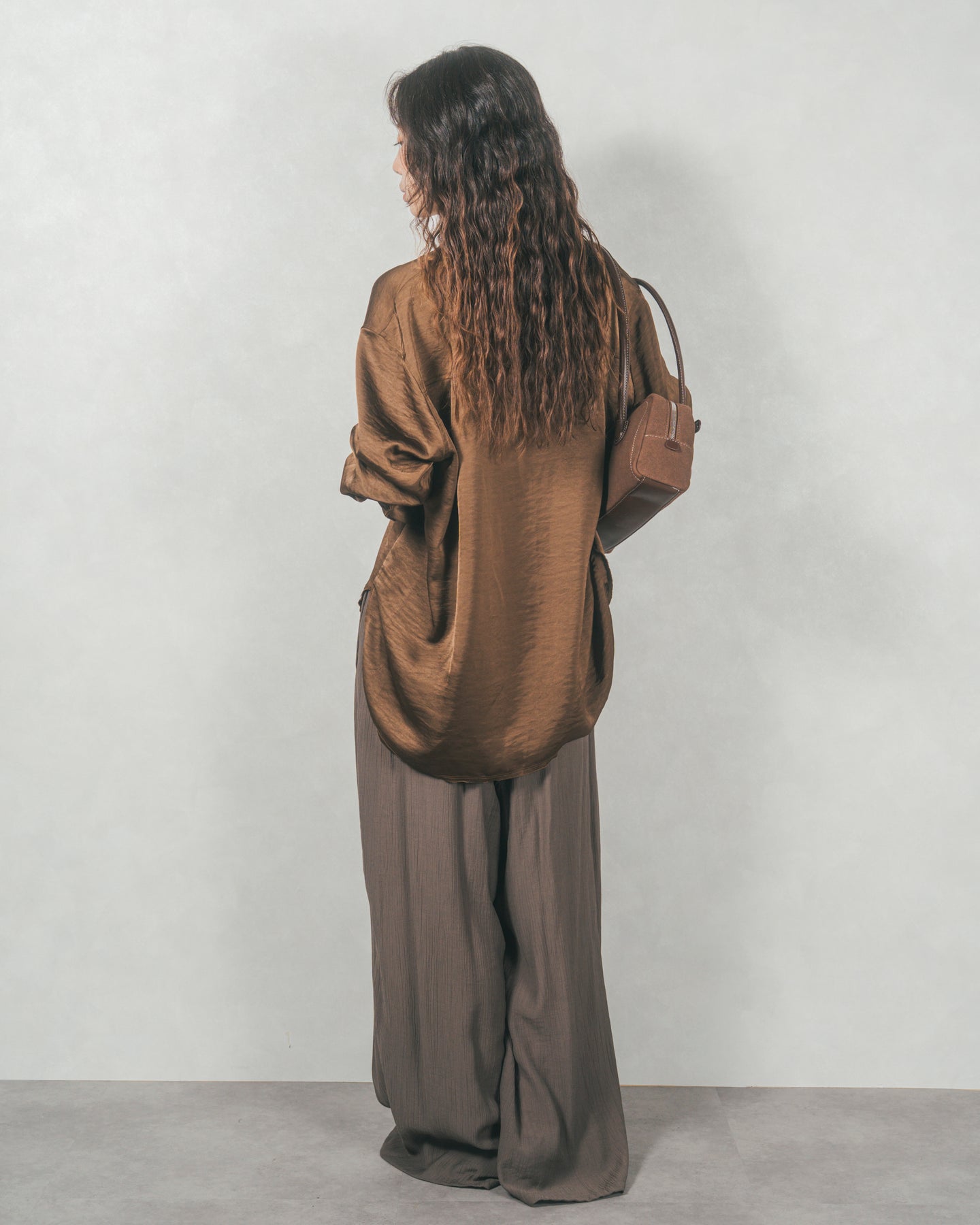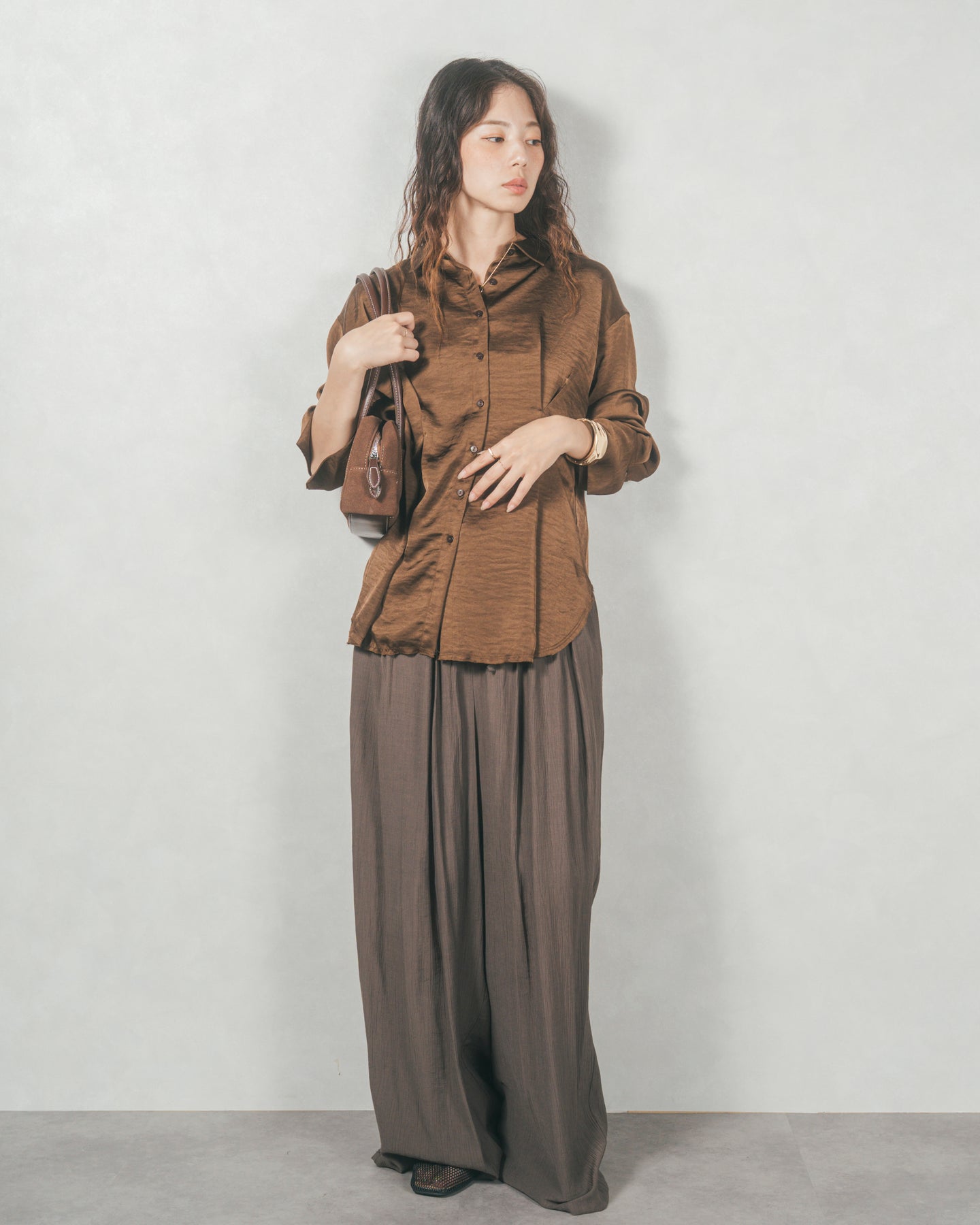 程よい光沢のマットサテンにワッシャー加工を施すことで、控えめながらも表情豊かな質感に仕上げました。トレンド感のあるカットオフ仕様の裾は、抜け感を演出しつつ、ダブルステッチで丁寧に仕上げています。(※ほつれが気になる場合はカットして整えてください。)