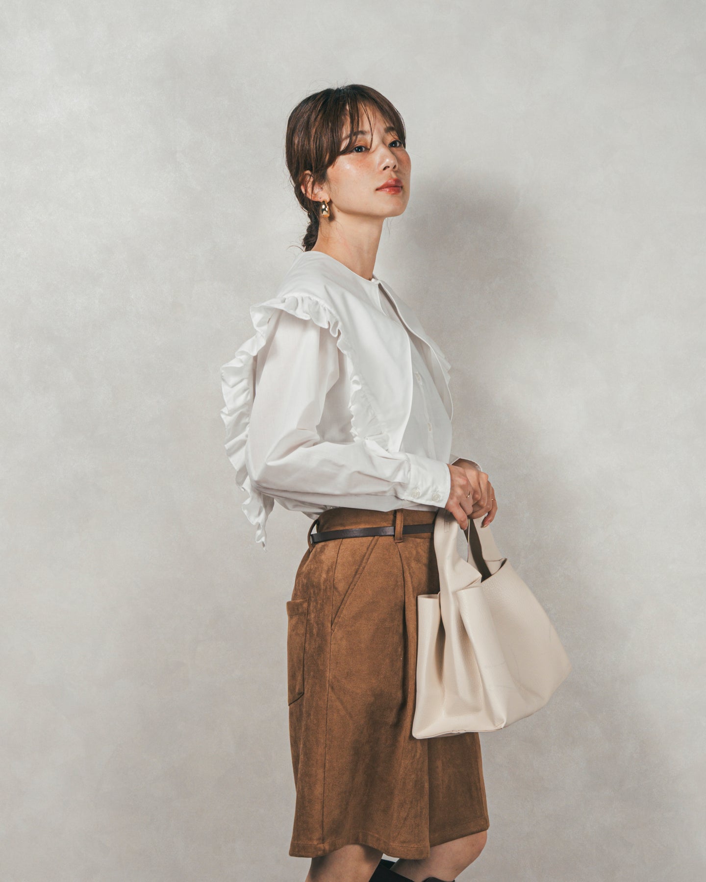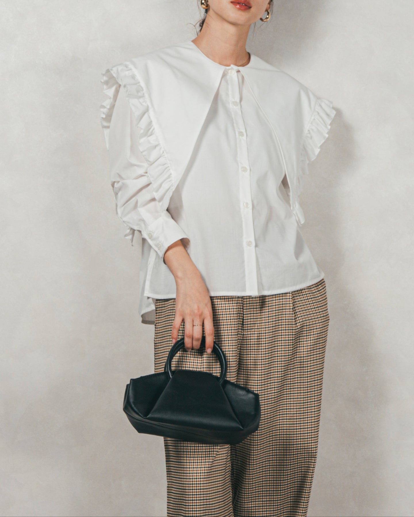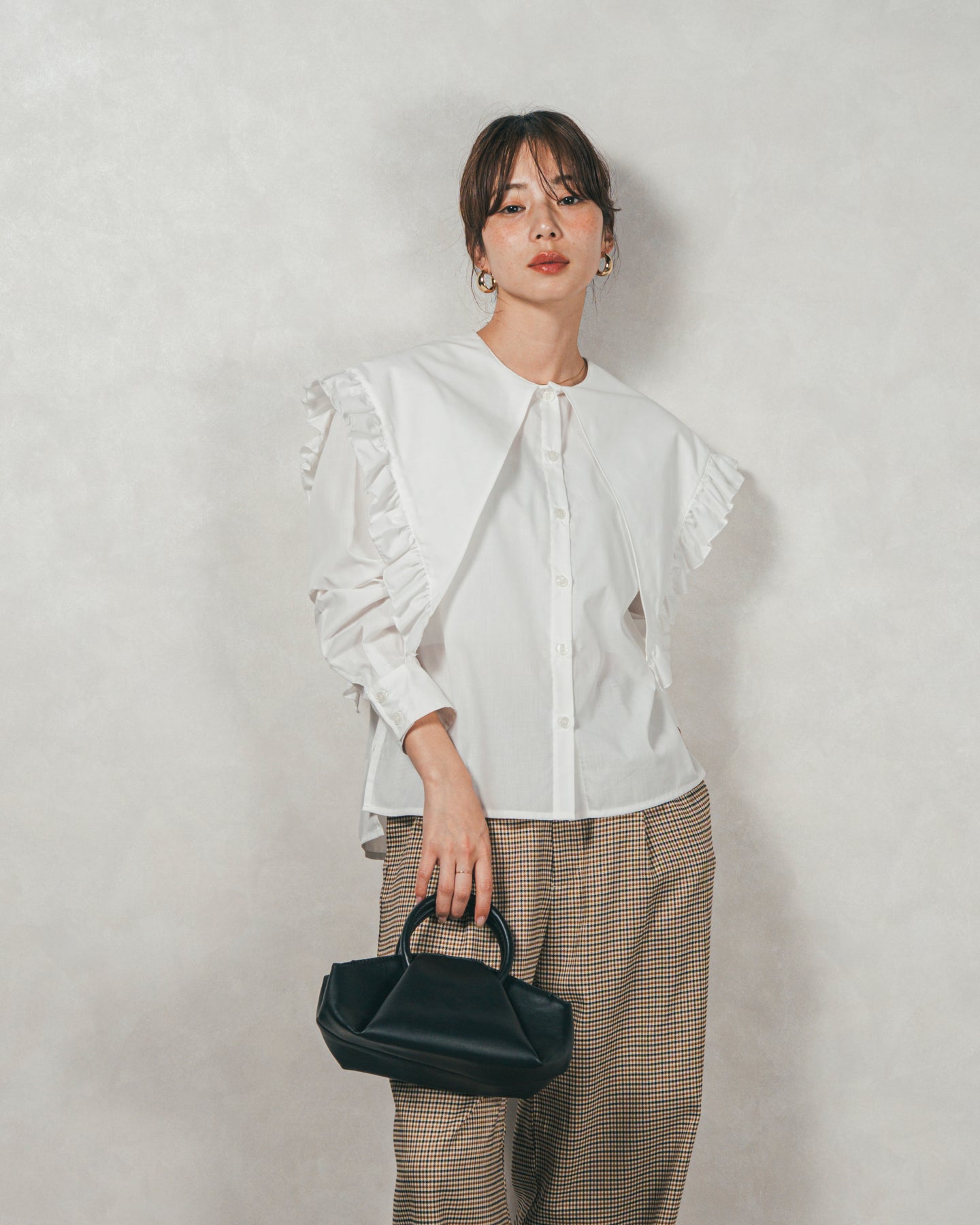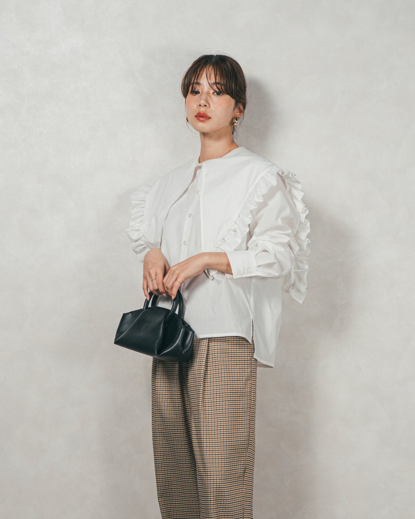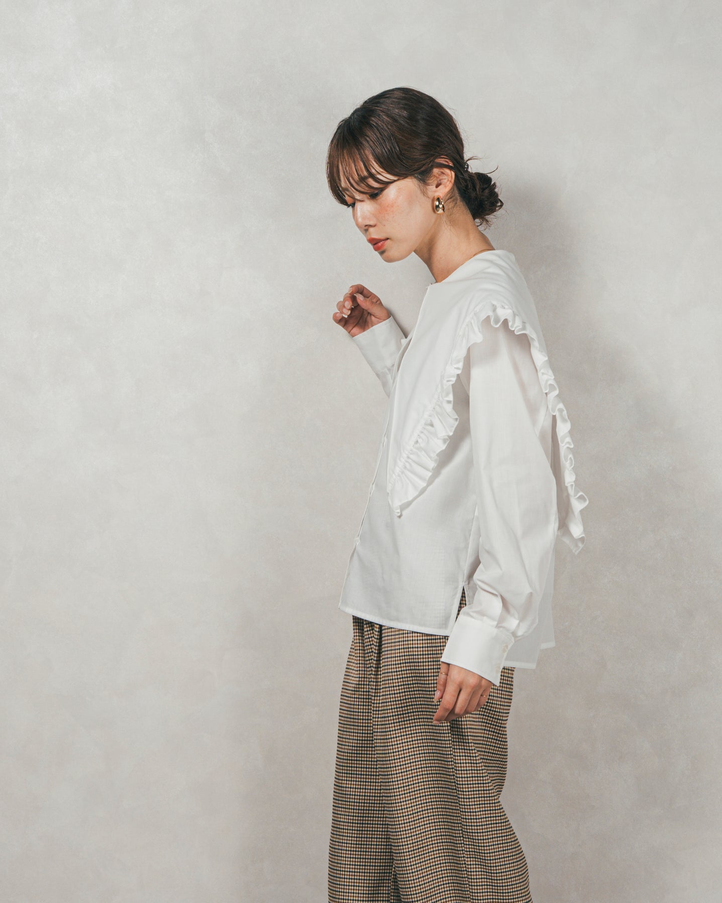 デザイン性が高いので、ボトムスはパンツでカジュアルダウンするのがおすすめ。 甘めのフリルも、パンツ合わせなら媚びない大人の可愛さに◎