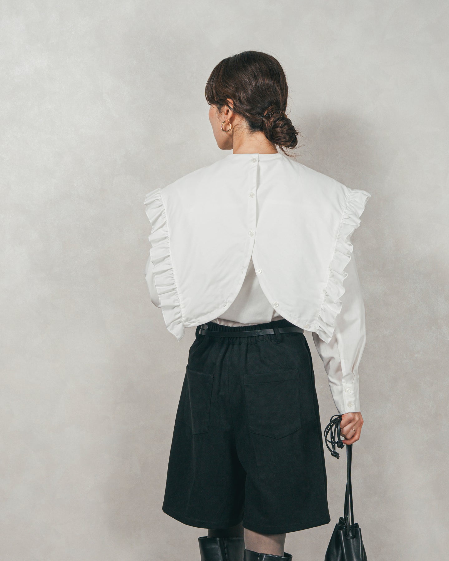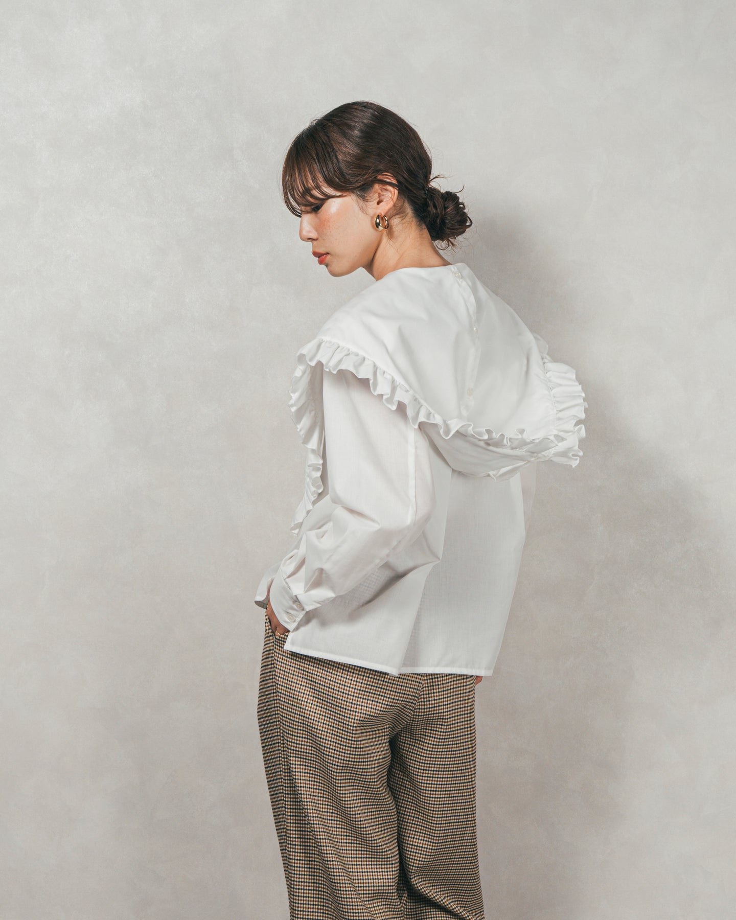 ぱっと見ると トレンドのビッグカラー(大きな襟)ブラウスですが、襟にはボタンが付いており、これを留めると立体的なフードに変わります。 上品なフリル襟とカジュアルなフードの、異なる2つの表情を一枚で楽しめる遊び心たっぷりのデザインです。また、大きなデザインの襟は小顔効果もバッチリ。