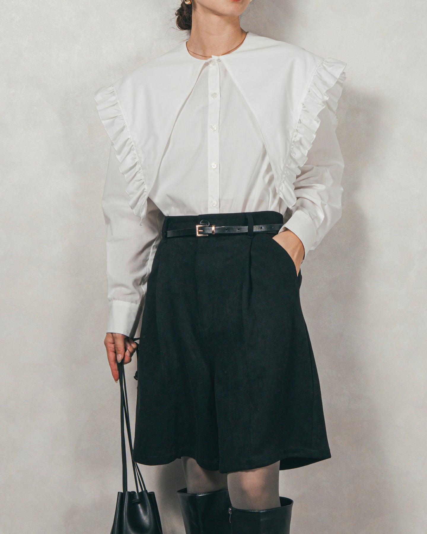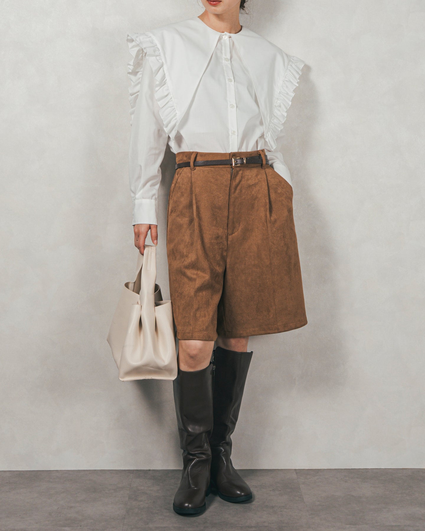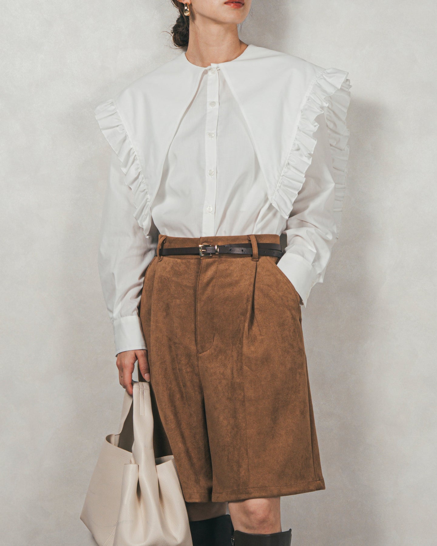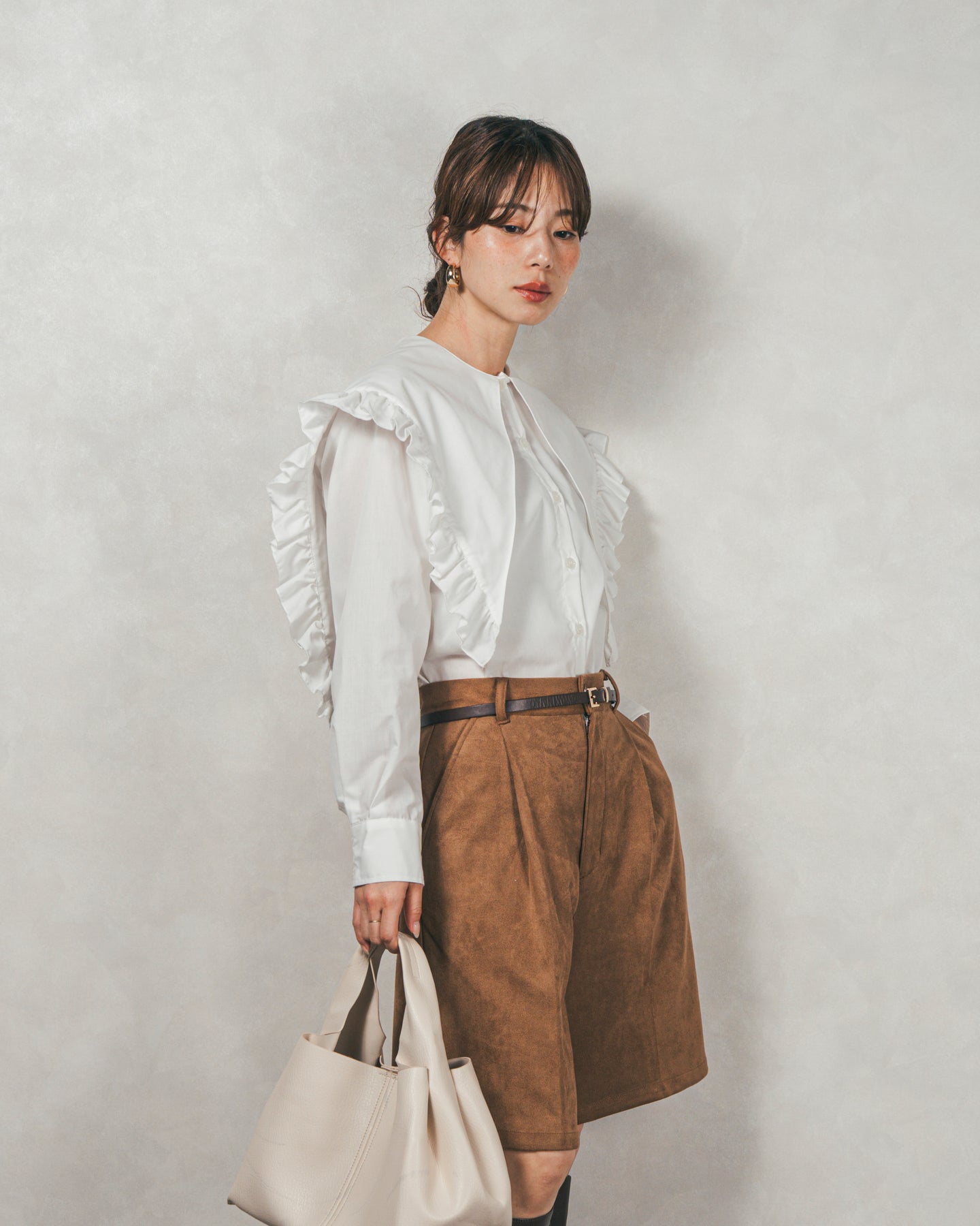 [SET]2WAYビッグフリルカラーブラウス+スウェードライクハーフパンツ(2SET)