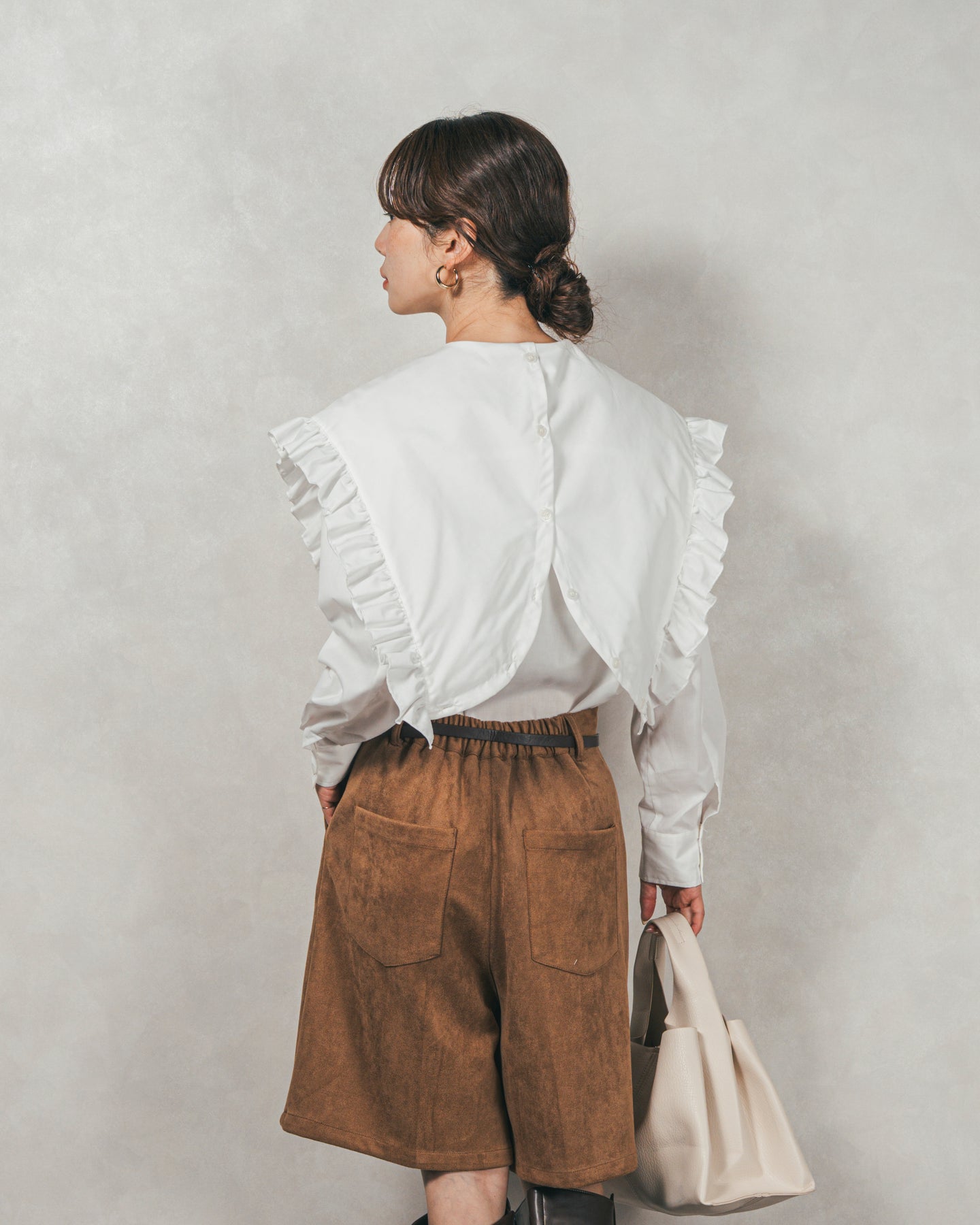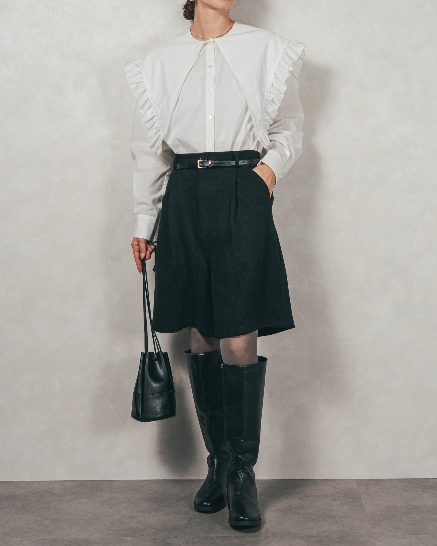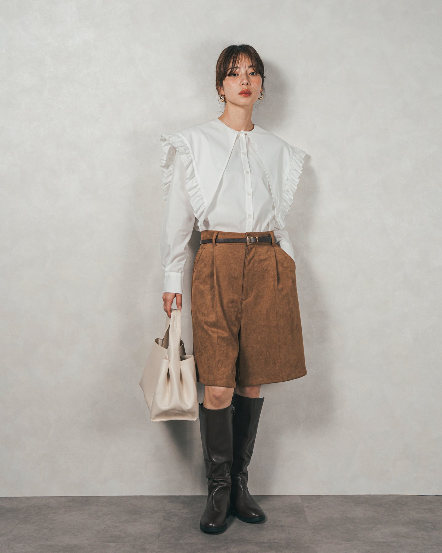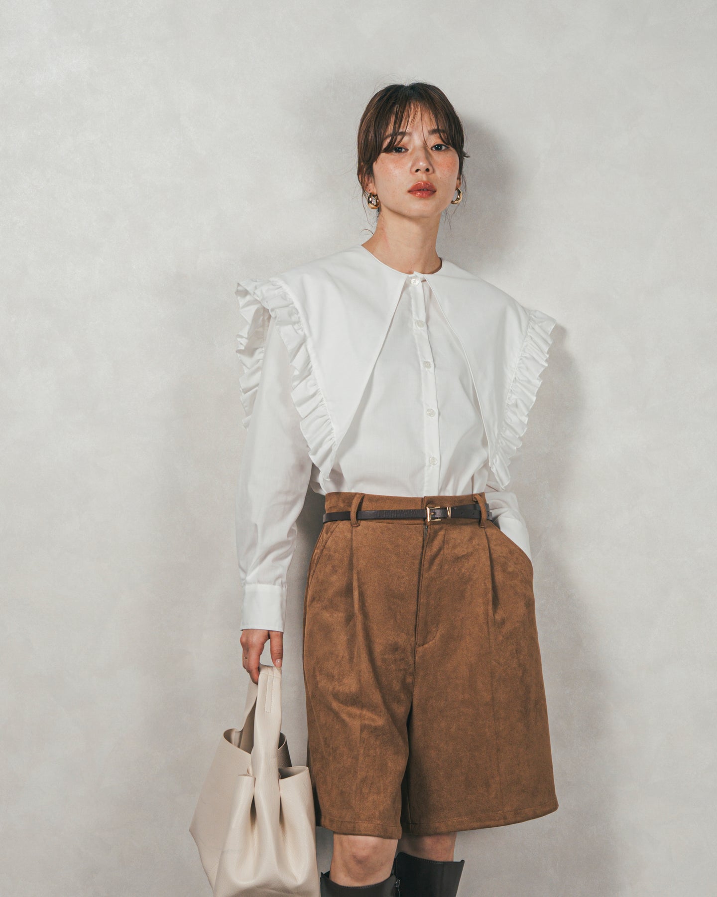 [SET]2WAYビッグフリルカラーブラウス+スウェードライクハーフパンツ(2SET)