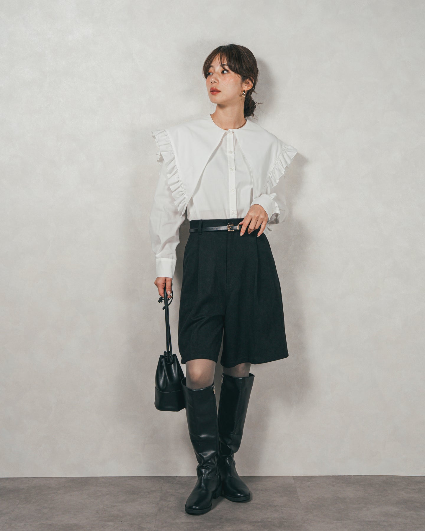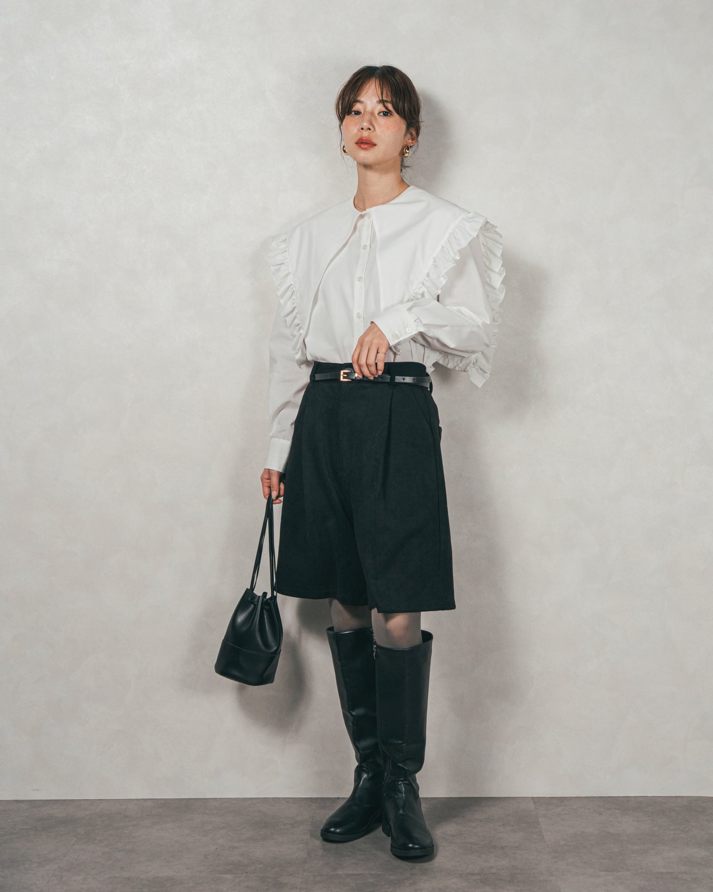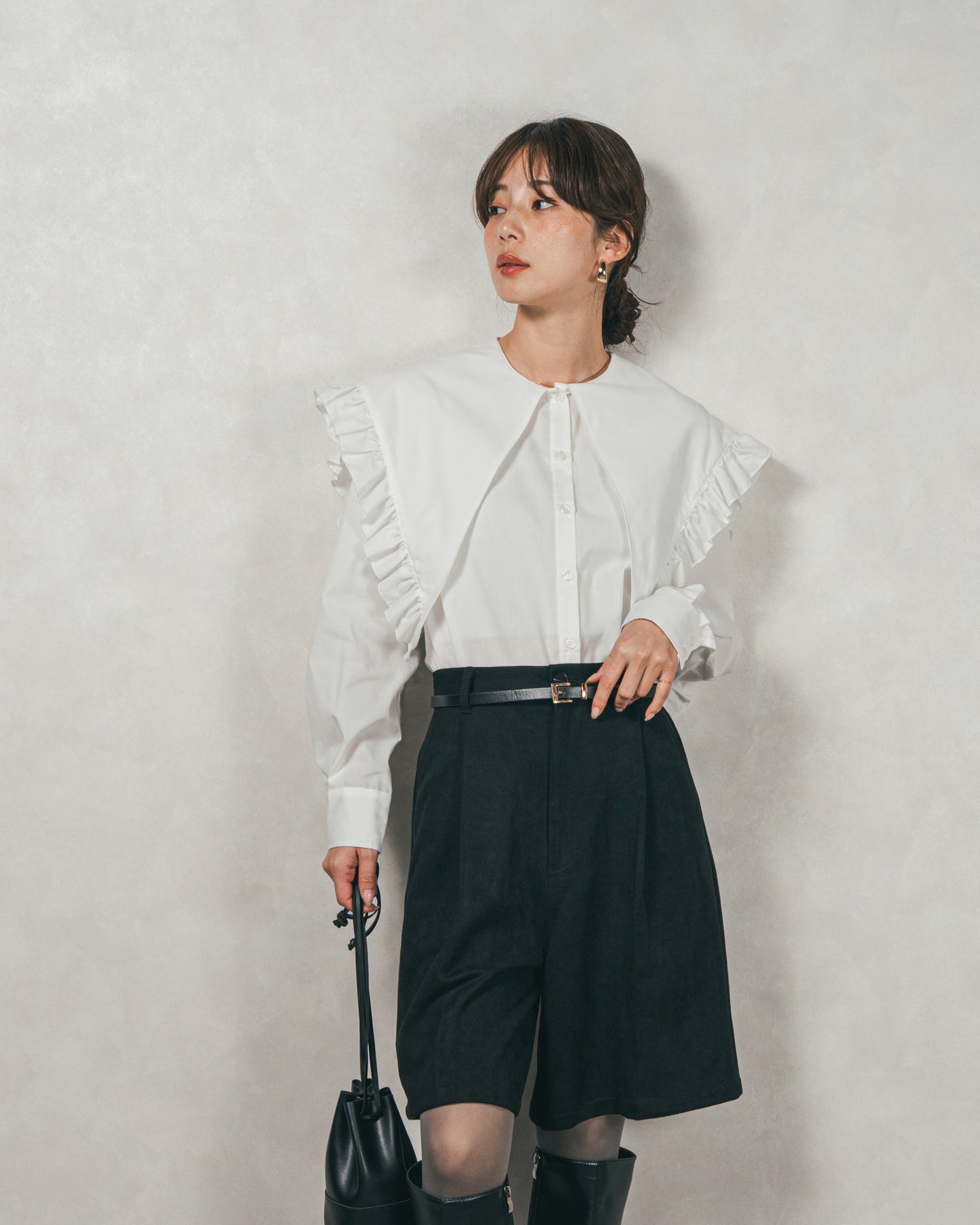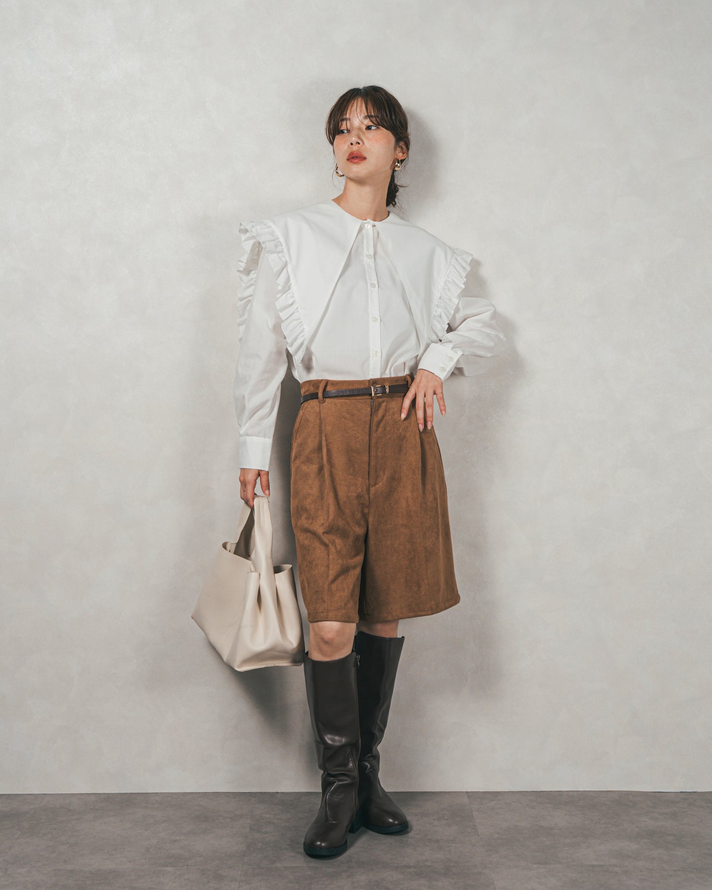 [SET]2WAYビッグフリルカラーブラウス+スウェードライクハーフパンツ(2SET)