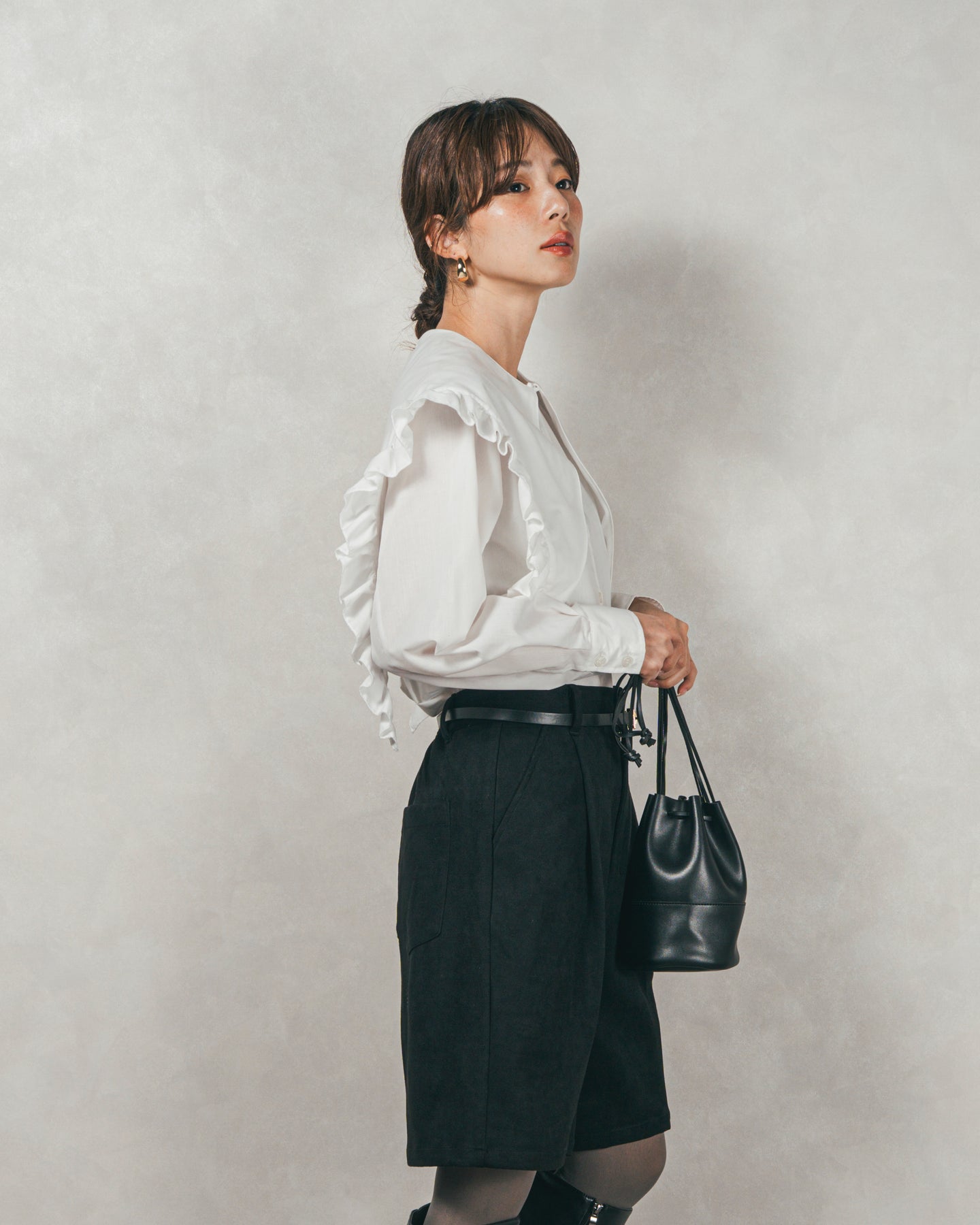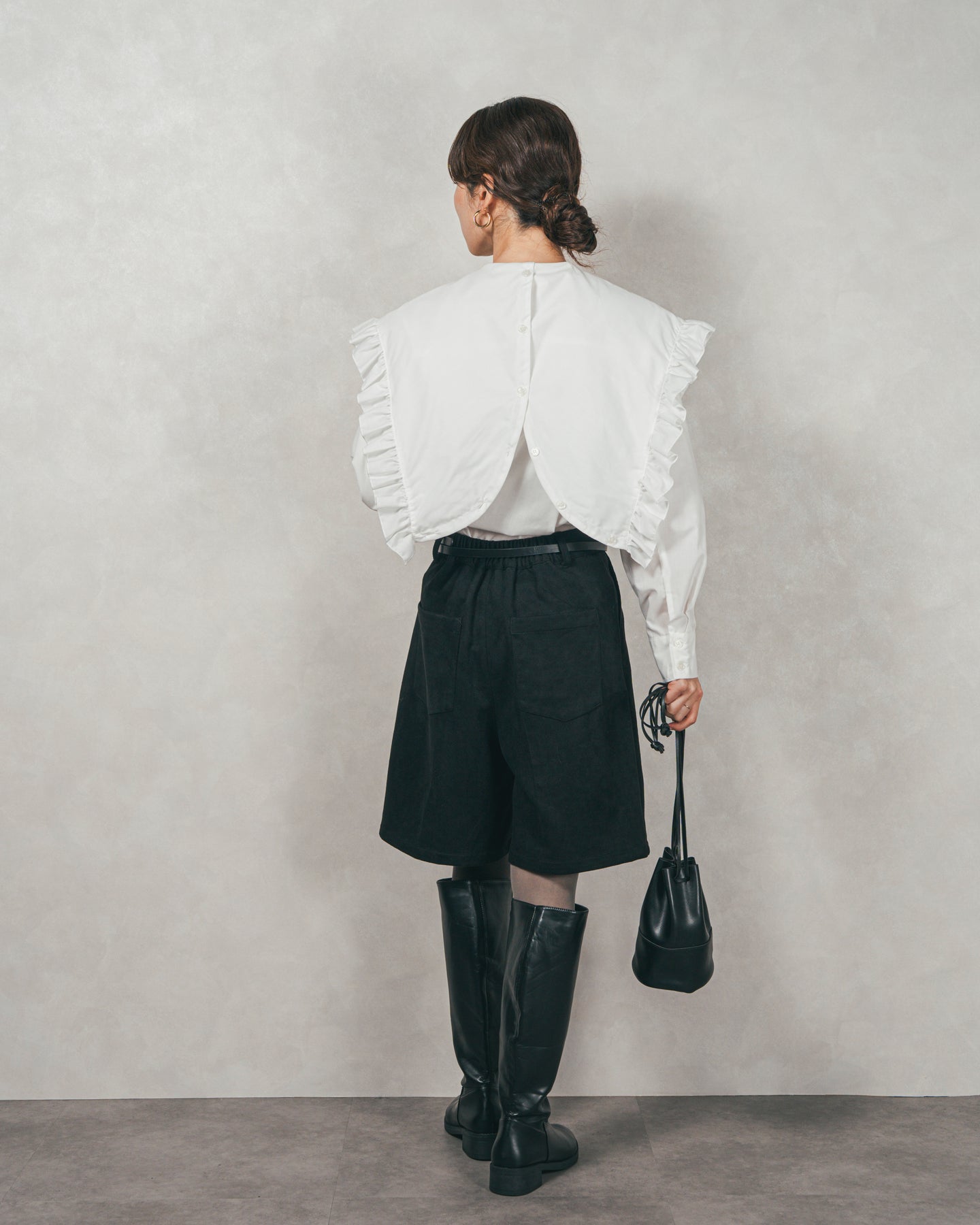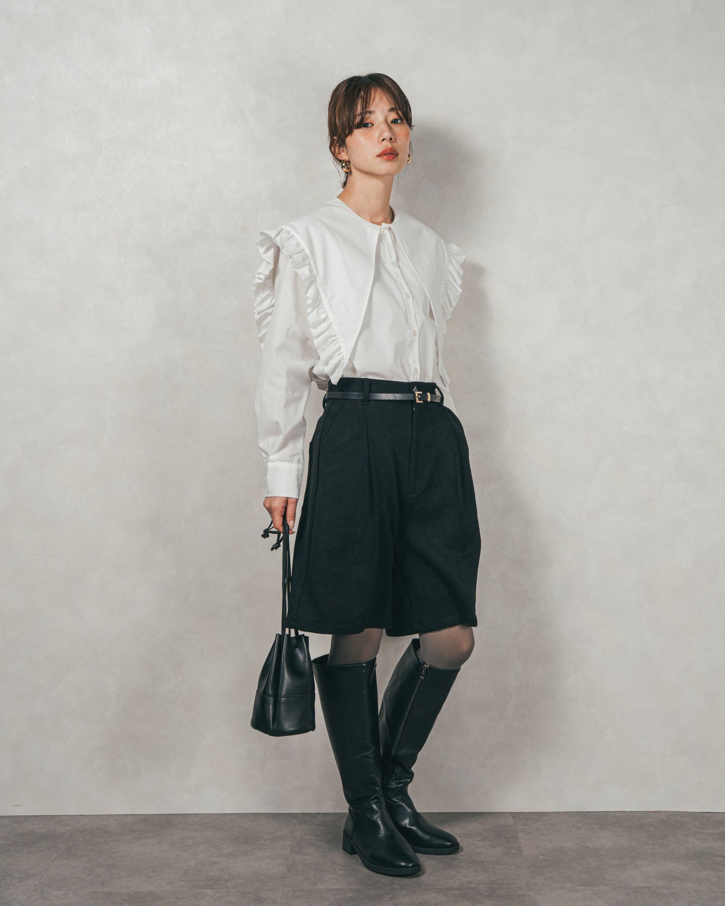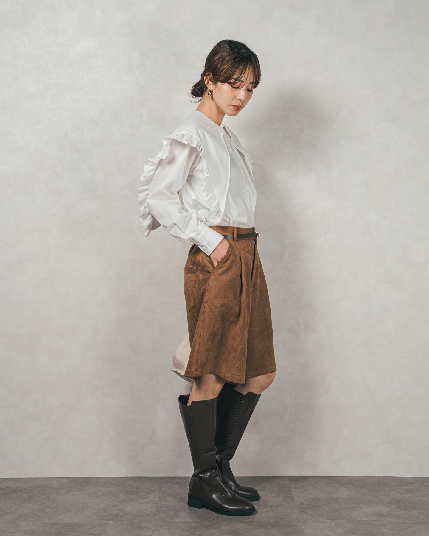 [SET]2WAYビッグフリルカラーブラウス+スウェードライクハーフパンツ(2SET)