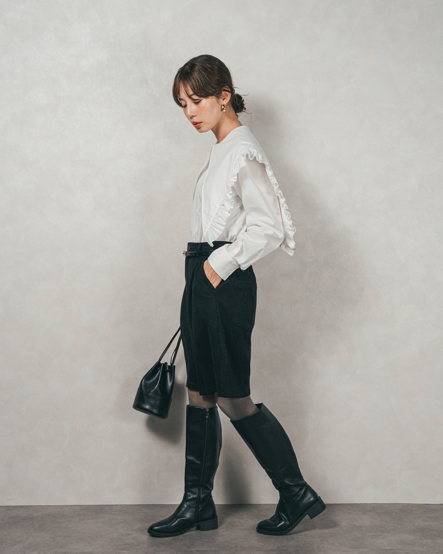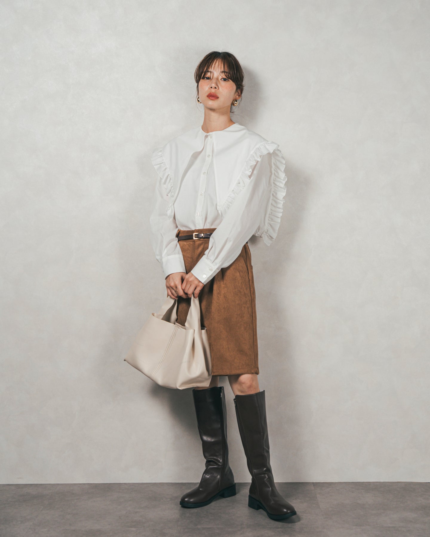 なんといってもロングブーツスタイルがかわいい◎ 肌の露出を抑えつつ、トレンド感のある「レディライク」な着こなしに。トップスはゆったりとしたニットをインして、メリハリのあるシルエットを作るのがスタイルアップの秘訣。