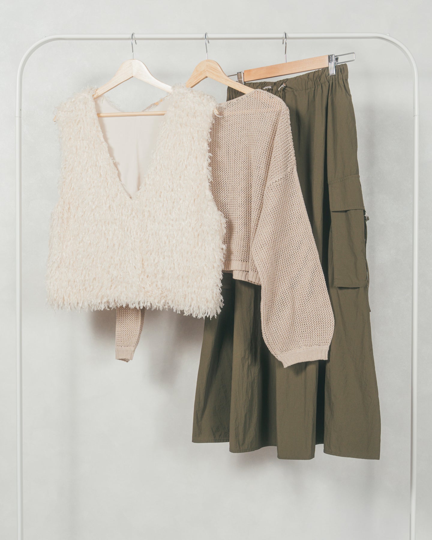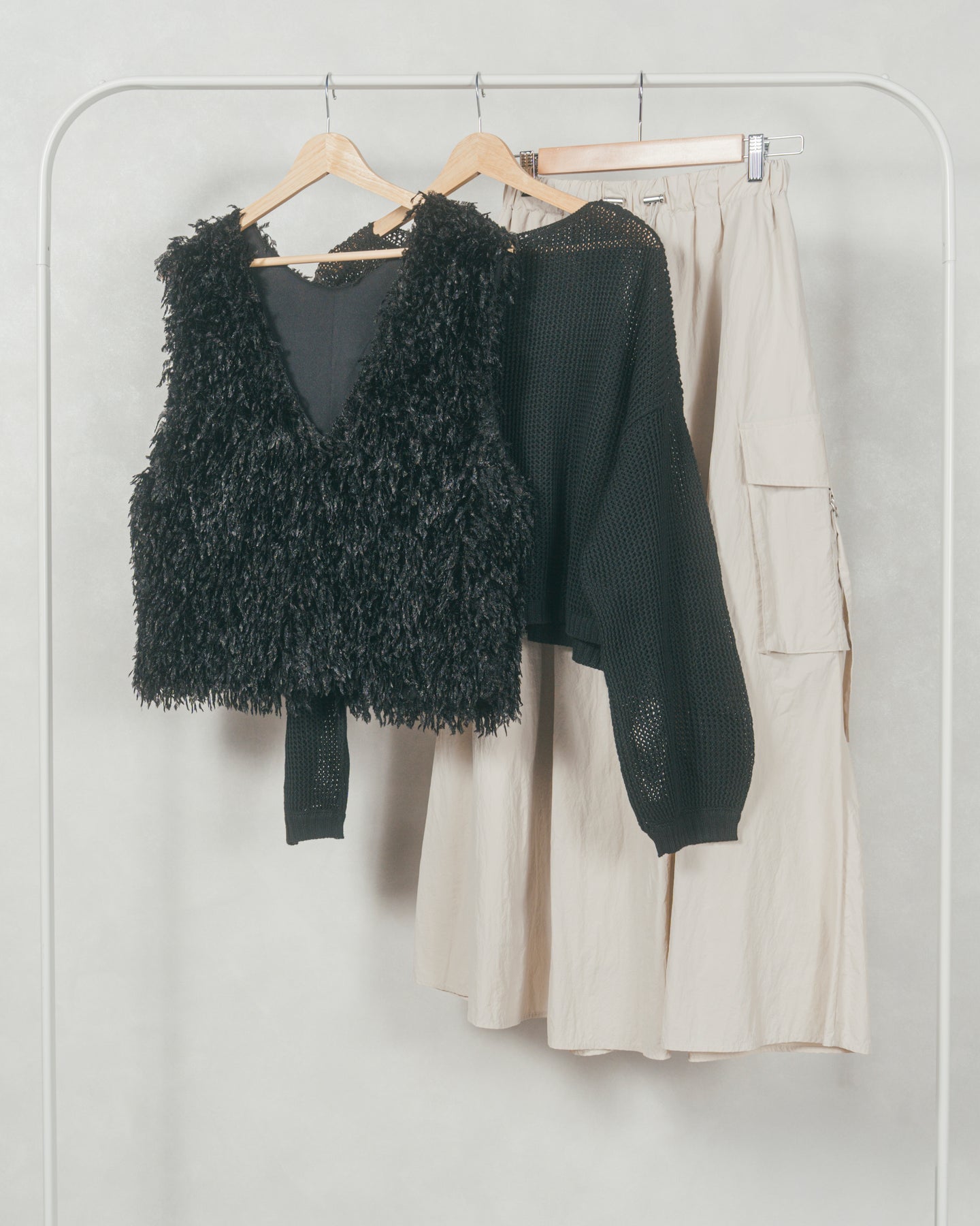 【着回し3枚セット】[SET]2-Way フリンジベスト+クロップドメッシュニット+ドローストリングナイロンカーゴスカート(3SET)