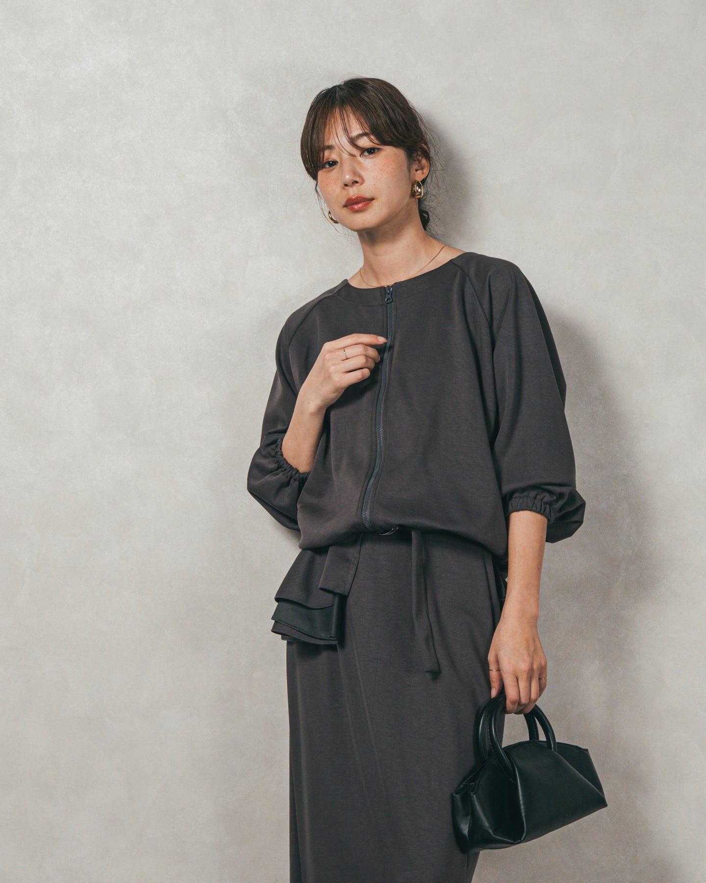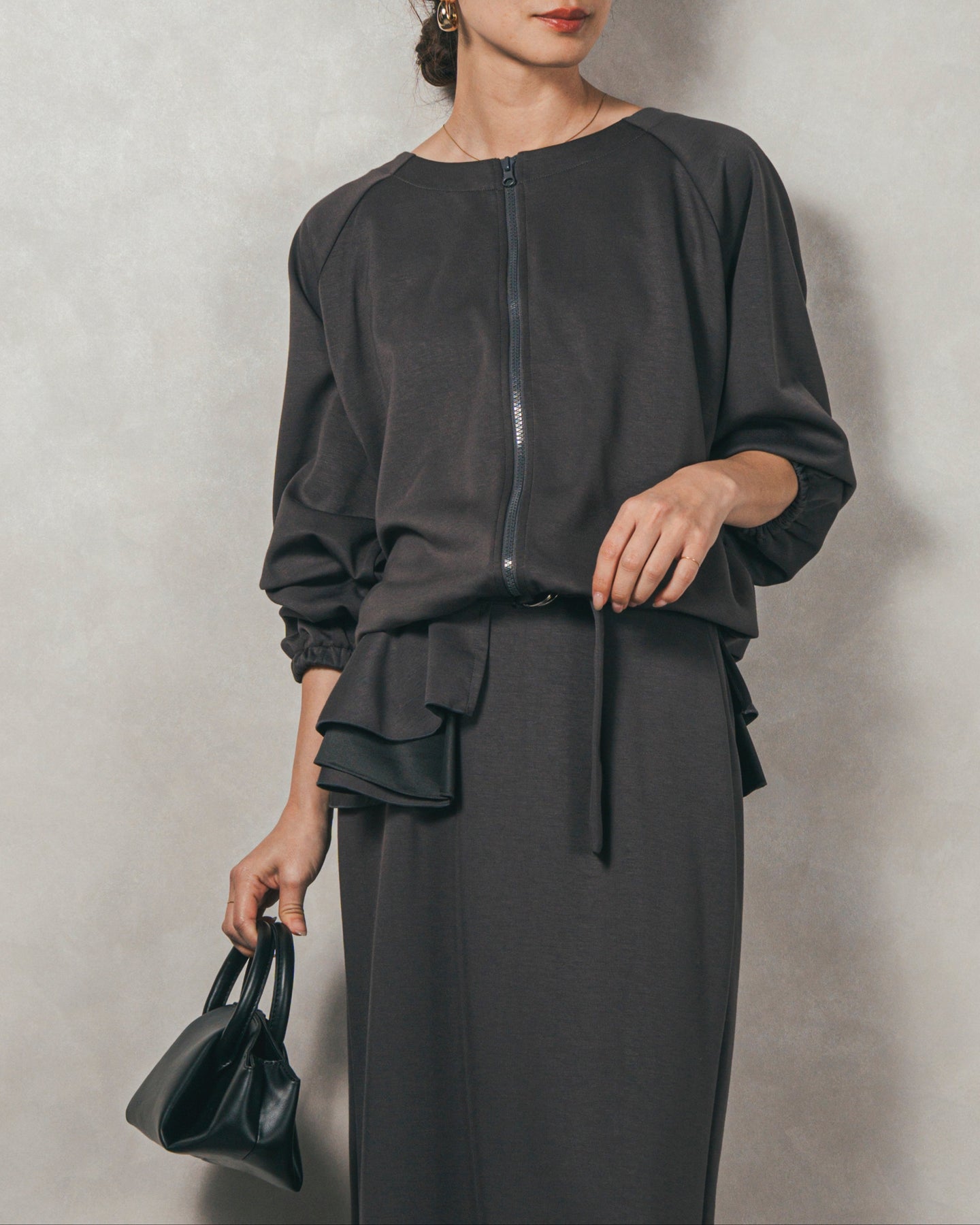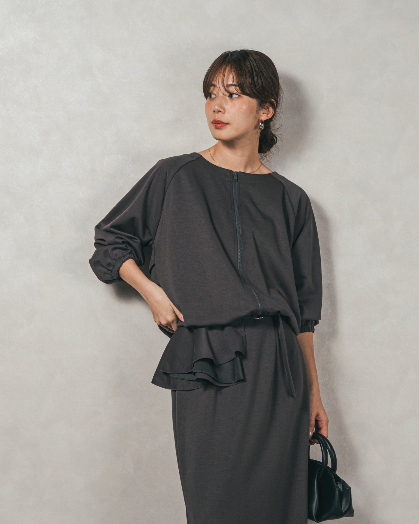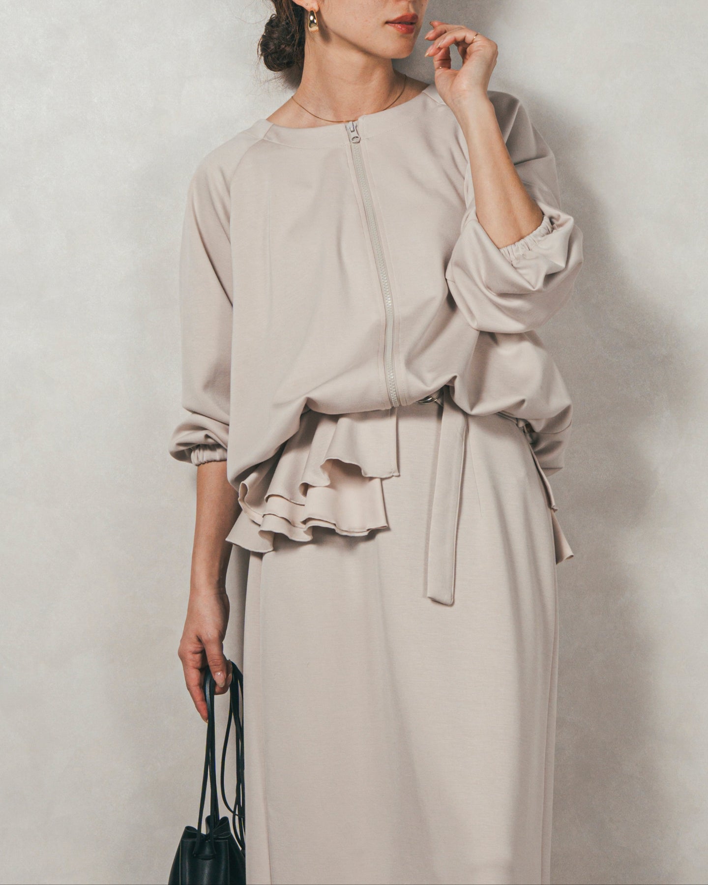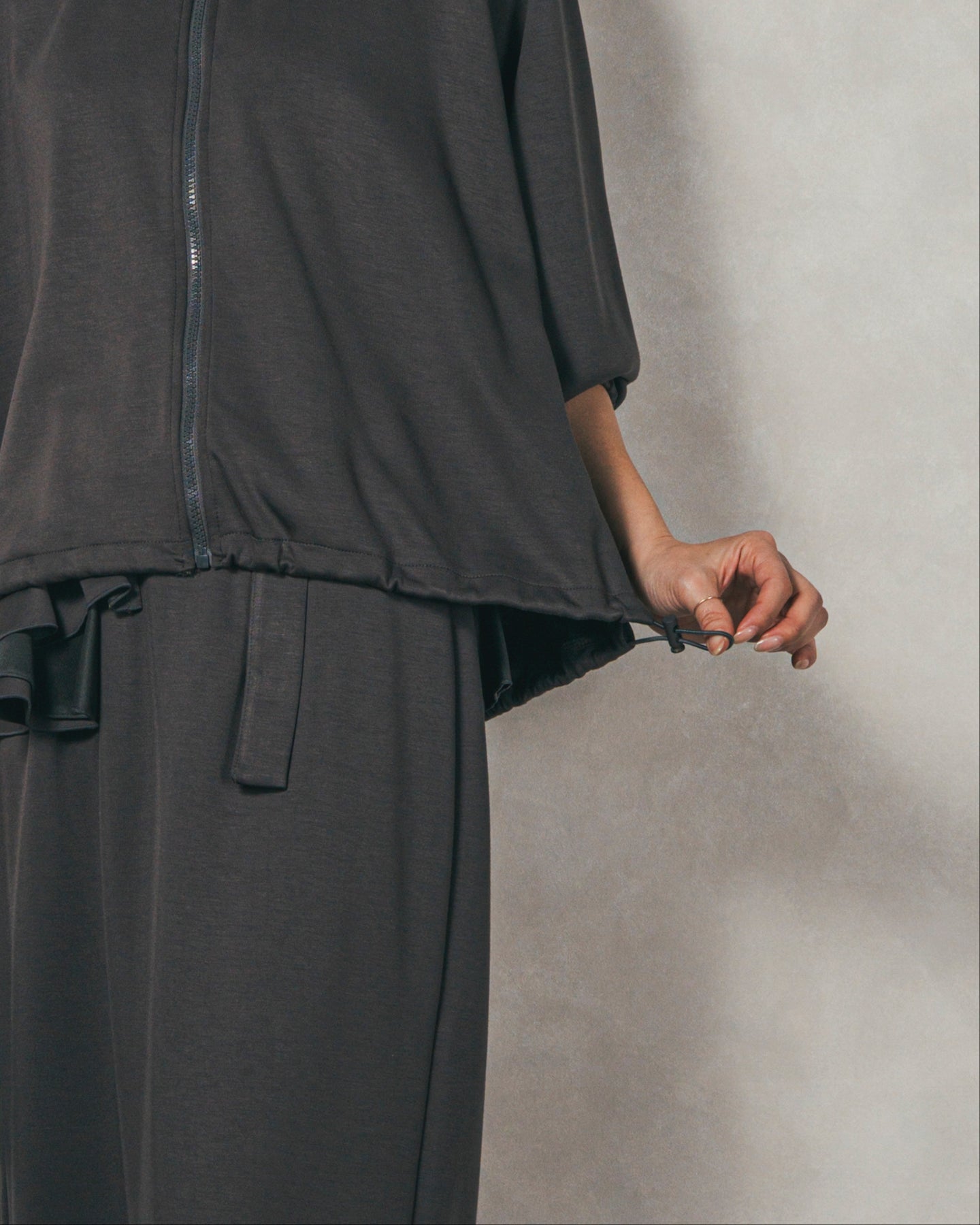 背中にあしらったフリルディテールが、シンプルなシルエットにさりげない華やかさを添えるライトポンチZIPブルゾン。ほどよい落ち感のあるポンチ素材は、柔らかさときちんと感を兼ね備え、デイリーからオフィスまで活躍します。フロントはすっきりとしたジップ仕様で着脱もスムーズ。後ろ姿に動きを生むフリルは、大人の遊び心を感じさせつつ、気になる腰回りをさりげなくカバーしてくれるのも嬉しいポイント。