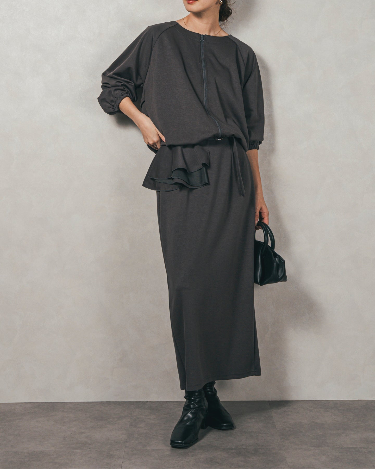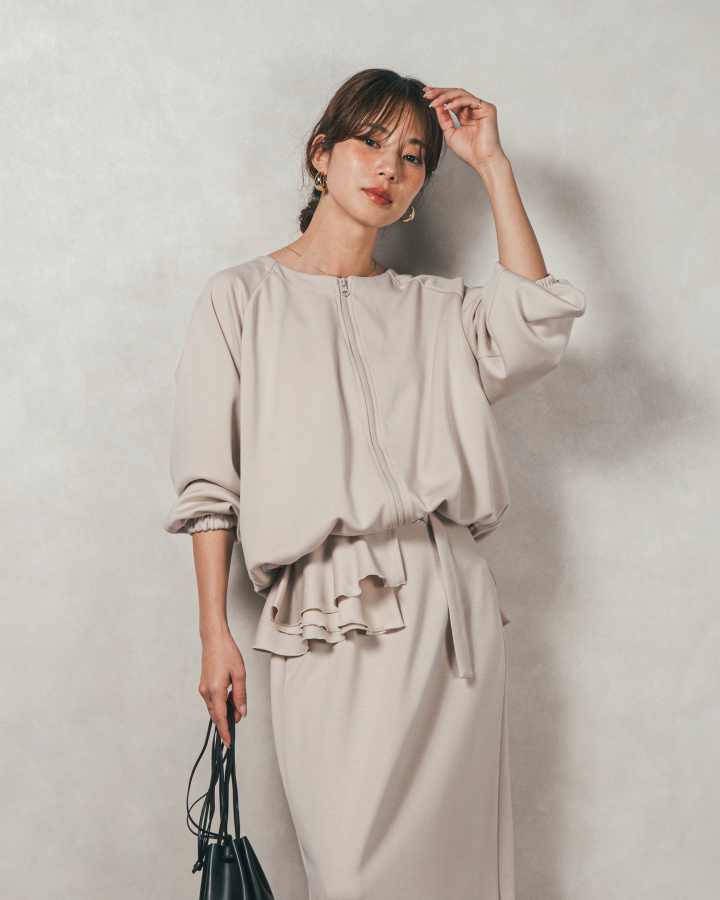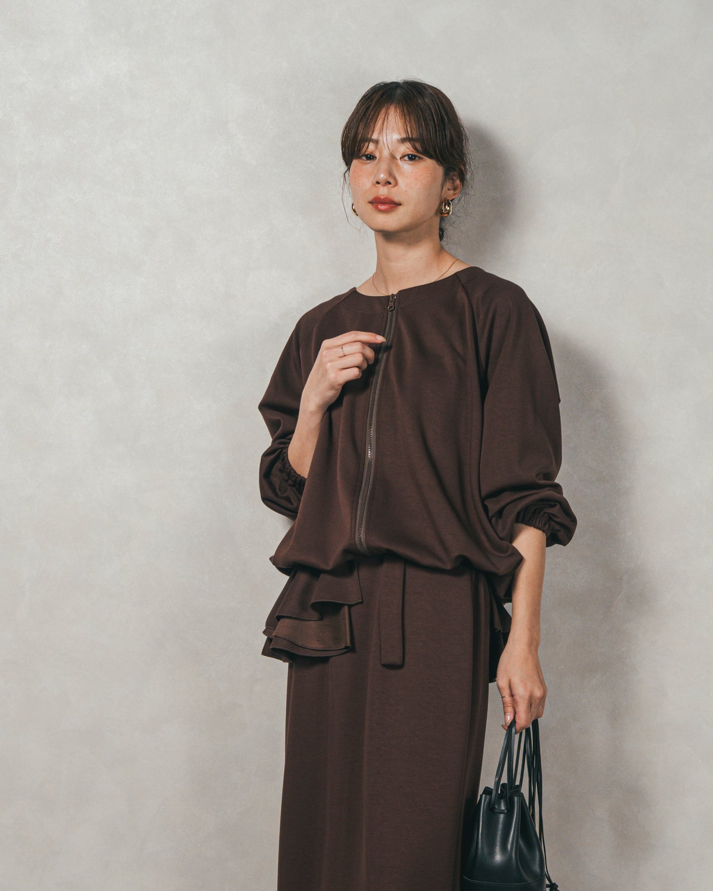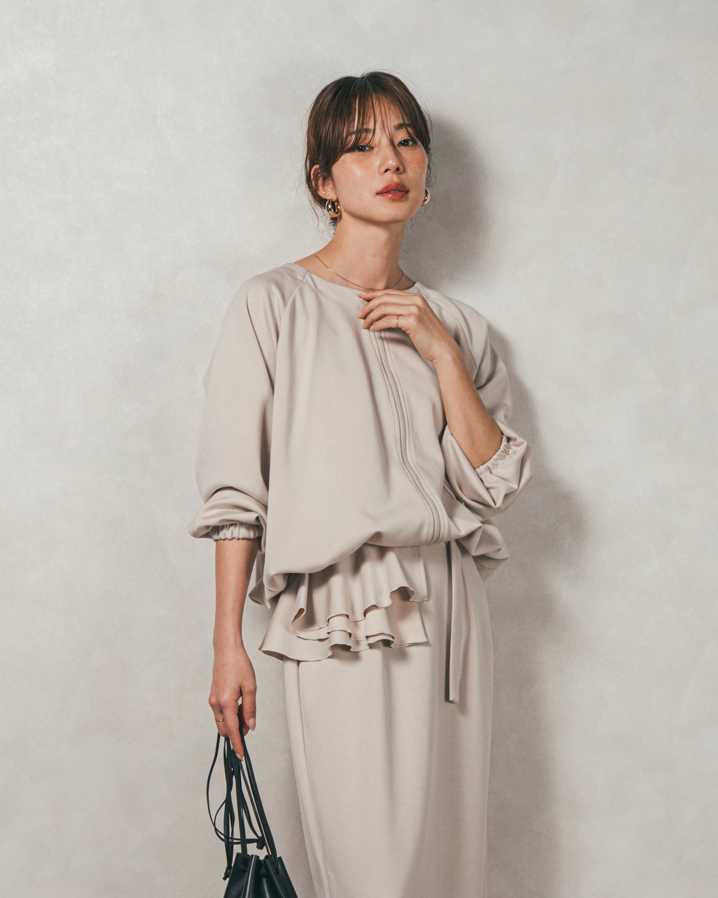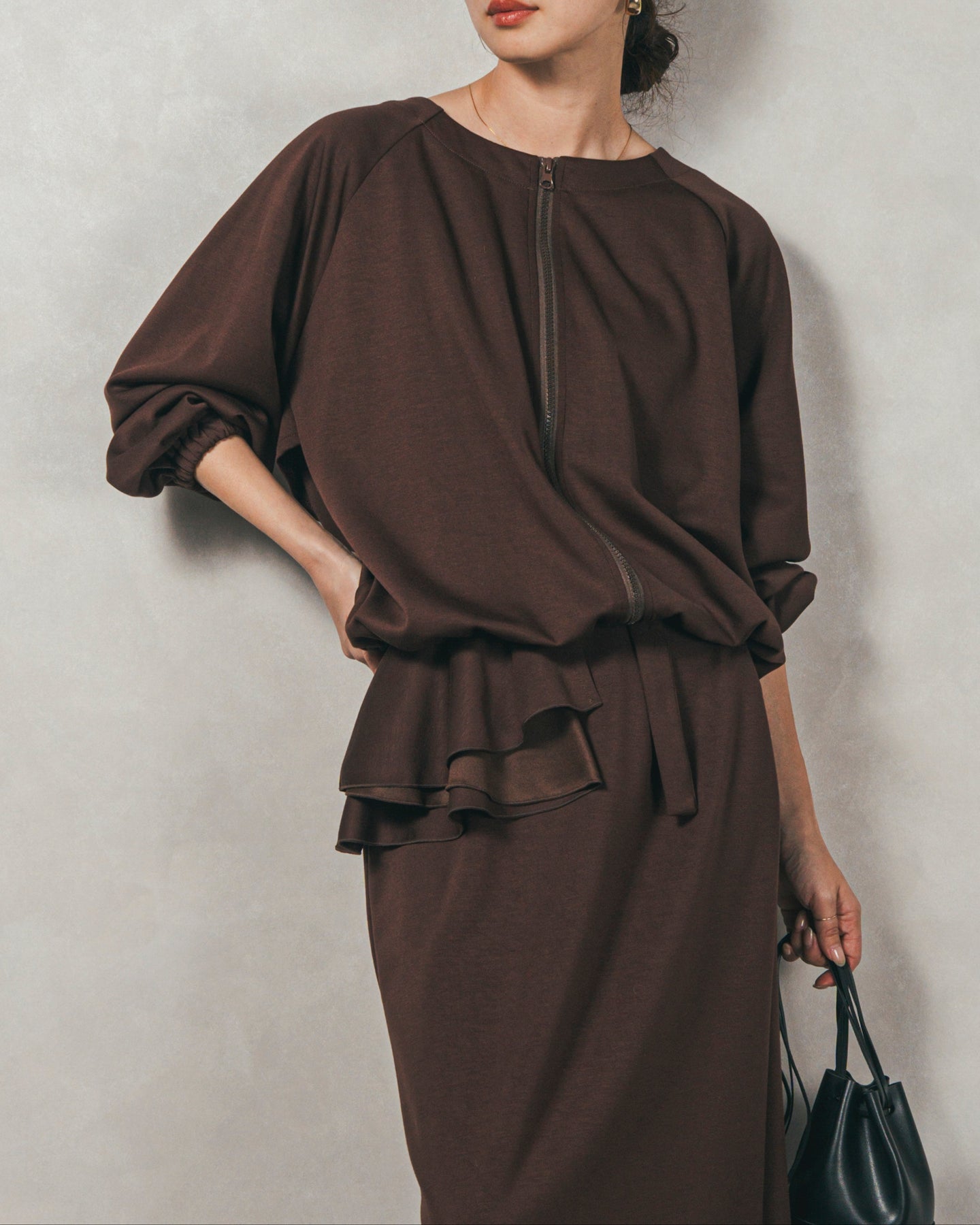 背中にあしらったフリルディテールが、シンプルなシルエットにさりげない華やかさを添えるライトポンチZIPブルゾン。ほどよい落ち感のあるポンチ素材は、柔らかさときちんと感を兼ね備え、デイリーからオフィスまで活躍します。フロントはすっきりとしたジップ仕様で着脱もスムーズ。後ろ姿に動きを生むフリルは、大人の遊び心を感じさせつつ、気になる腰回りをさりげなくカバーしてくれるのも嬉しいポイント。