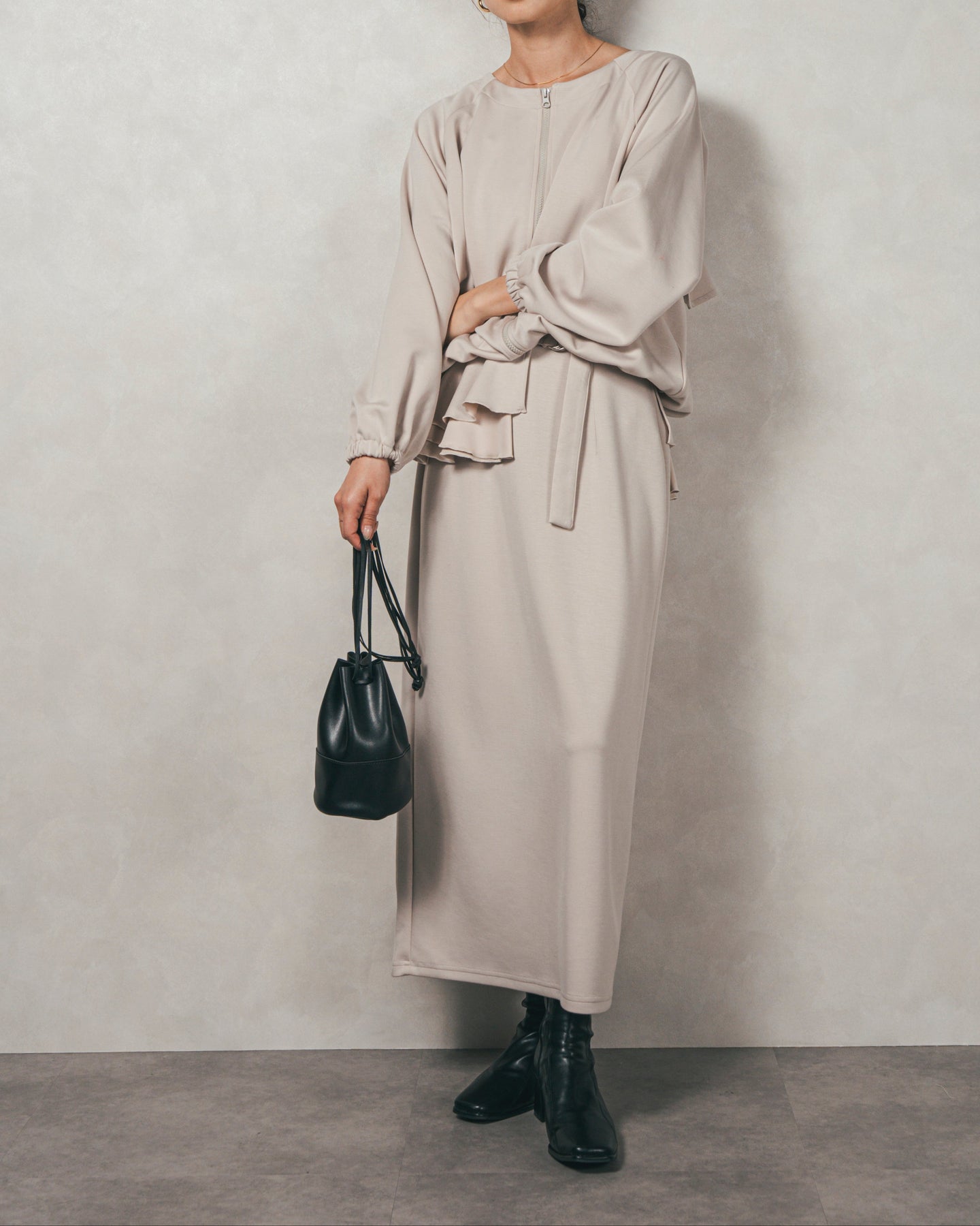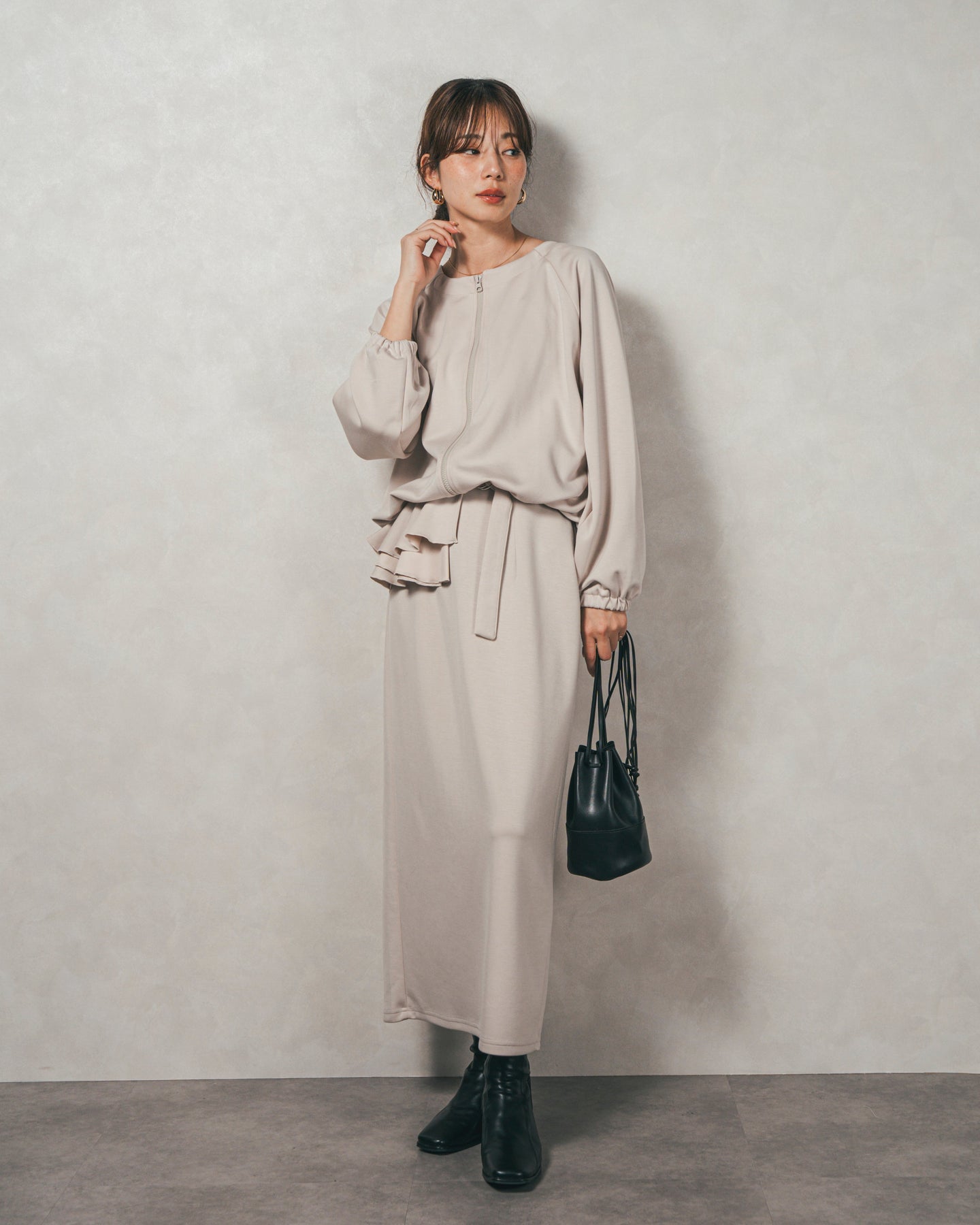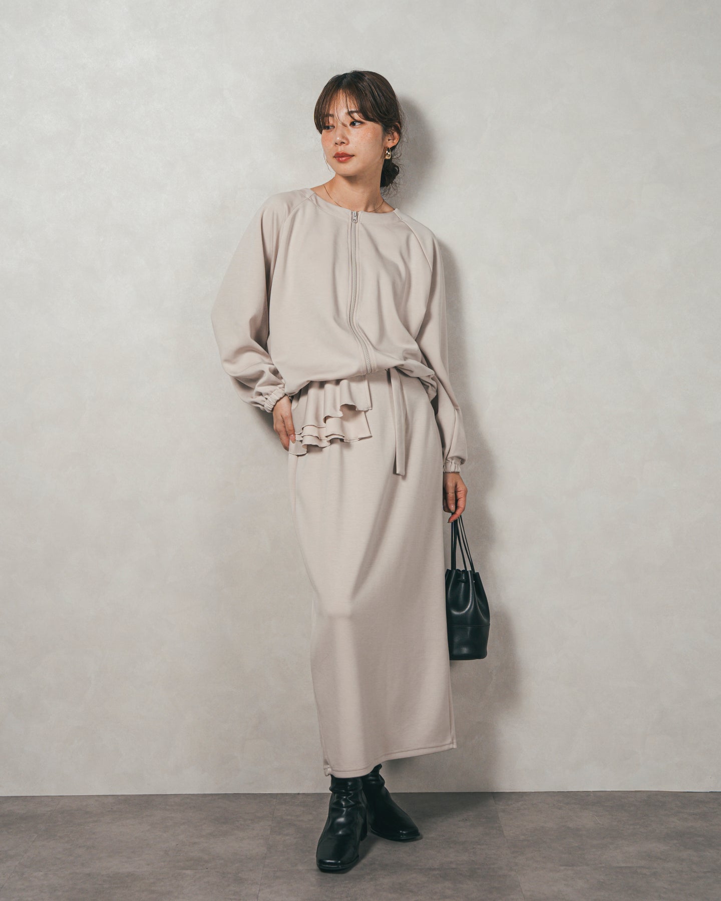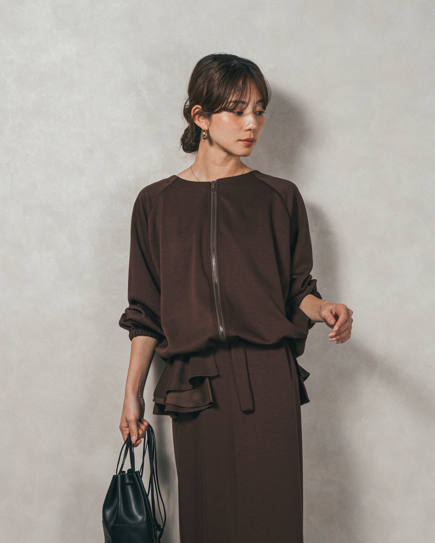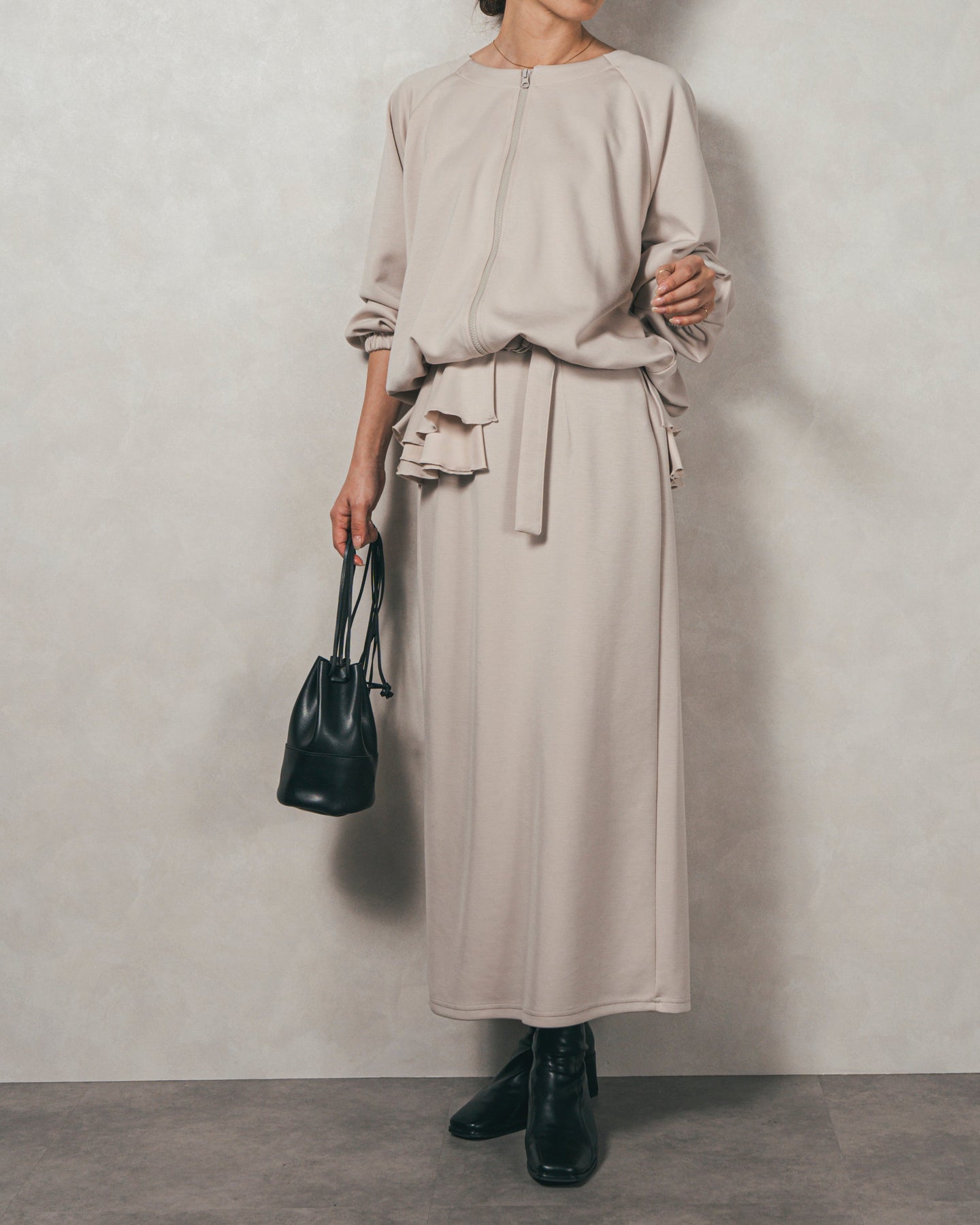 背中にあしらったフリルディテールが、シンプルなシルエットにさりげない華やかさを添えるライトポンチZIPブルゾン。ほどよい落ち感のあるポンチ素材は、柔らかさときちんと感を兼ね備え、デイリーからオフィスまで活躍します。フロントはすっきりとしたジップ仕様で着脱もスムーズ。後ろ姿に動きを生むフリルは、大人の遊び心を感じさせつつ、気になる腰回りをさりげなくカバーしてくれるのも嬉しいポイント。