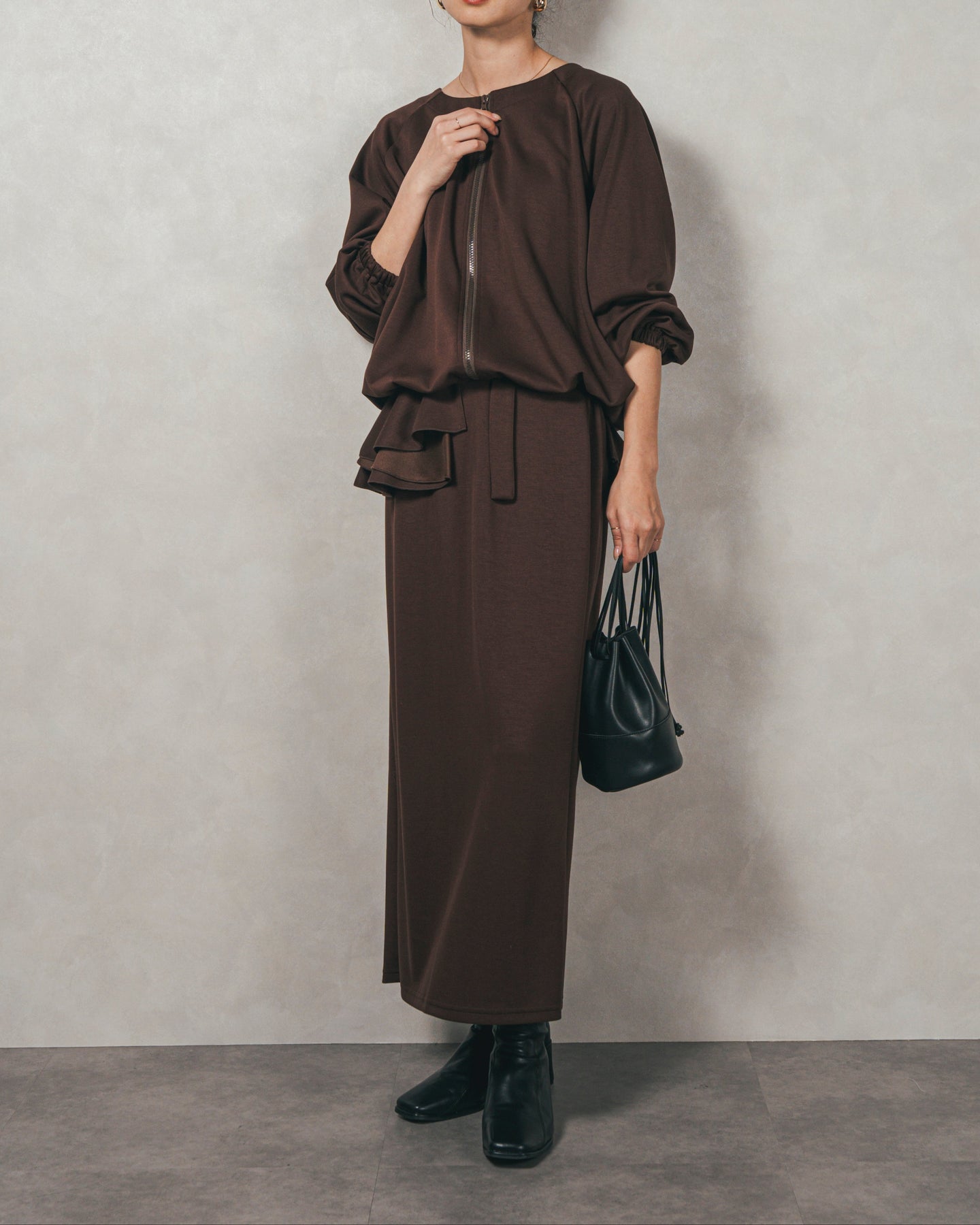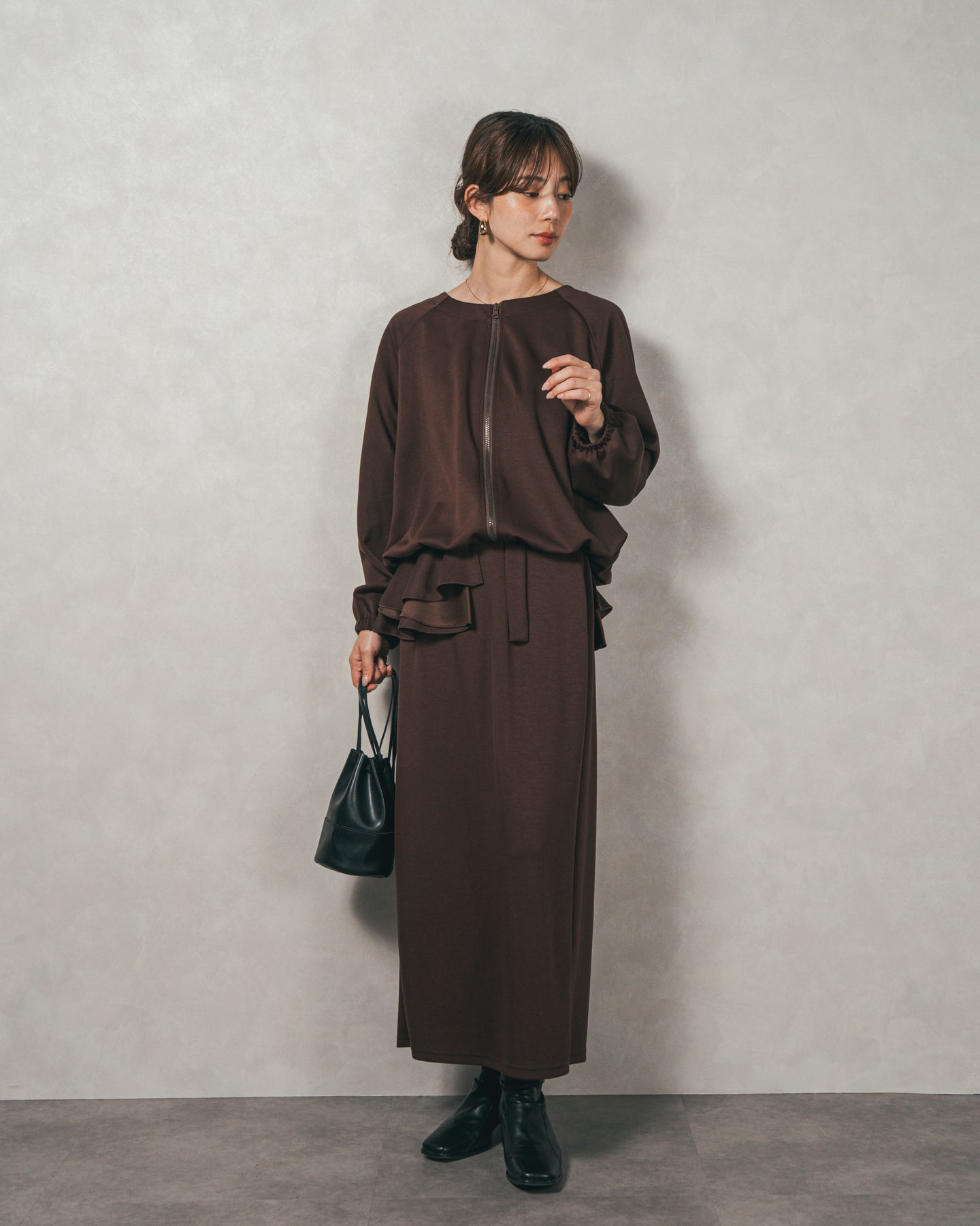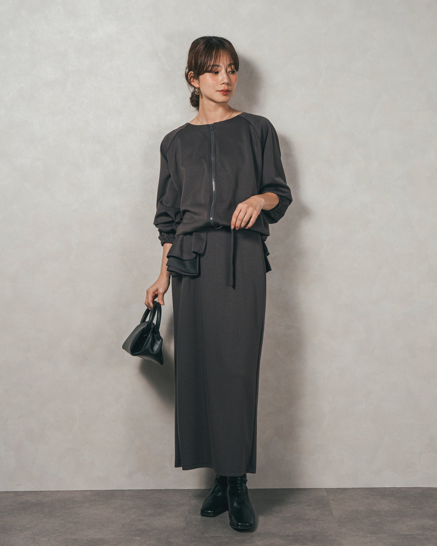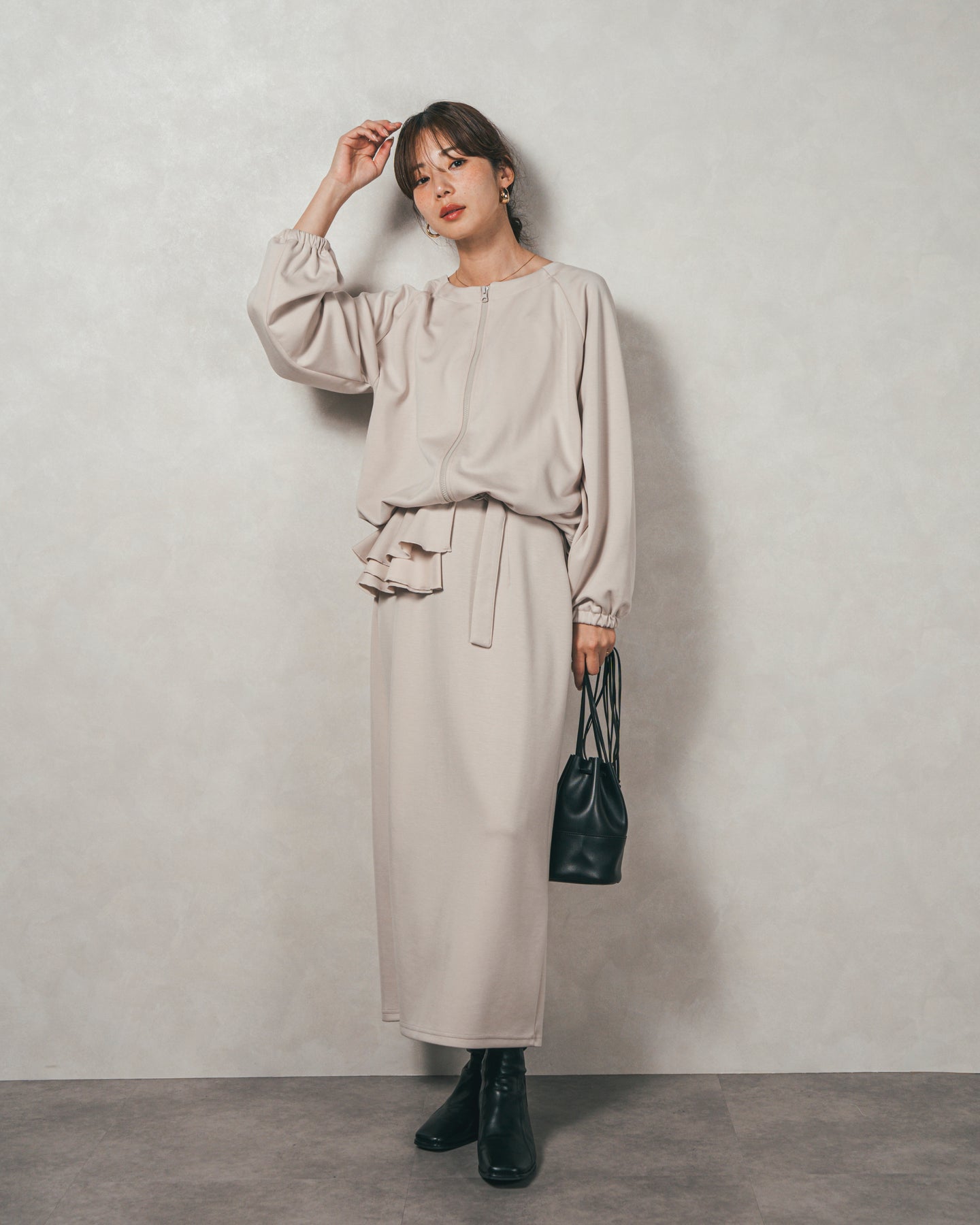 背中にあしらったフリルディテールが、シンプルなシルエットにさりげない華やかさを添えるライトポンチZIPブルゾン。ほどよい落ち感のあるポンチ素材は、柔らかさときちんと感を兼ね備え、デイリーからオフィスまで活躍します。フロントはすっきりとしたジップ仕様で着脱もスムーズ。後ろ姿に動きを生むフリルは、大人の遊び心を感じさせつつ、気になる腰回りをさりげなくカバーしてくれるのも嬉しいポイント。