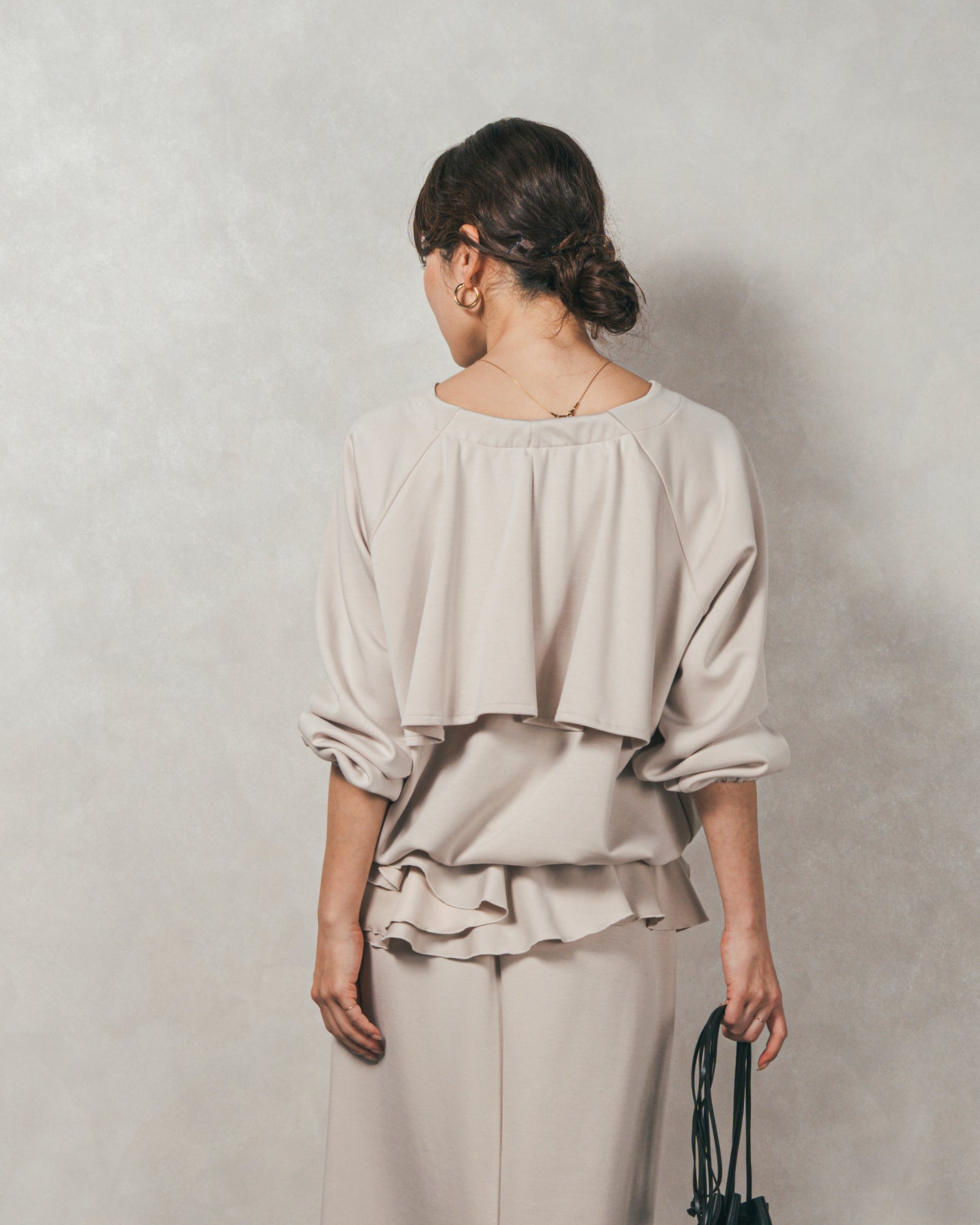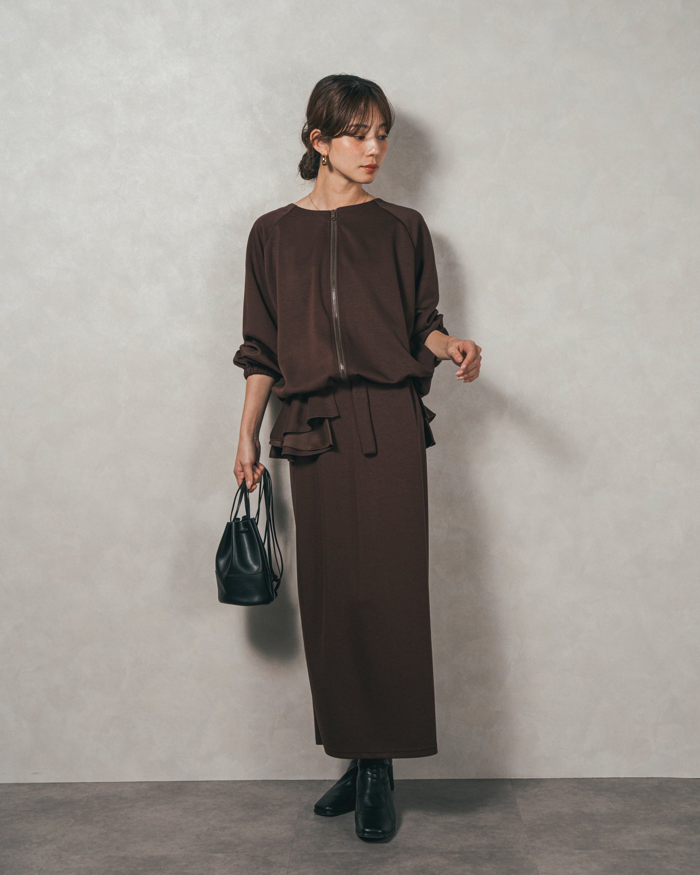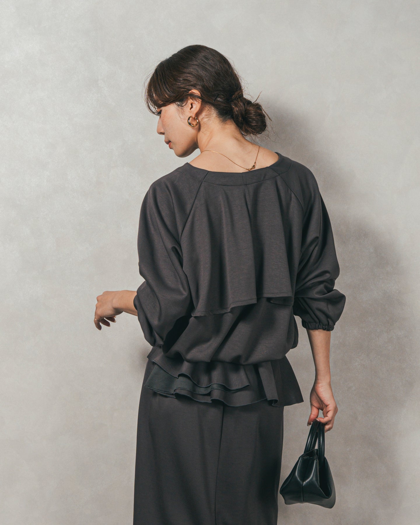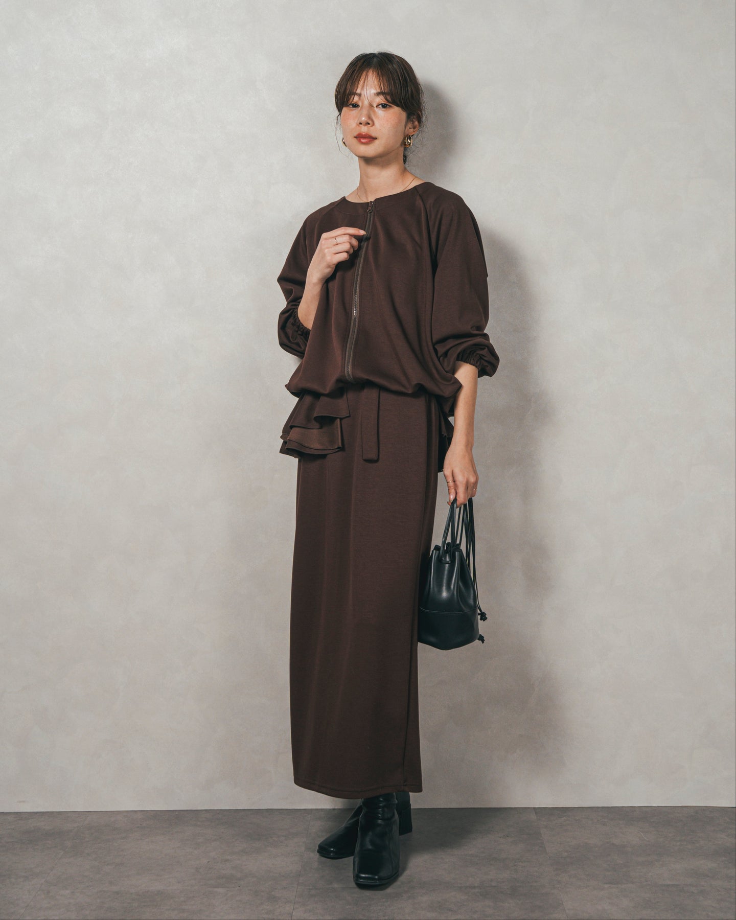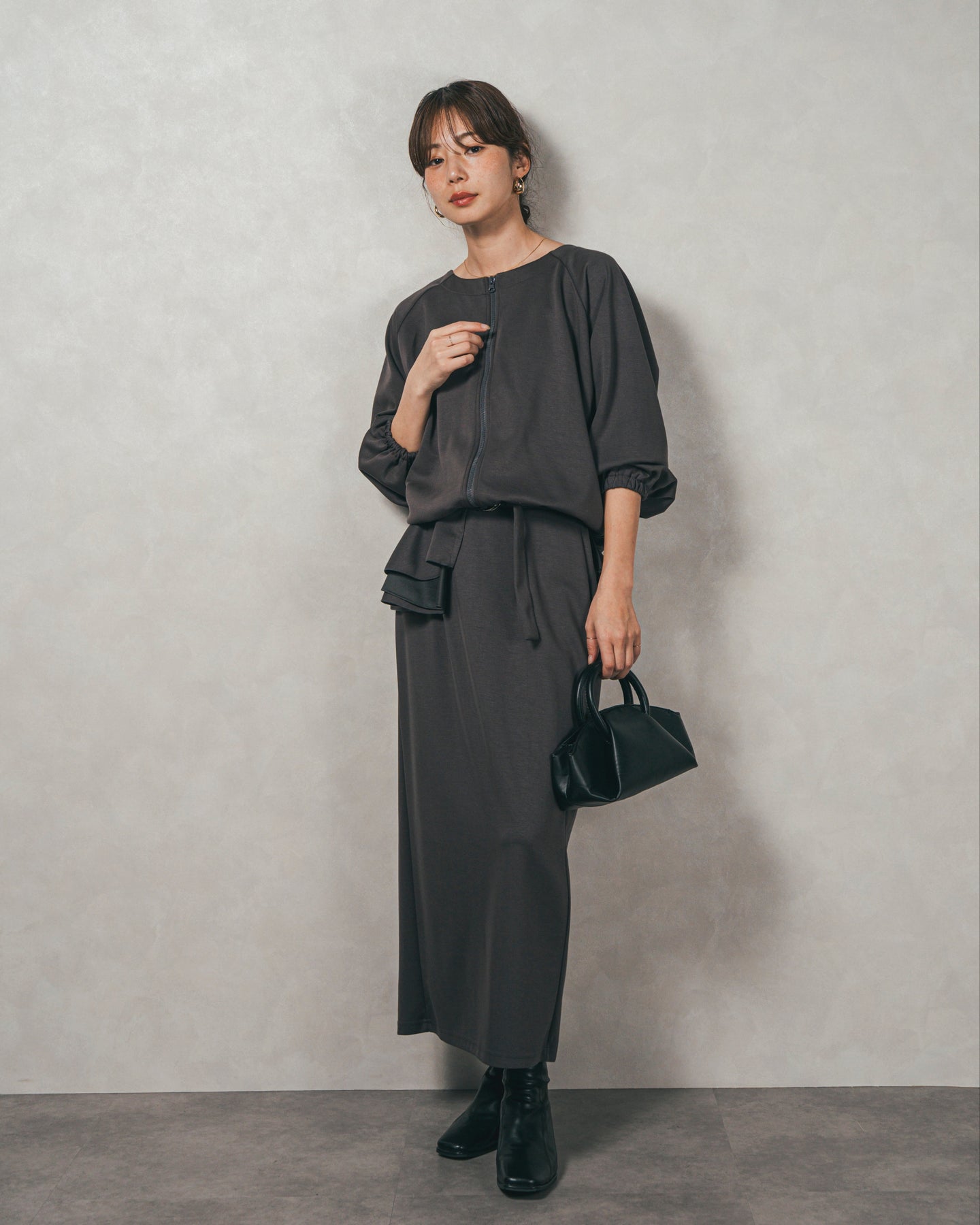 背中にあしらったフリルディテールが、シンプルなシルエットにさりげない華やかさを添えるライトポンチZIPブルゾン。ほどよい落ち感のあるポンチ素材は、柔らかさときちんと感を兼ね備え、デイリーからオフィスまで活躍します。フロントはすっきりとしたジップ仕様で着脱もスムーズ。後ろ姿に動きを生むフリルは、大人の遊び心を感じさせつつ、気になる腰回りをさりげなくカバーしてくれるのも嬉しいポイント。