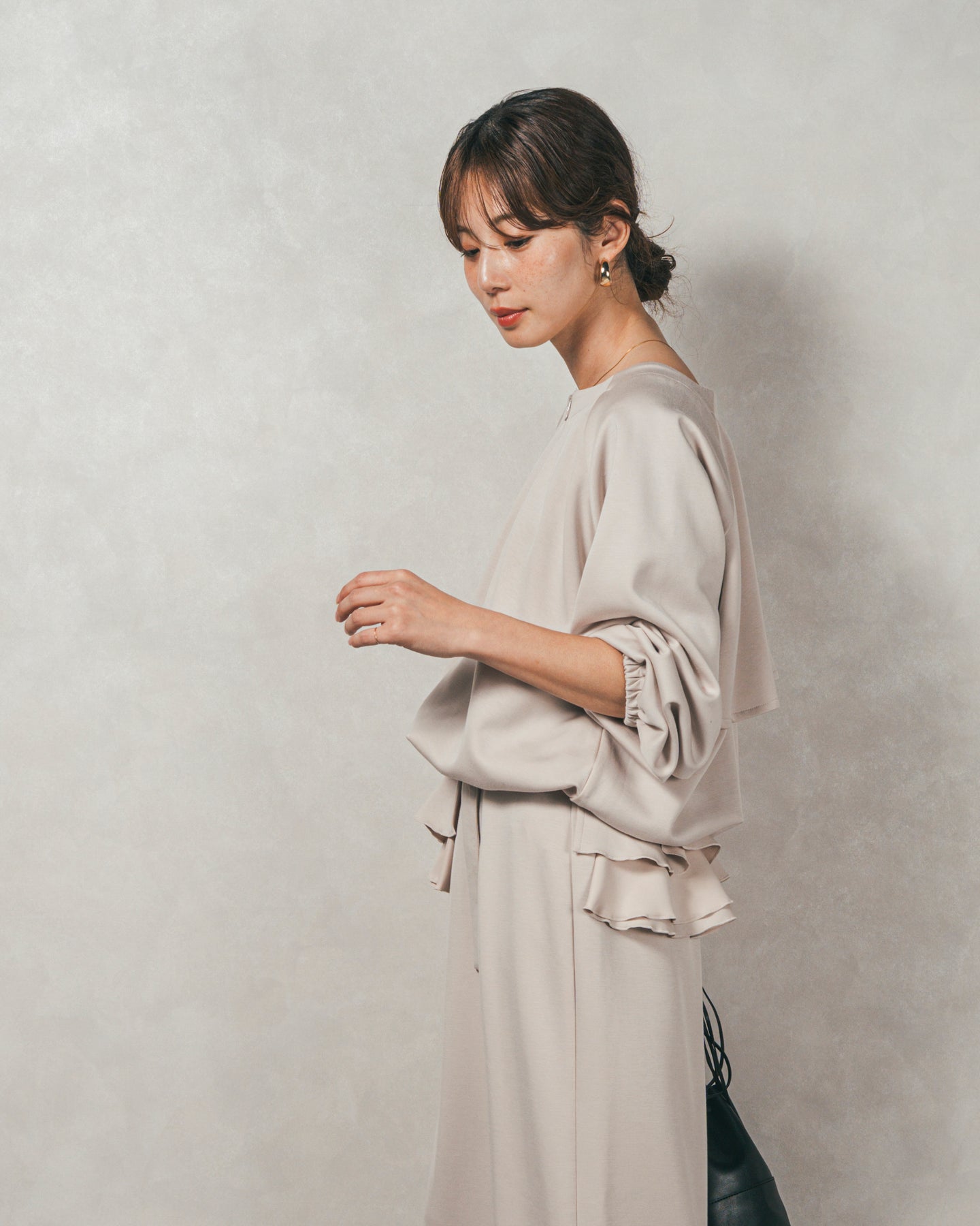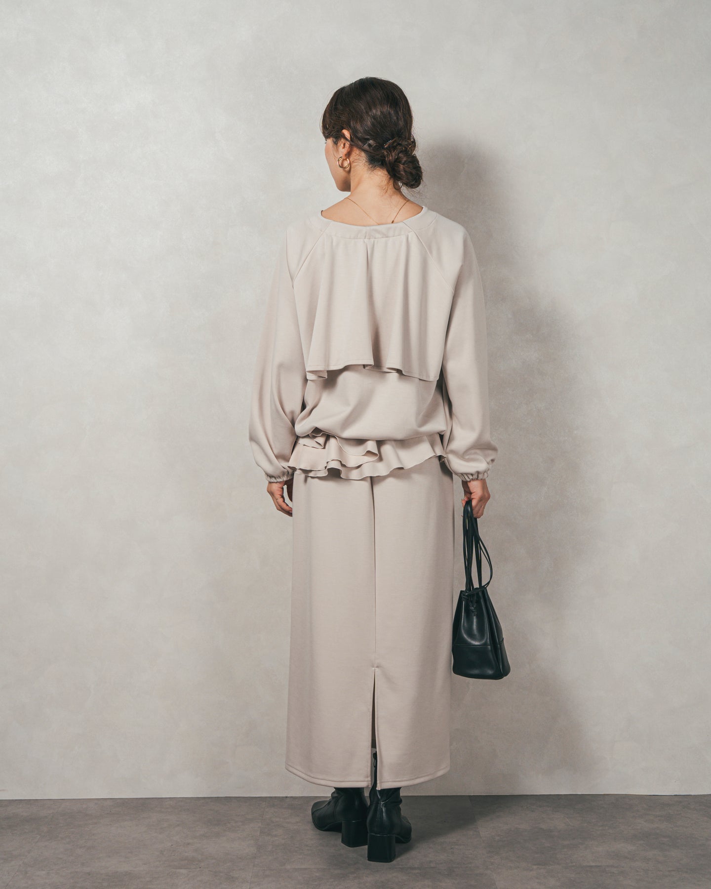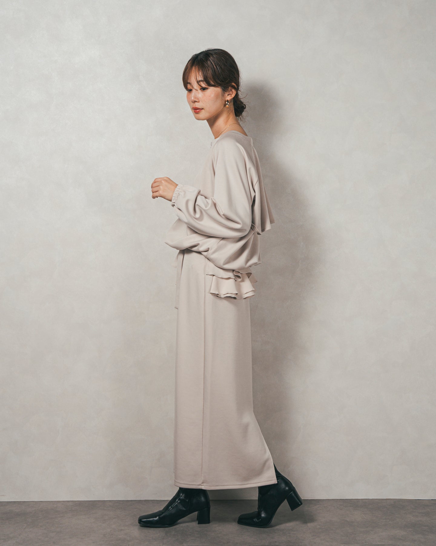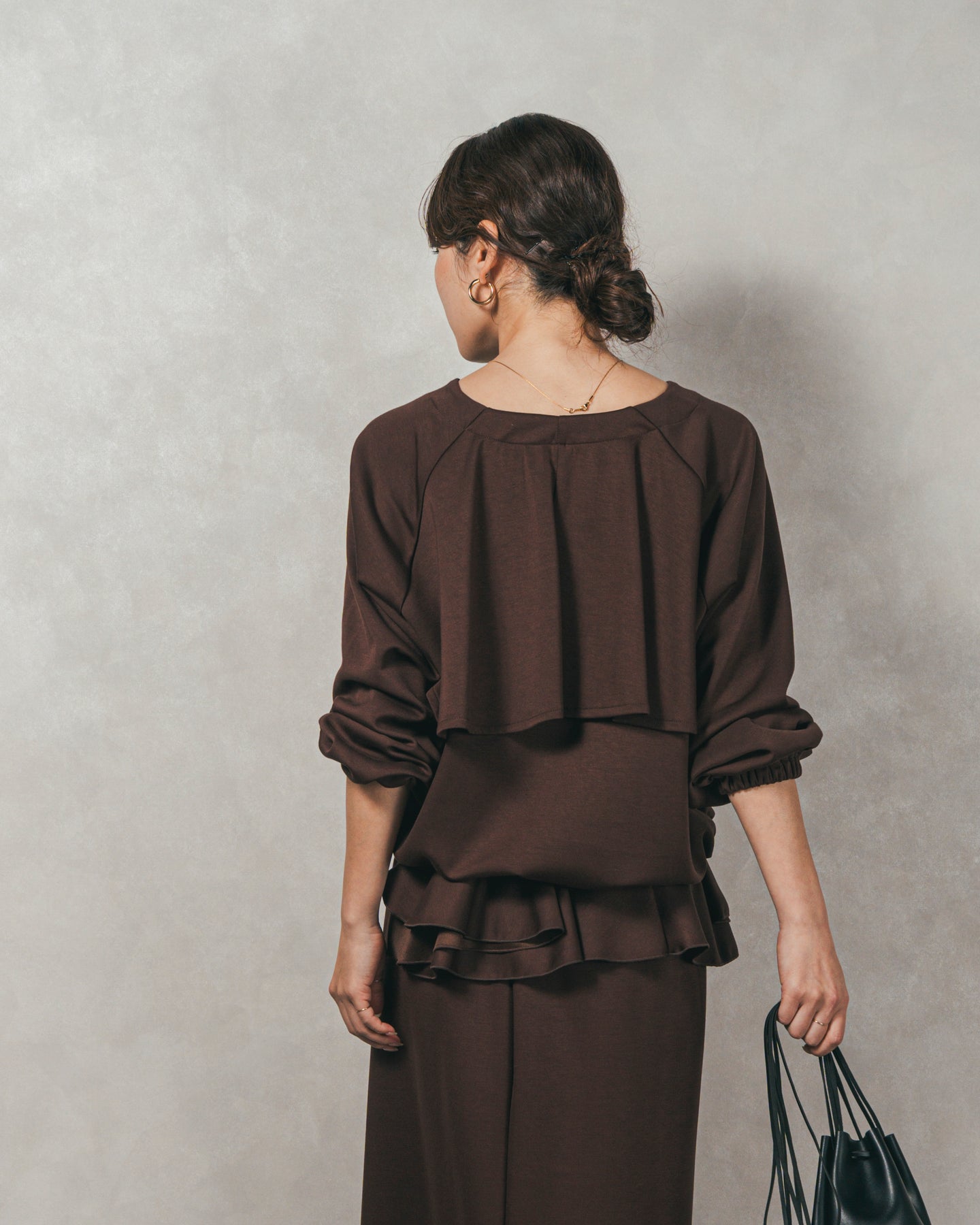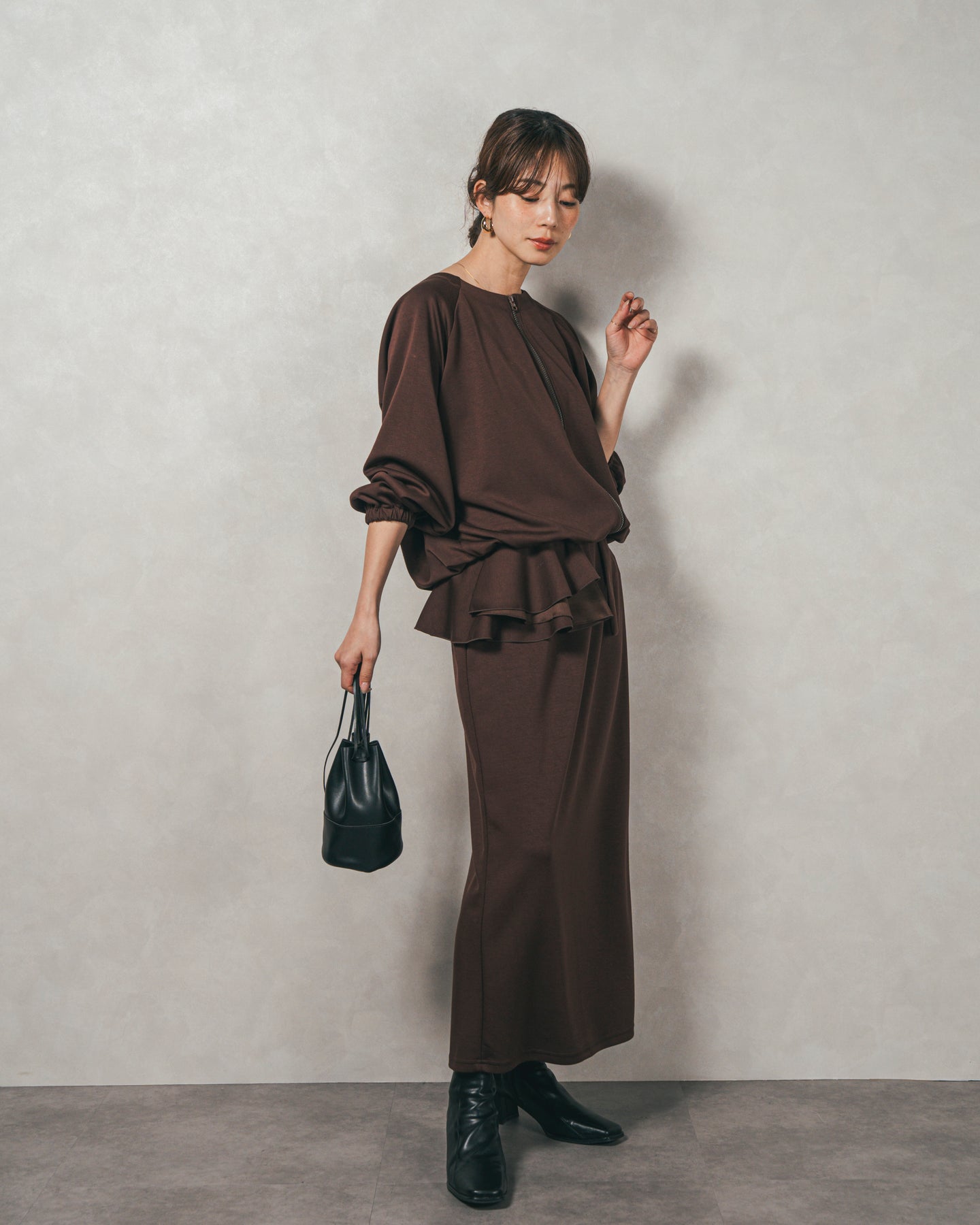 背中にあしらったフリルディテールが、シンプルなシルエットにさりげない華やかさを添えるライトポンチZIPブルゾン。ほどよい落ち感のあるポンチ素材は、柔らかさときちんと感を兼ね備え、デイリーからオフィスまで活躍します。フロントはすっきりとしたジップ仕様で着脱もスムーズ。後ろ姿に動きを生むフリルは、大人の遊び心を感じさせつつ、気になる腰回りをさりげなくカバーしてくれるのも嬉しいポイント。
