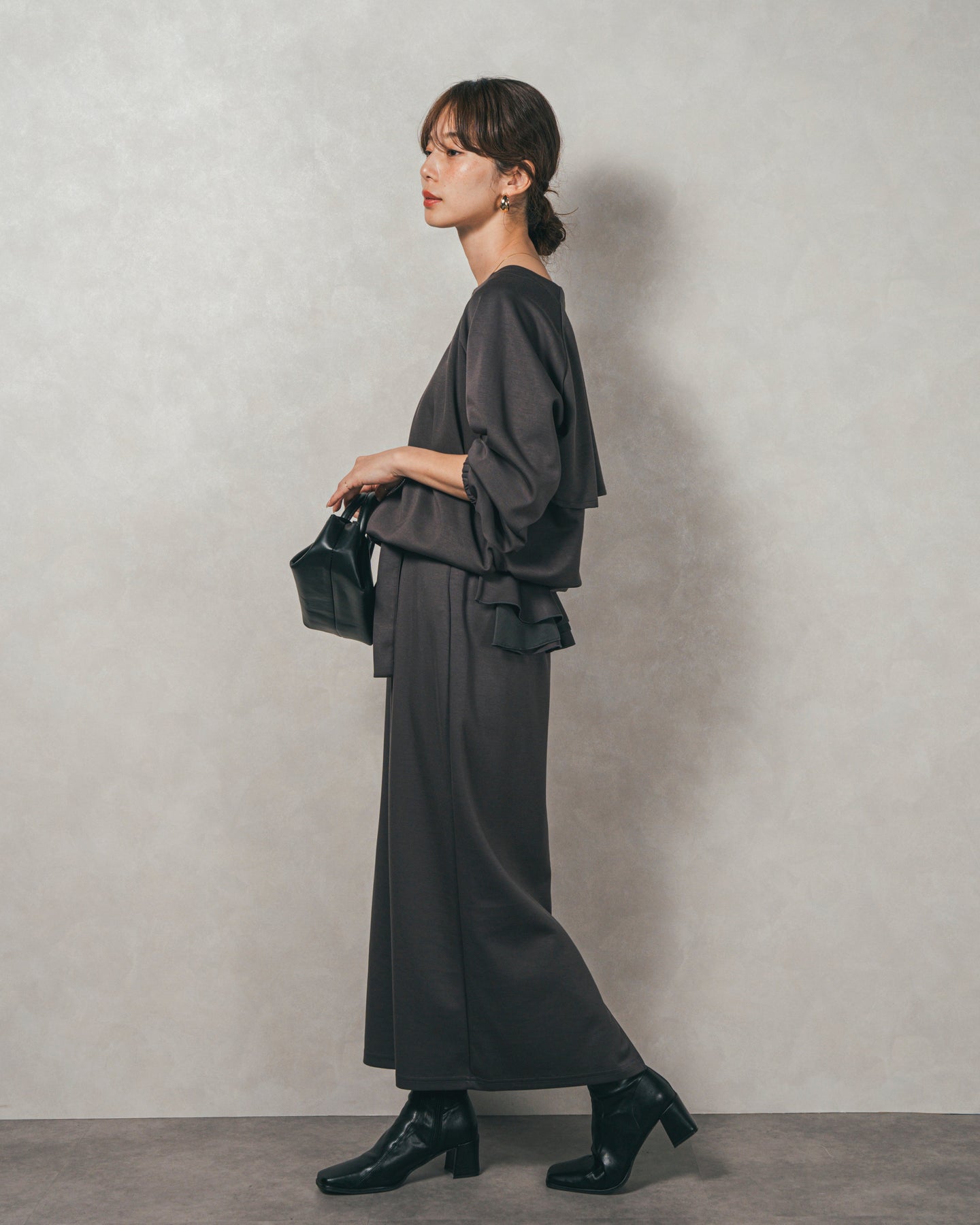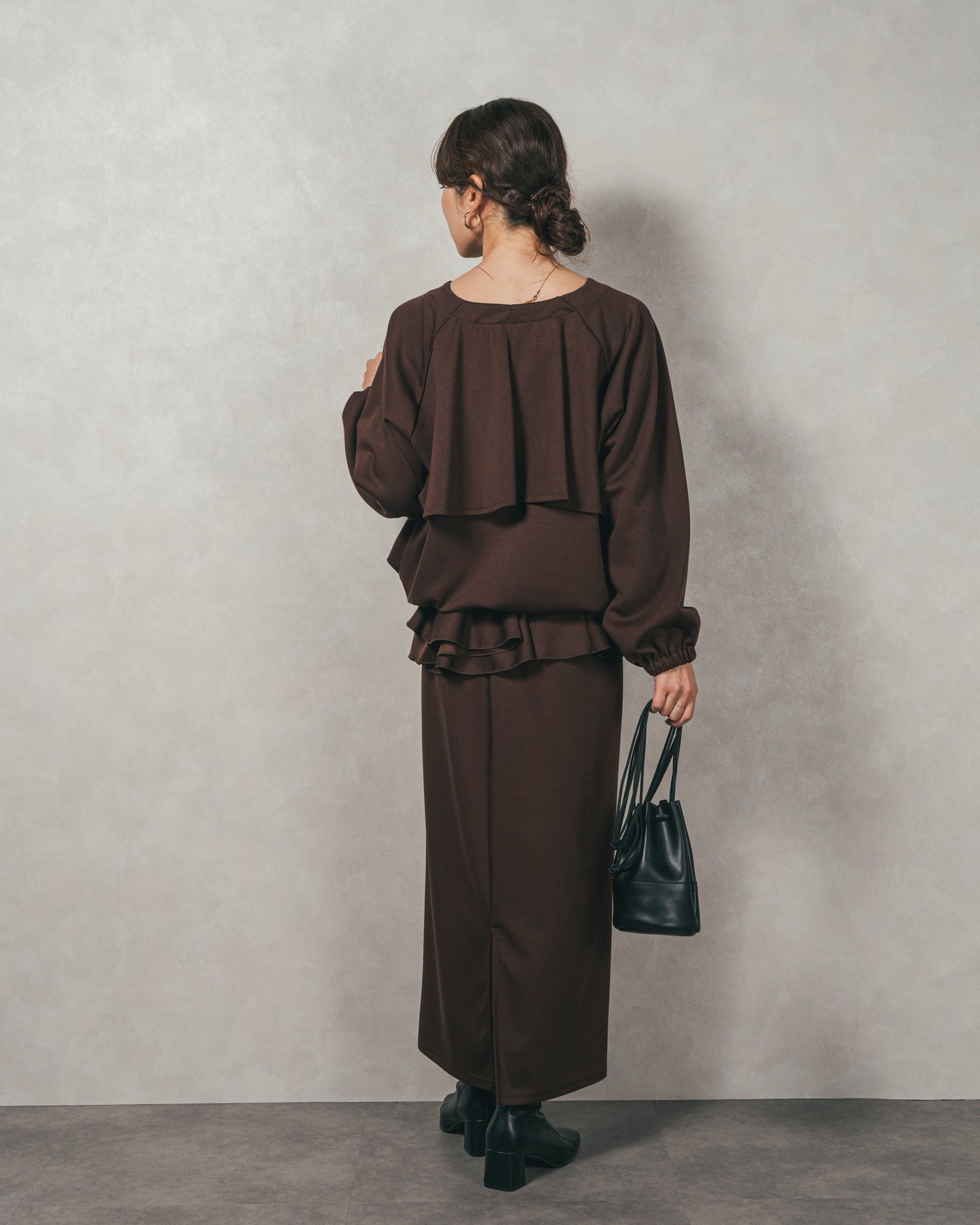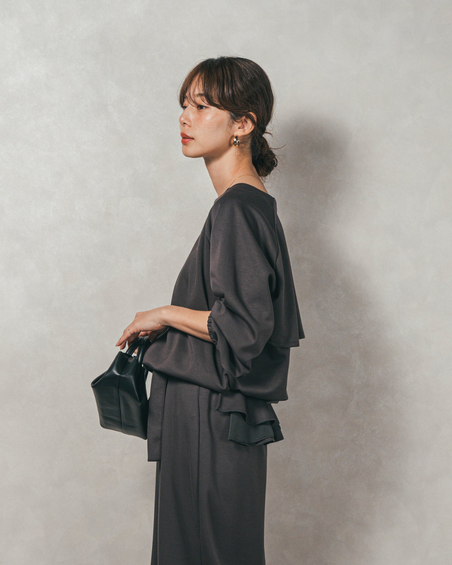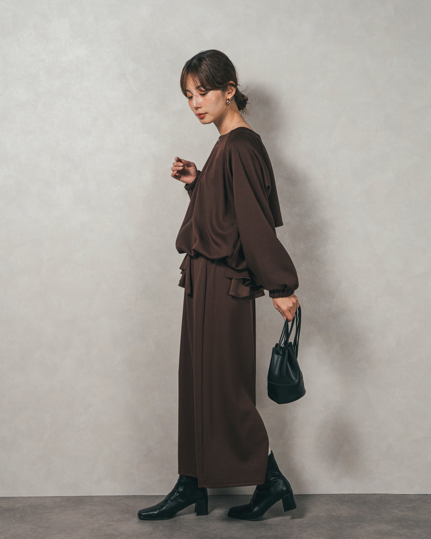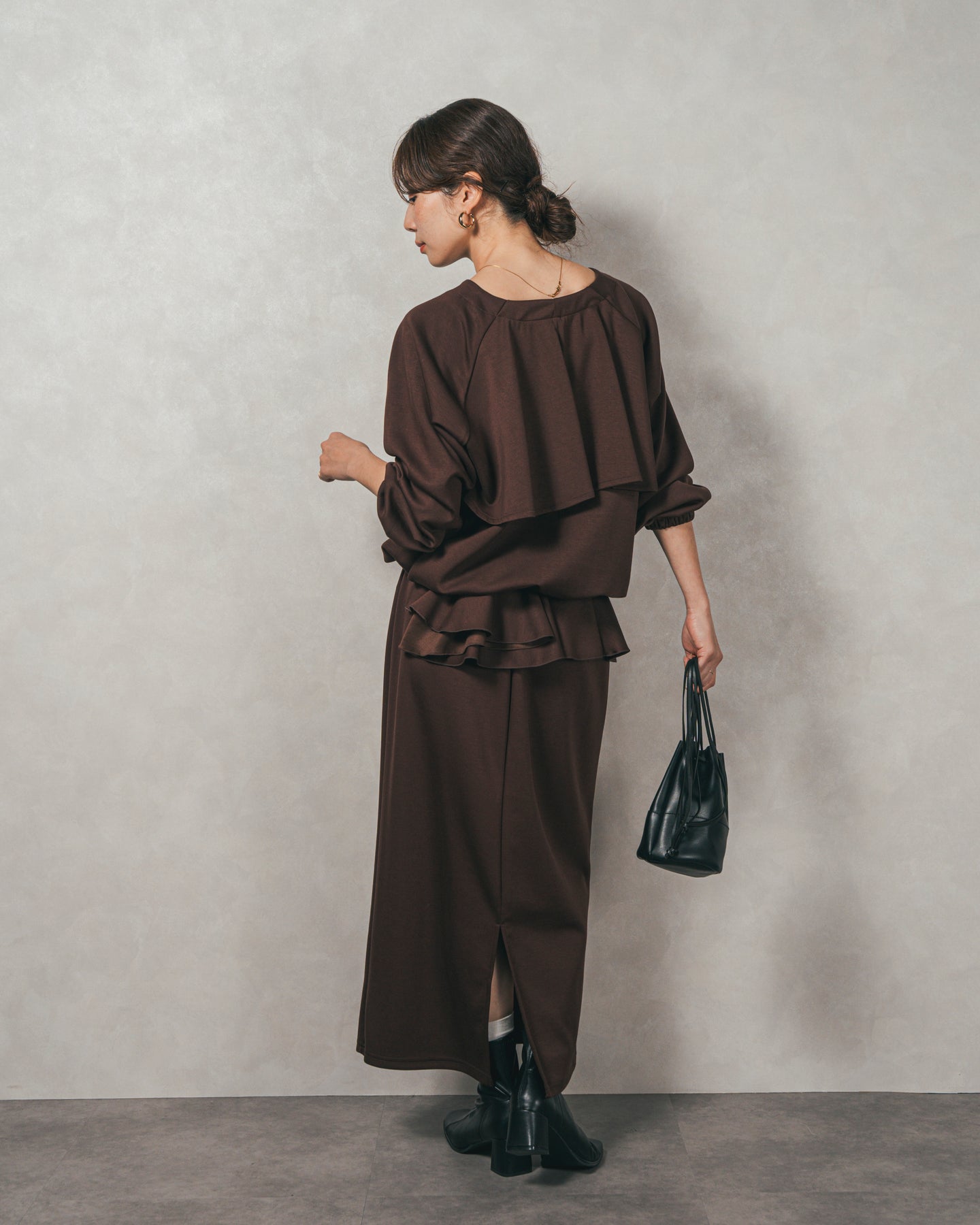 背中にあしらったフリルディテールが、シンプルなシルエットにさりげない華やかさを添えるライトポンチZIPブルゾン。ほどよい落ち感のあるポンチ素材は、柔らかさときちんと感を兼ね備え、デイリーからオフィスまで活躍します。フロントはすっきりとしたジップ仕様で着脱もスムーズ。後ろ姿に動きを生むフリルは、大人の遊び心を感じさせつつ、気になる腰回りをさりげなくカバーしてくれるのも嬉しいポイント。